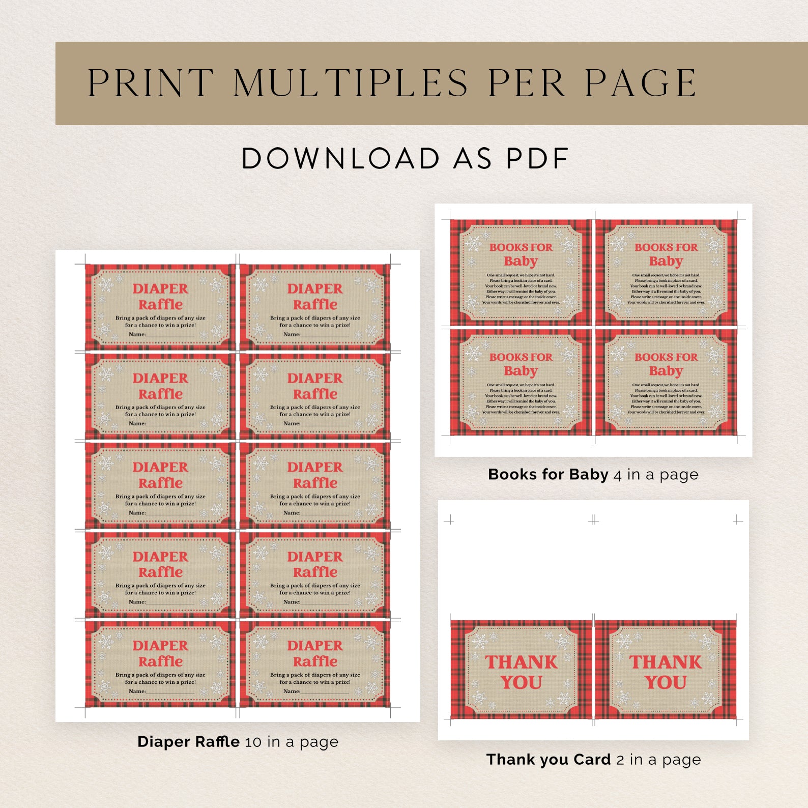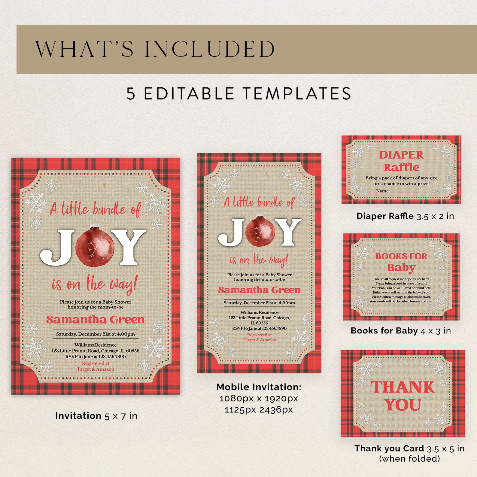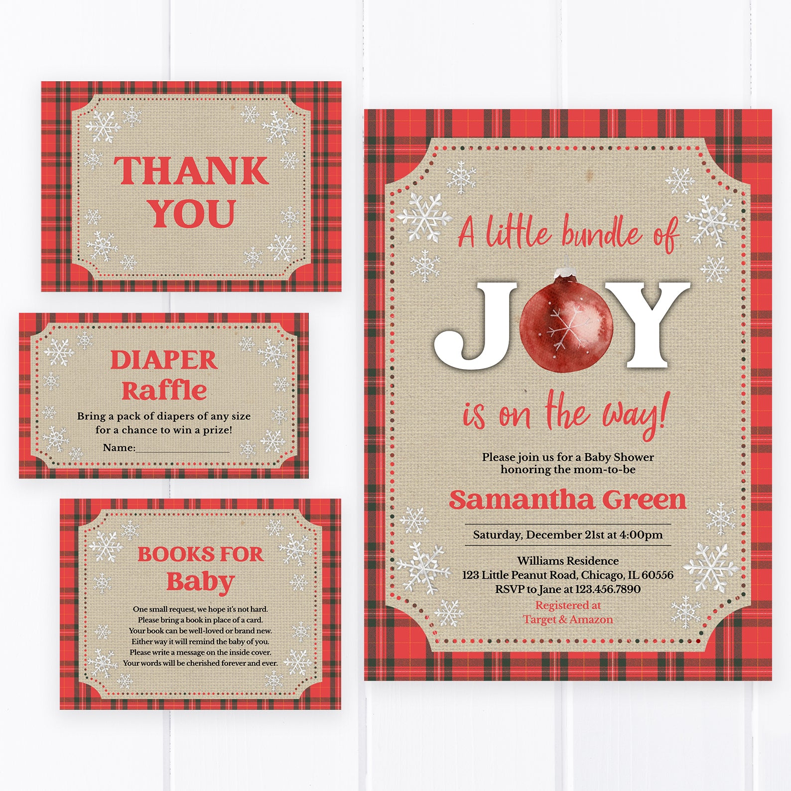 Welcome your winter baby shower with this charming bundle! Featuring a festive red Christmas ball, silver snowflakes, and a cozy brown and red checkered design, this set includes invitations, mobile invites, diaper raffle cards, books for baby cards, and thank you cards—ideal for a seasonal gathering.