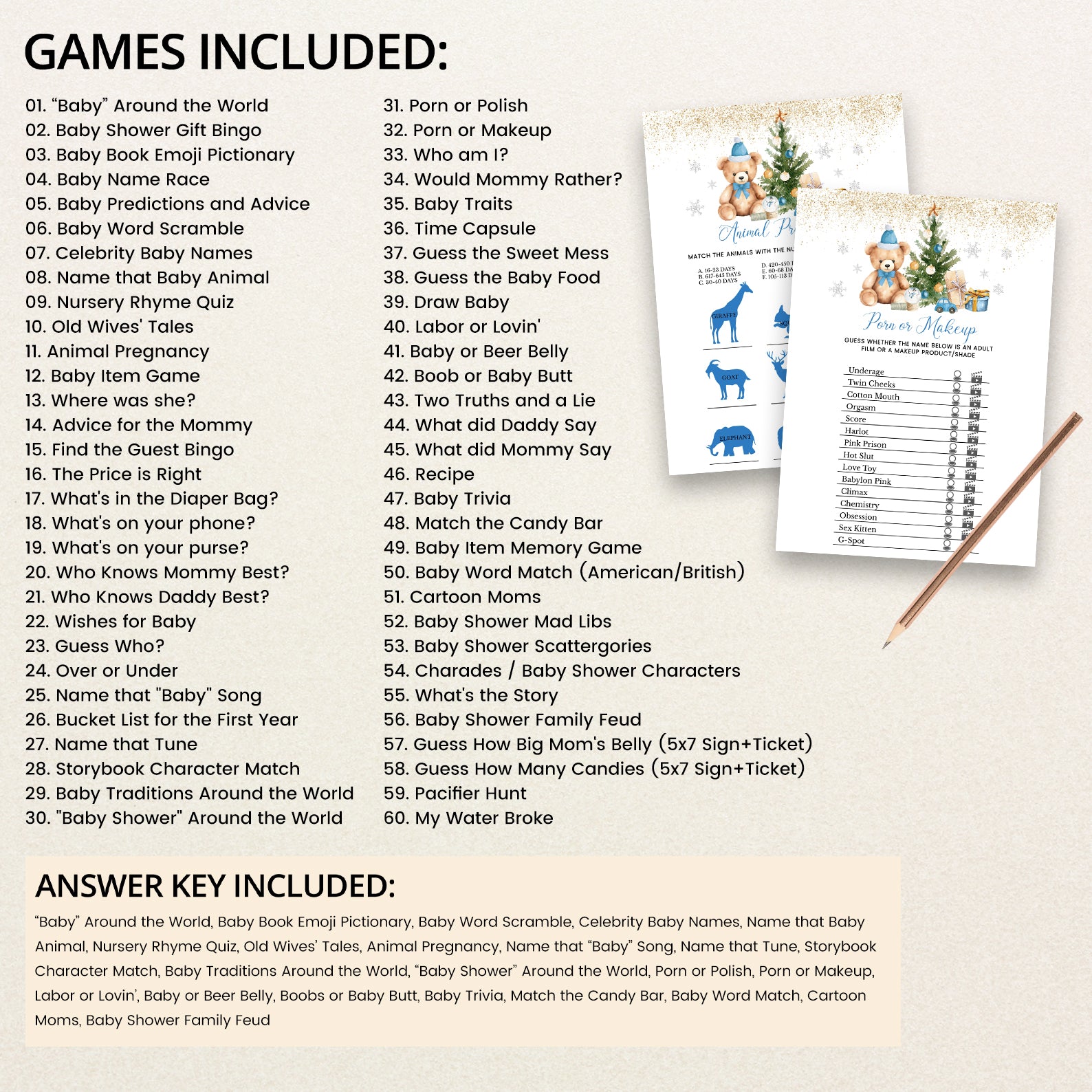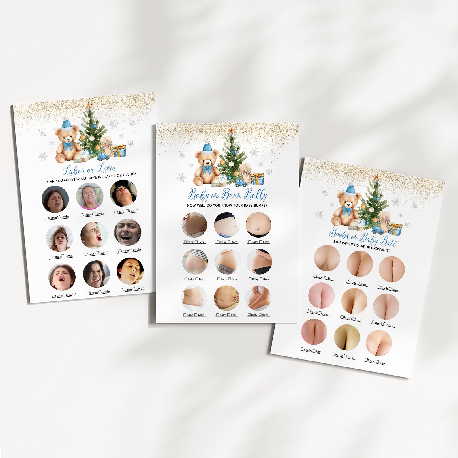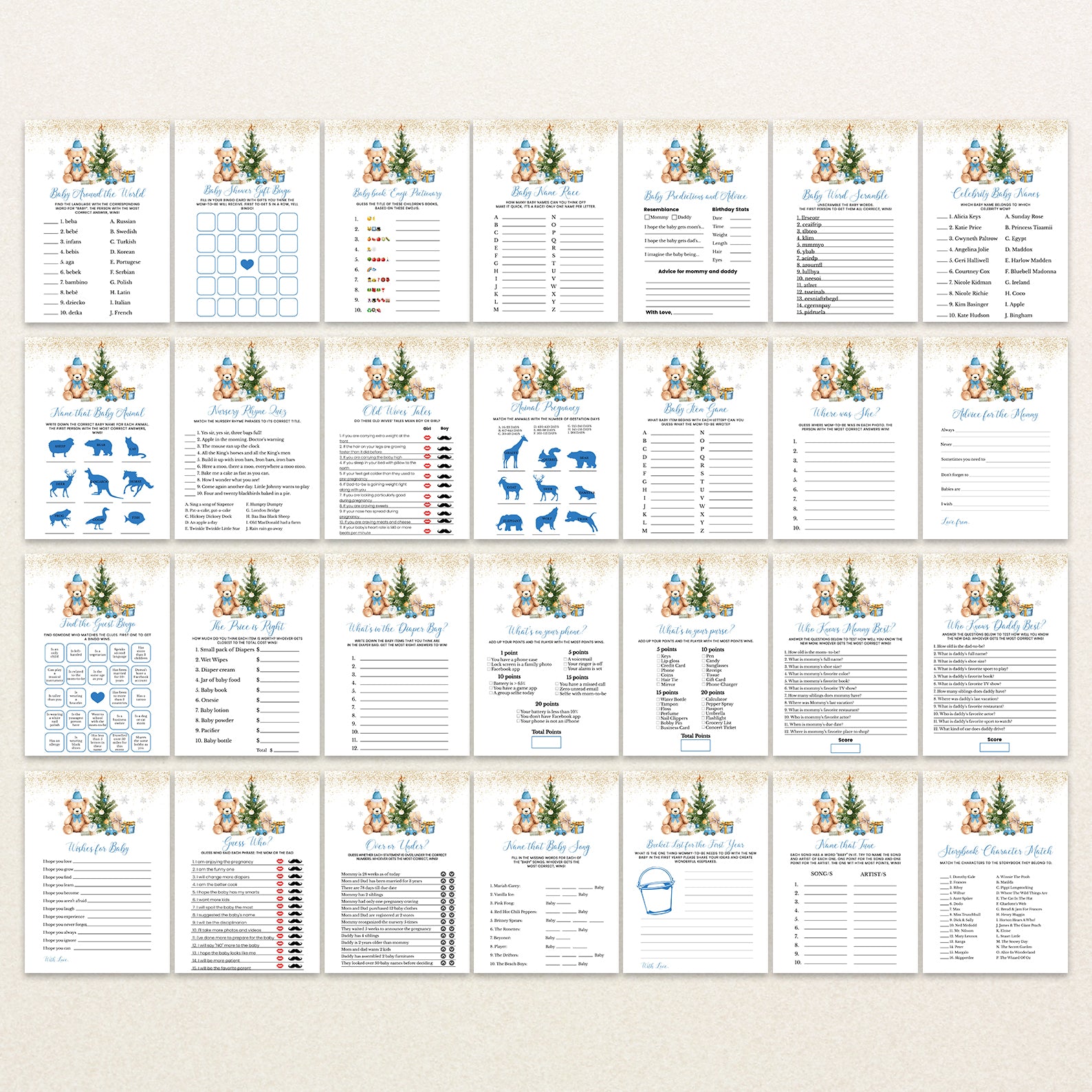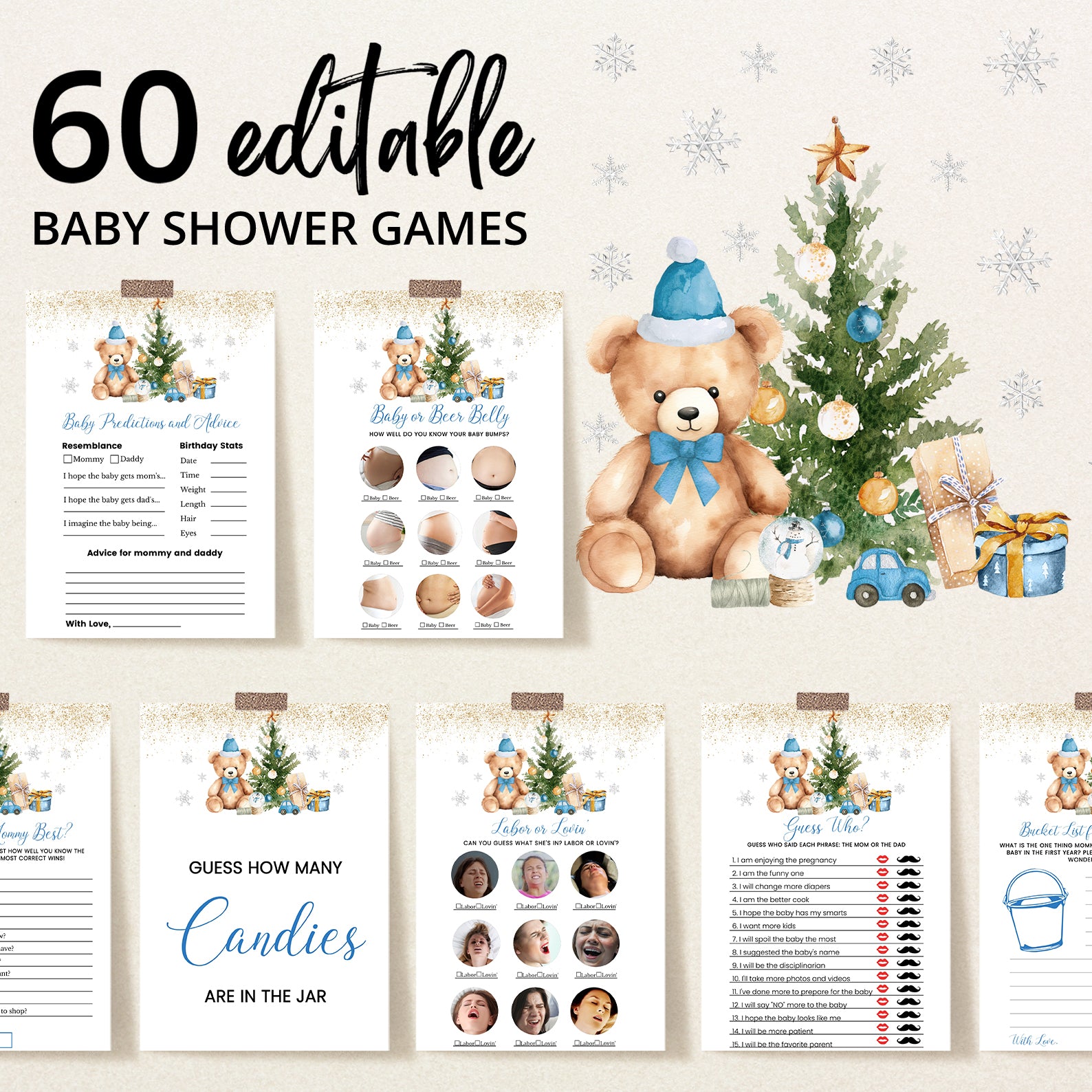 Keep guests engaged with this 60-game editable baby shower bundle, styled with a festive teddy bear in a Santa hat, twinkling gold glitter, silver snowflakes, and a colorful Christmas tree surrounded by gifts. Each game is customizable and designed to match your event décor, offering a mix of fun challenges and icebreakers for a magical winter baby shower in red, blue, or pink themes.