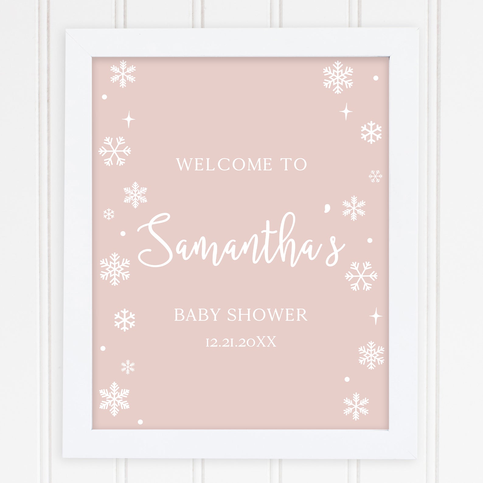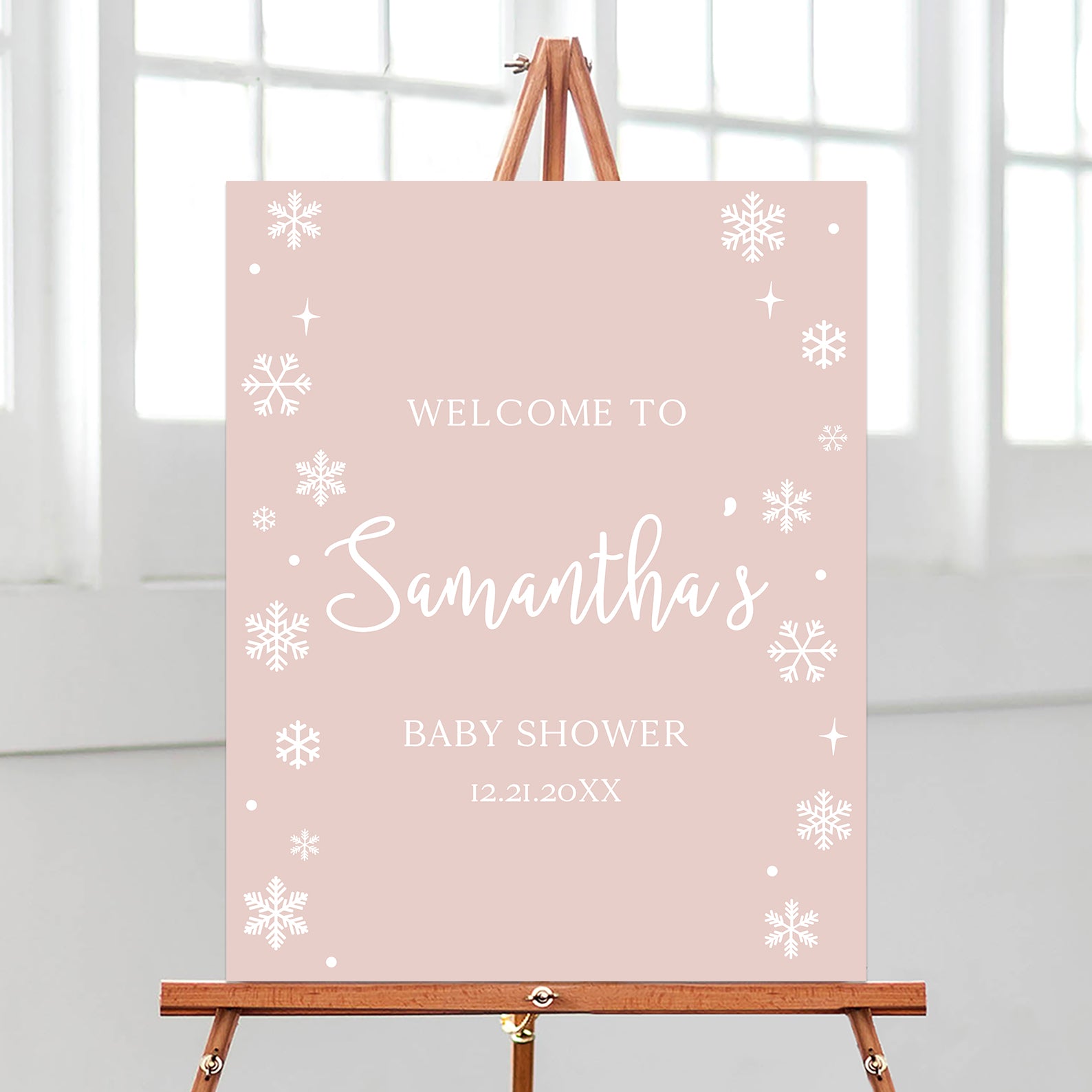 - Purchase this Pink Minimalist Winter Baby Shower Welcome Sign with Snowflakes template