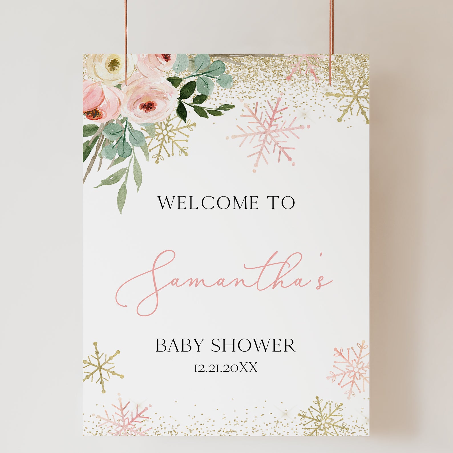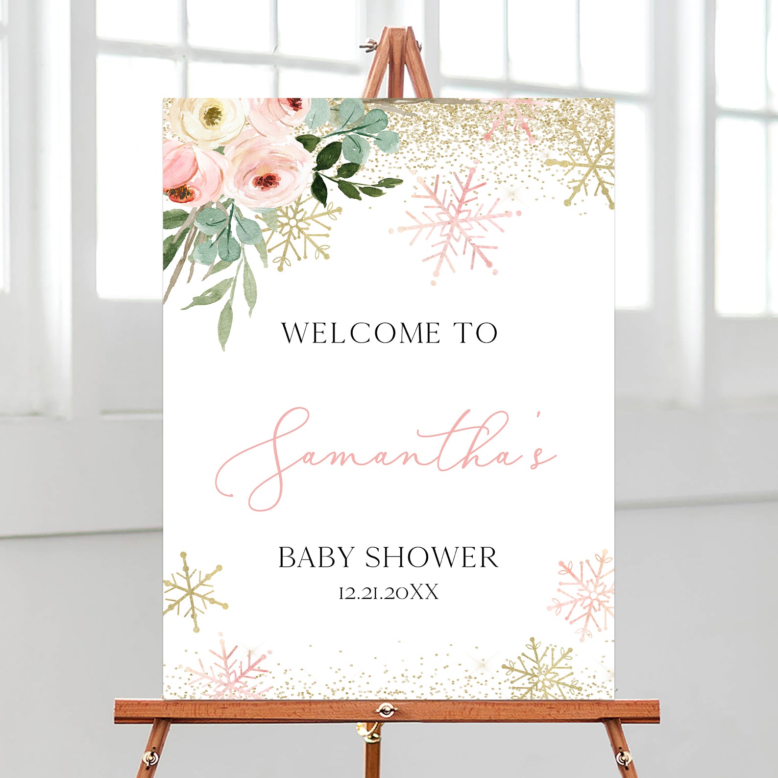 Add a touch of winter magic to your baby shower with this charming welcome sign! Designed with a pink theme, floral accents, and sparkling gold glitter, it’s framed by whimsical pink and gold snowflakes for a cozy, festive atmosphere. Perfect for greeting guests as they arrive to share in the joy of your special day.