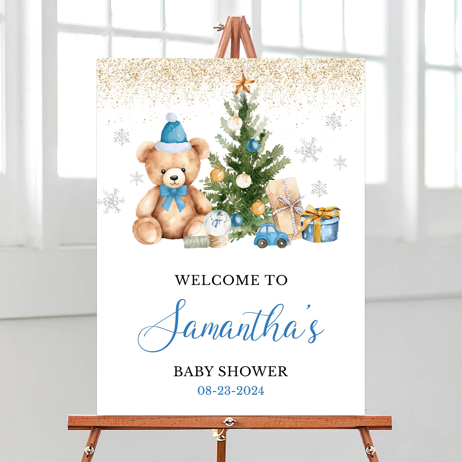 - Purchase this We Can Bearly Wait: Blue Winter Baby Shower Welcome Sign with Bear template