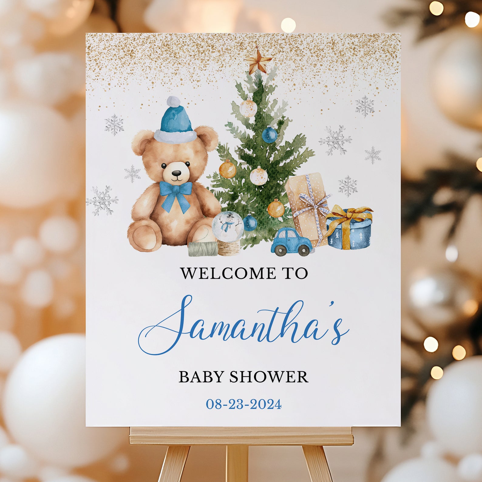 Welcome your guests in style with our "We Can Bearly Wait" winter baby shower welcome sign! Designed with festive red, blue or pink themes, this charming sign features a sparkling gold glitter top border, playful silver snowflakes, and an adorable teddy bear in a Santa hat. Perfect for setting a cheerful tone at your celebration, this sign is a delightful addition to your winter wonderland!