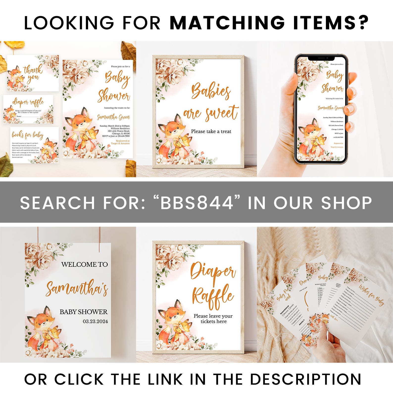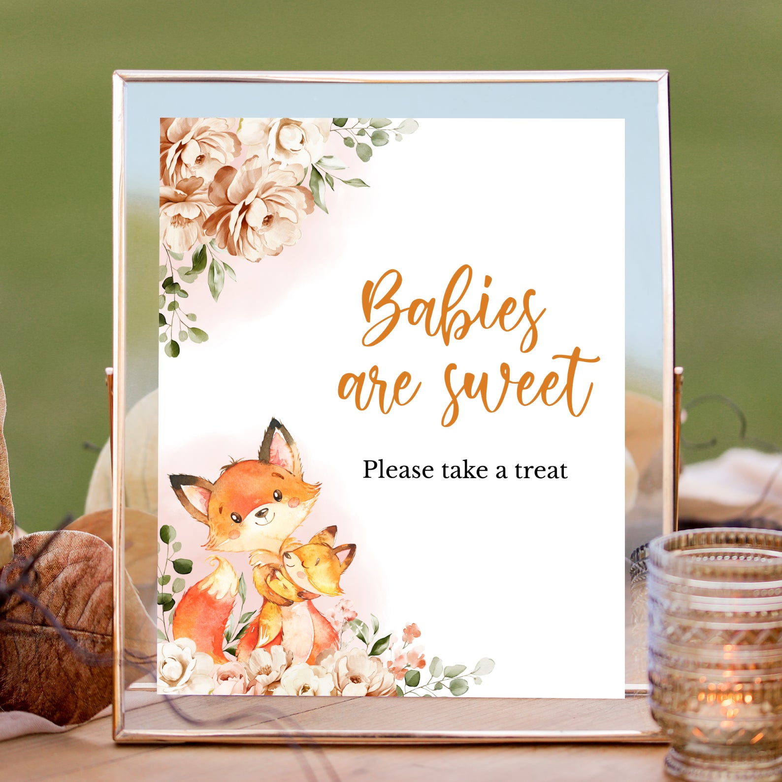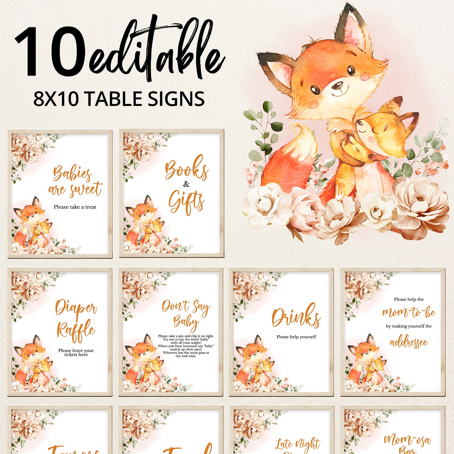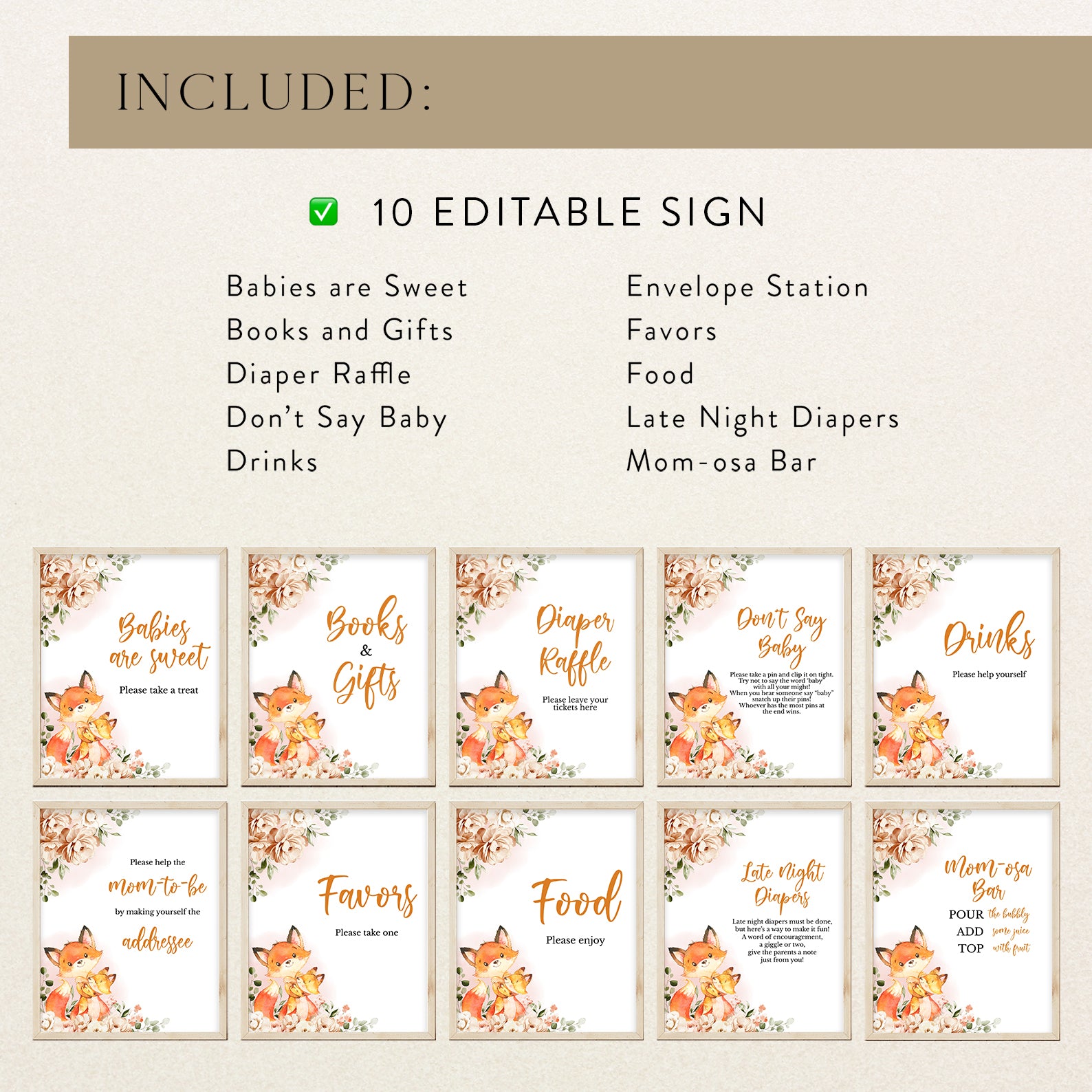 Add a charming touch to your autumn baby shower with our editable table sign set, featuring ten beautifully coordinated signs. Designed with a soft orange and woodland theme, each sign showcases warm fall florals and a sweet baby fox illustration nestled among leaves and florals. Perfect for labeling stations like "Babies Are Sweet," "Mom-osa Bar," and "Books and Gifts," these signs add both style and organization to your cozy celebration.