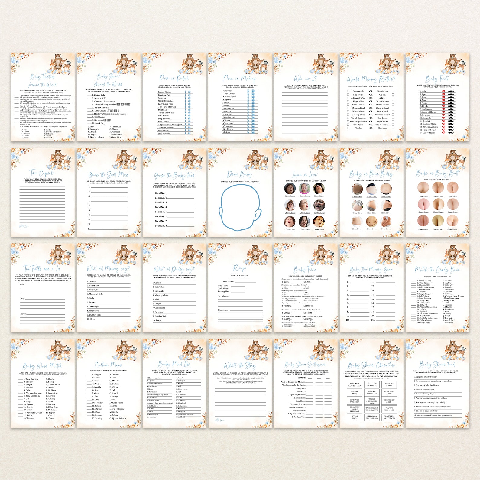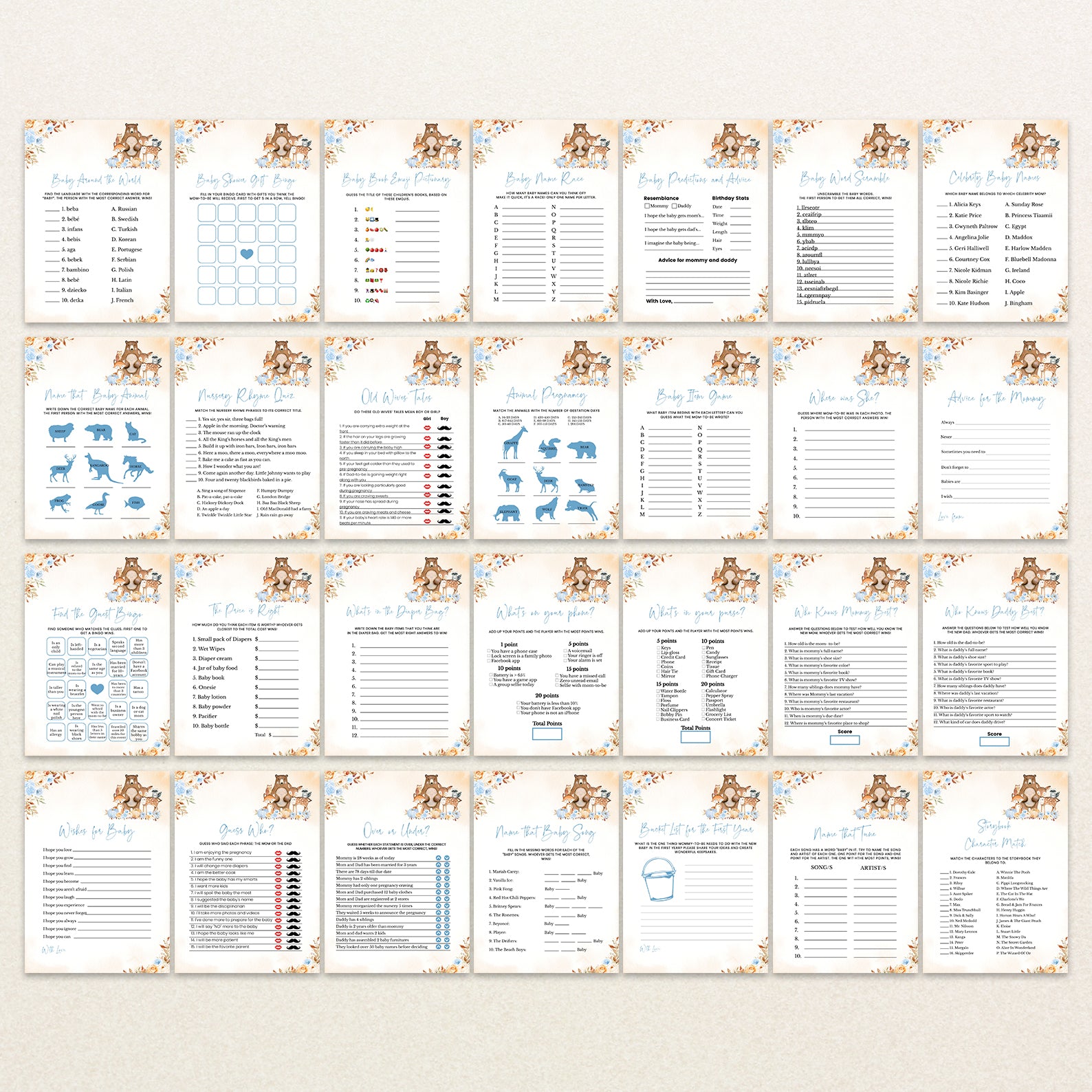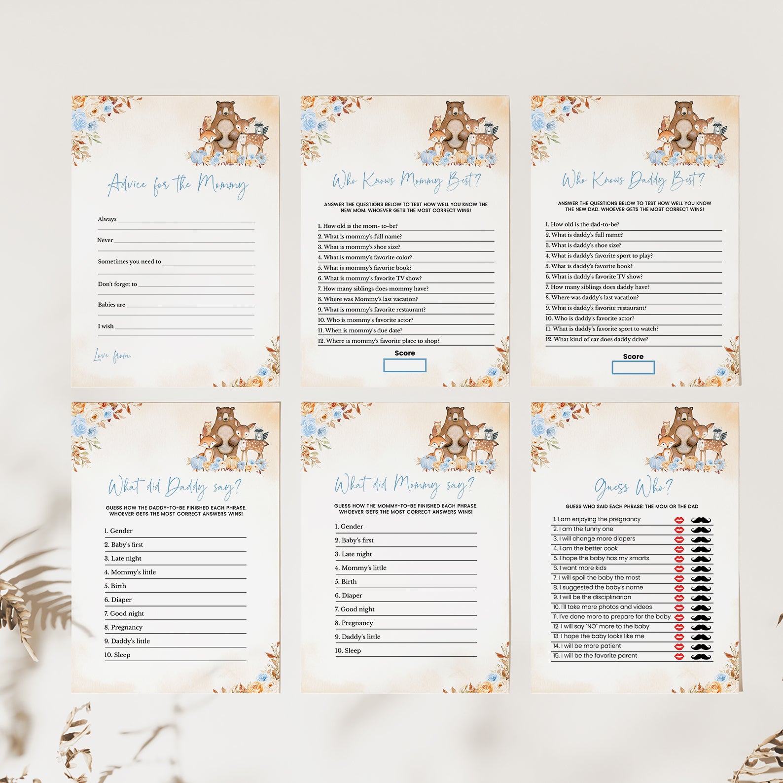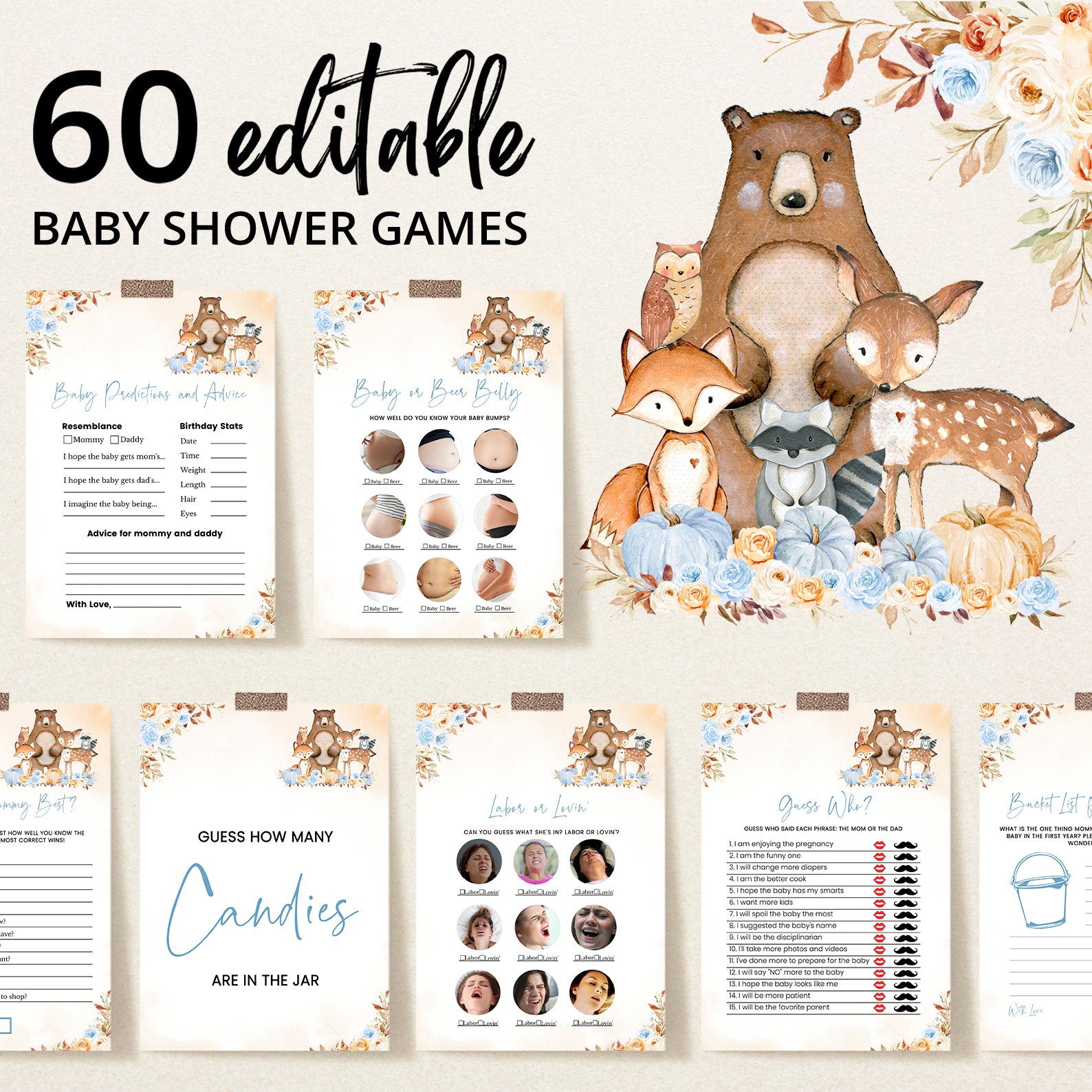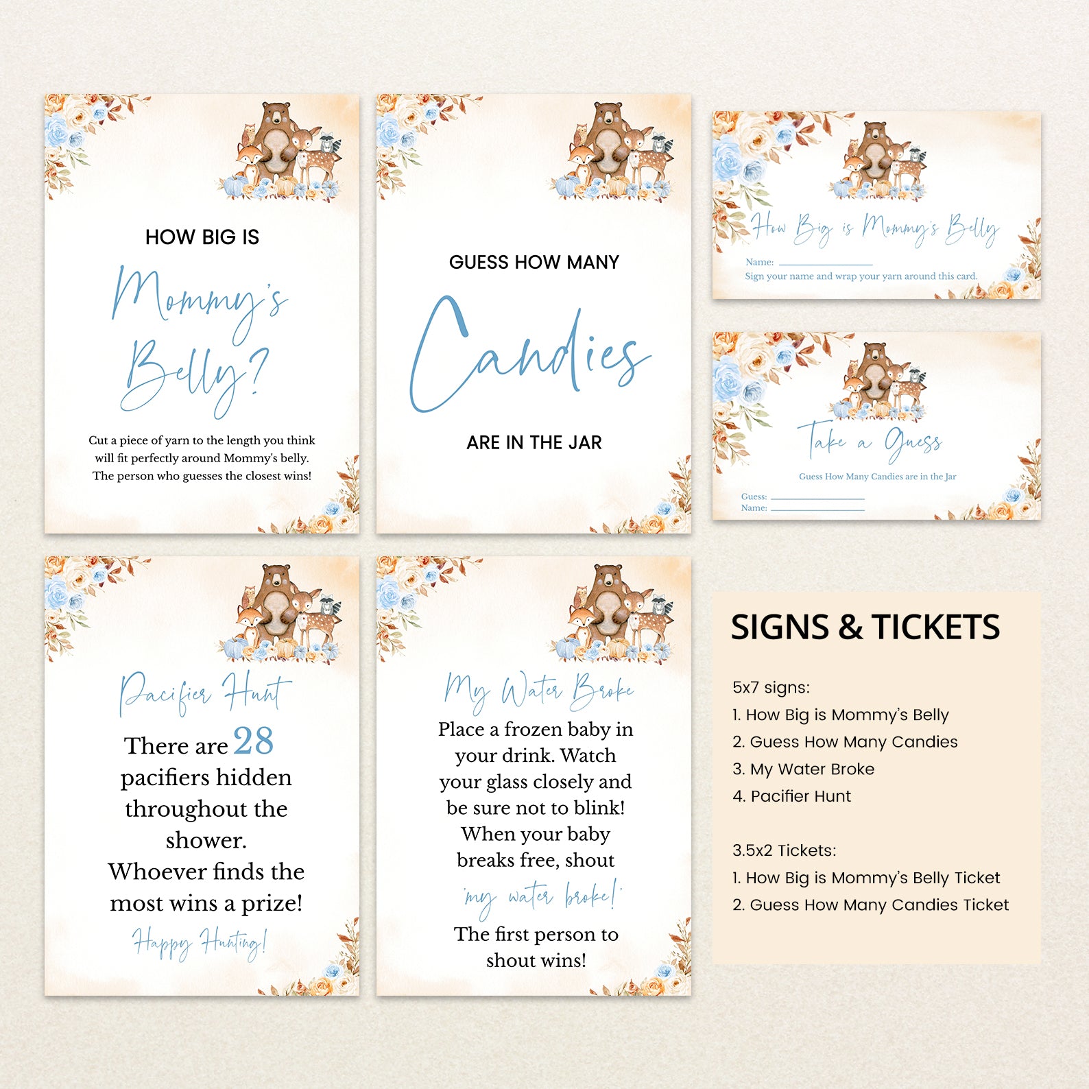 - Purchase this Sweet Little Pumpkin Blue Baby Shower Game Bundle with Woodland Animals template