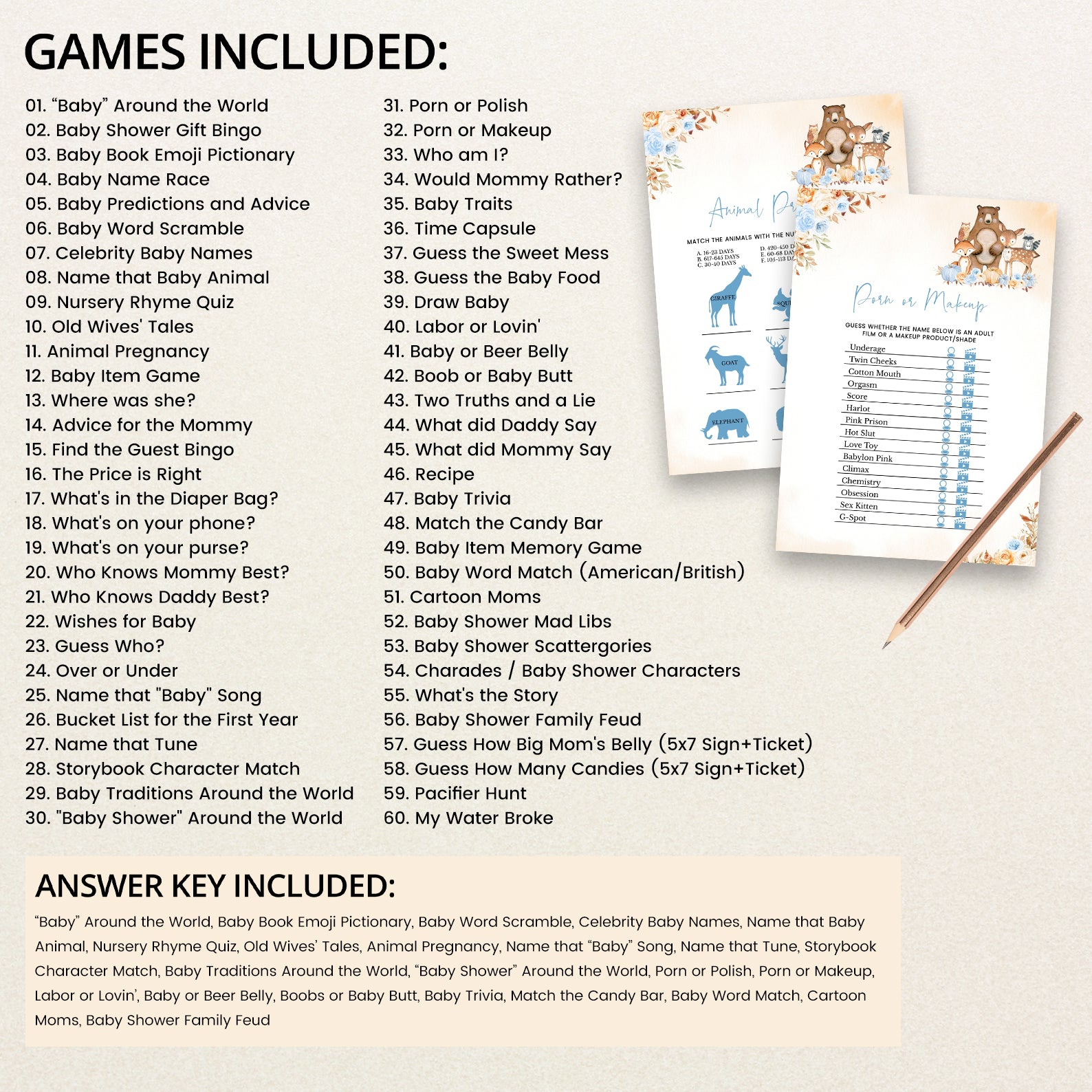 Sweet Little Pumpkin Blue Baby Shower Game Bundle with Woodland Animals