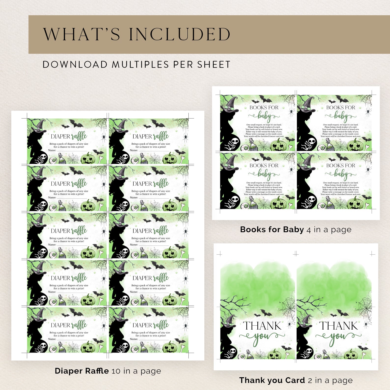 Get ready for a spooktacular celebration with our "Baby is Brewing" Halloween-themed invitation bundle! This set includes a digital invitation, mobile invitation, diaper raffle, books for baby, and thank you card, all featuring a whimsical design with Halloween delights. From playful pumpkins and bubbling cauldrons to a charming pregnant witch and flying bats, each piece adds a magical touch to your event. Choose from vibrant colors like green, pink, purple, blue, and orange to perfectly match your theme. Set the tone for a festive and enchanting baby shower with this complete bundle!