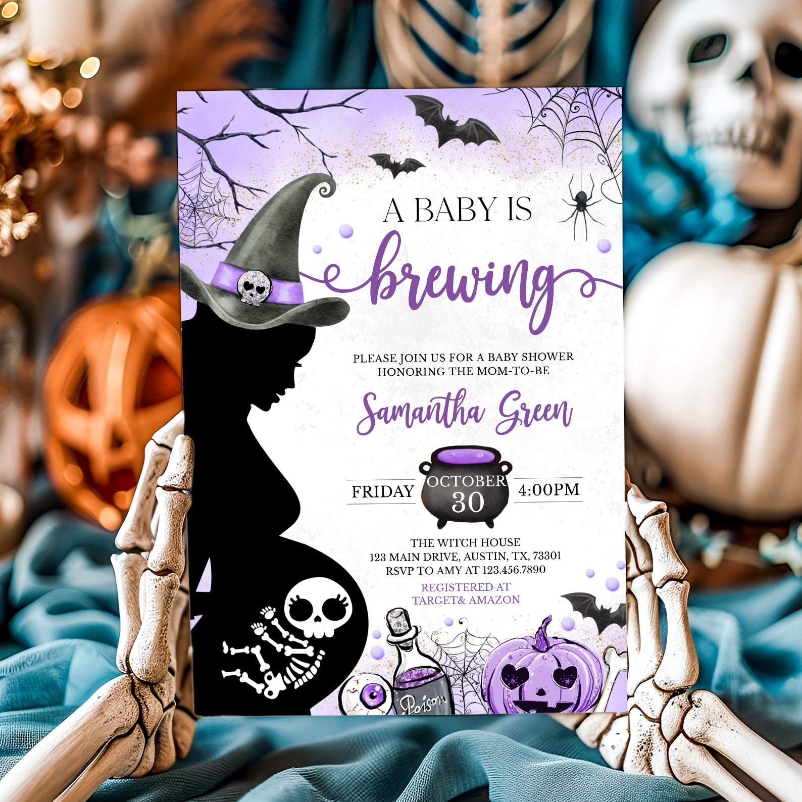 A Baby is Brewing Purple Halloween Digital Baby Shower Invitation