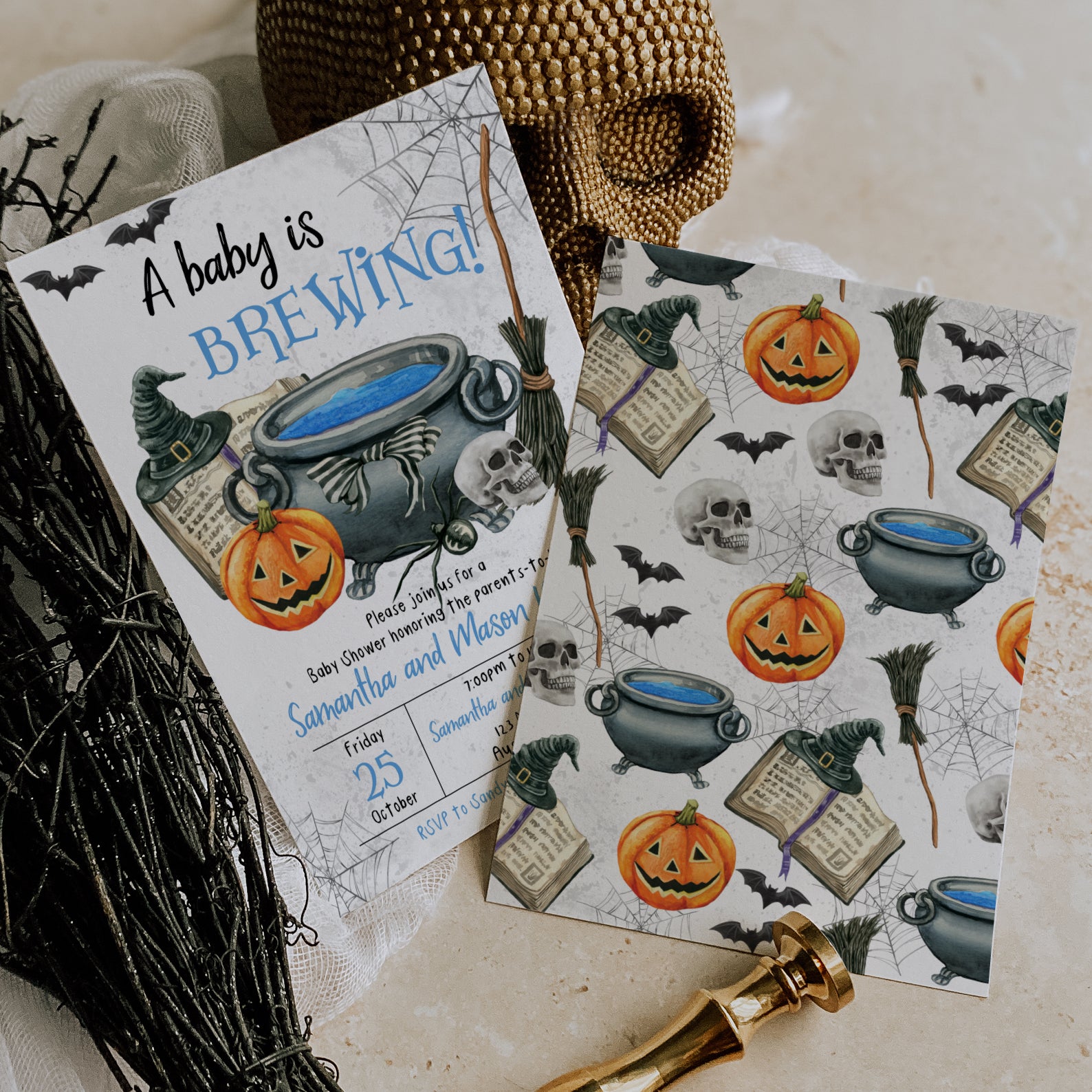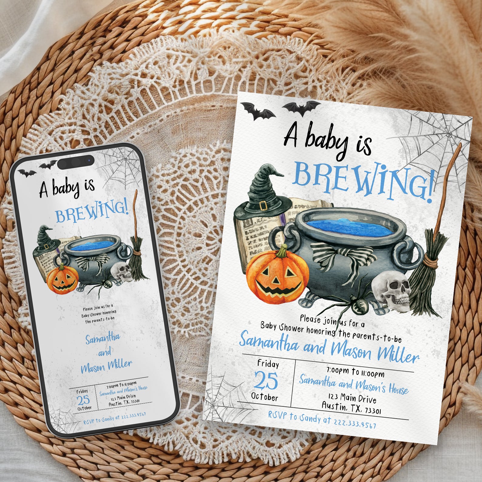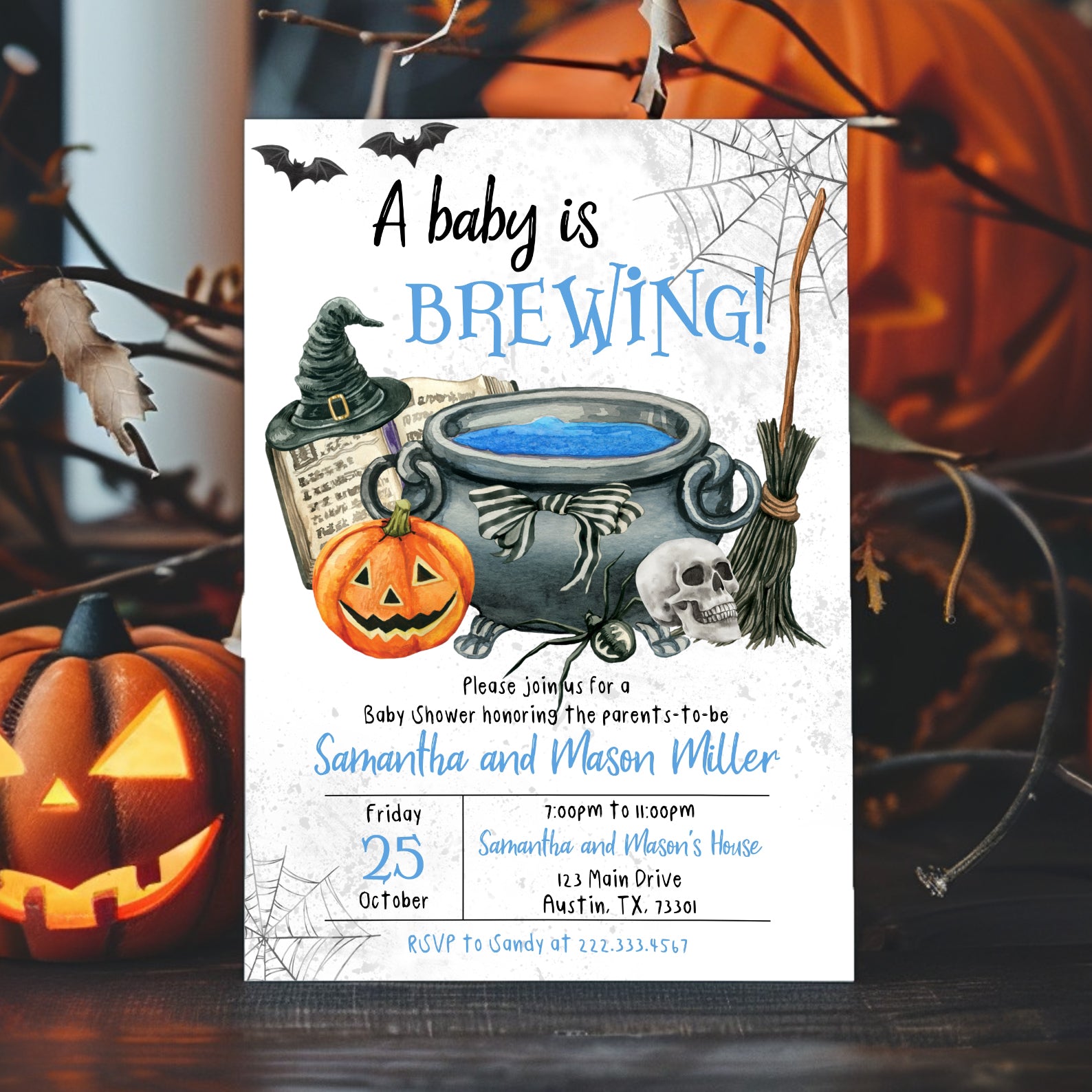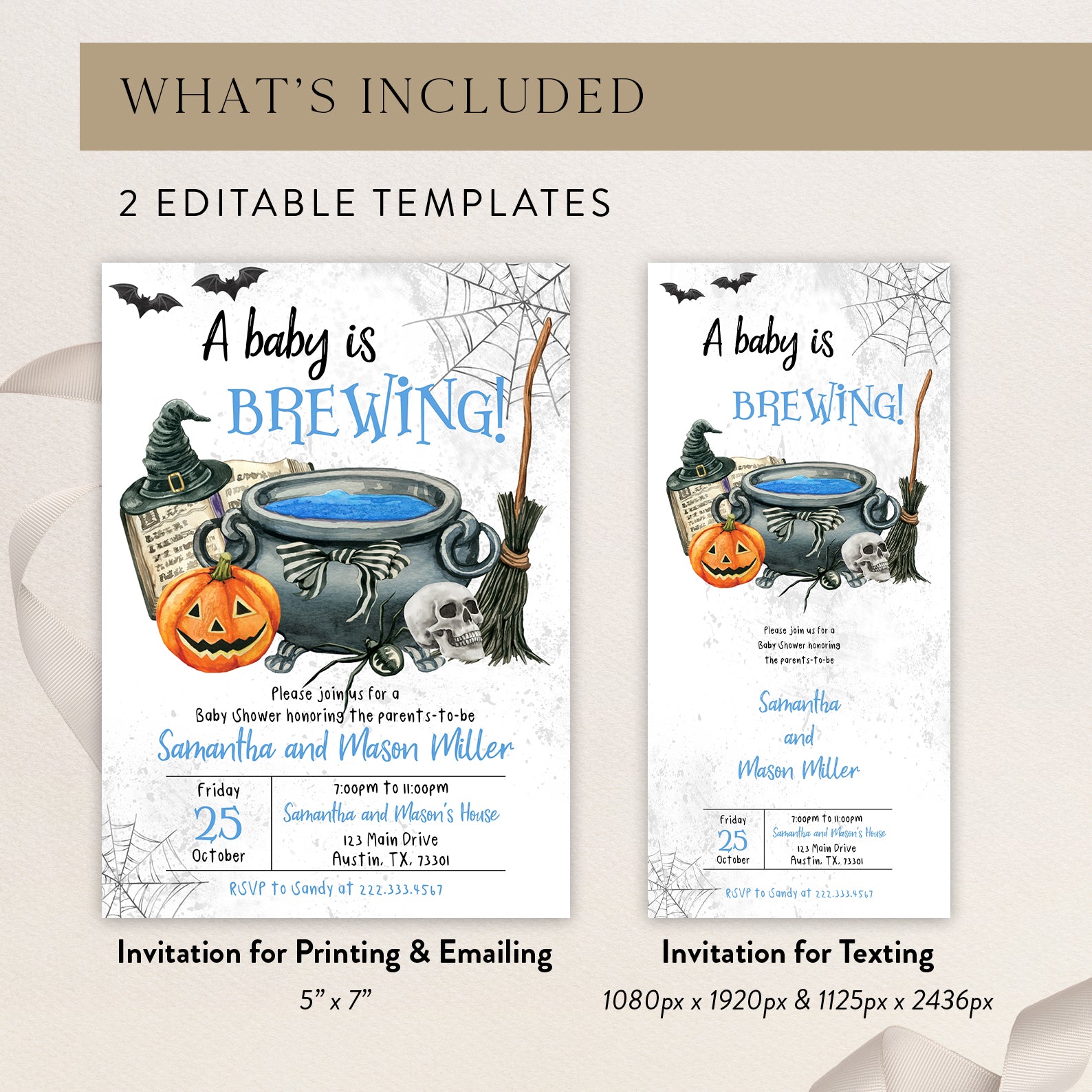 - Purchase this A Baby is Brewing: Whimsical Halloween Baby Shower Invite! template