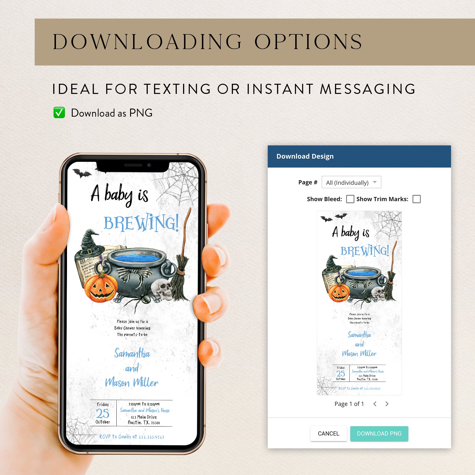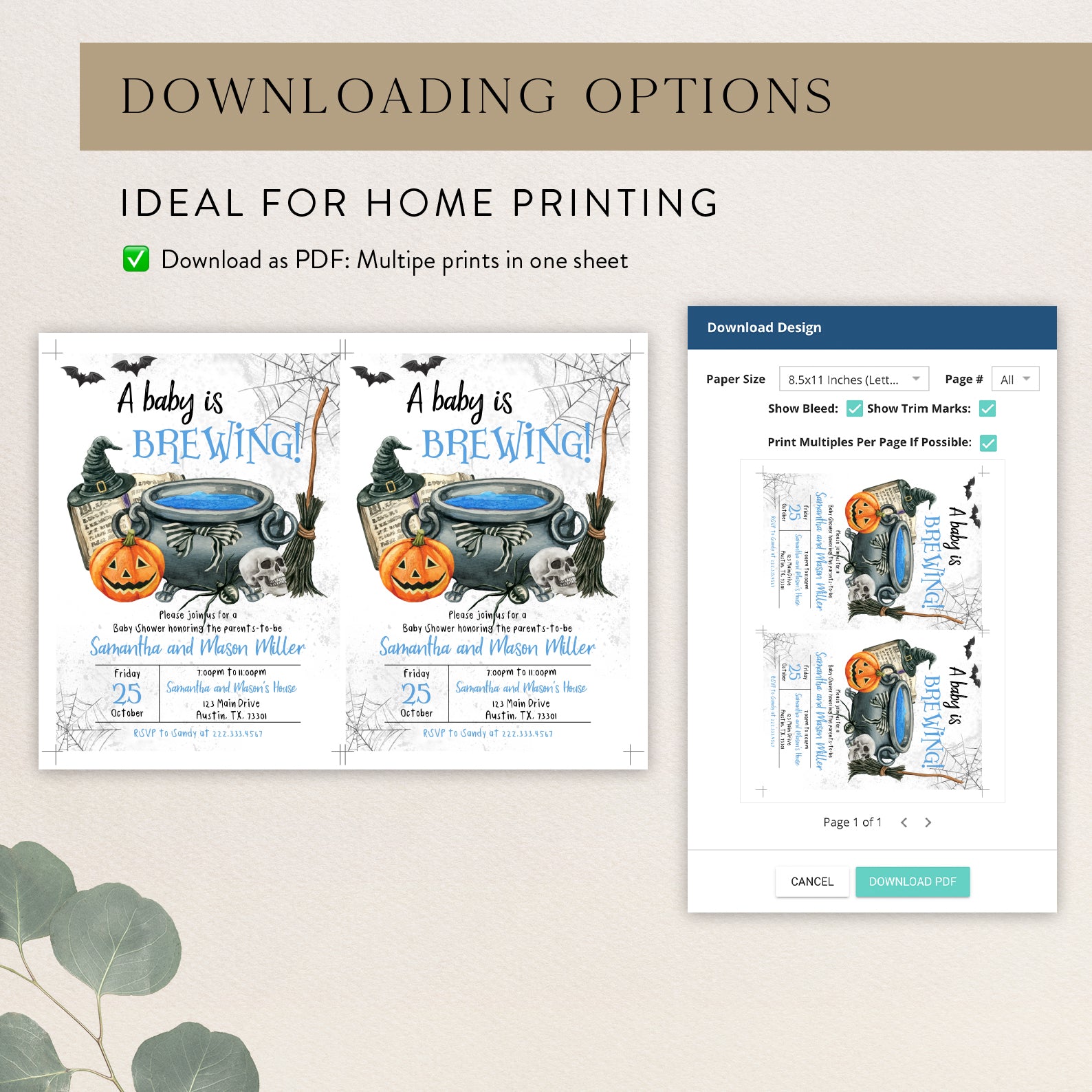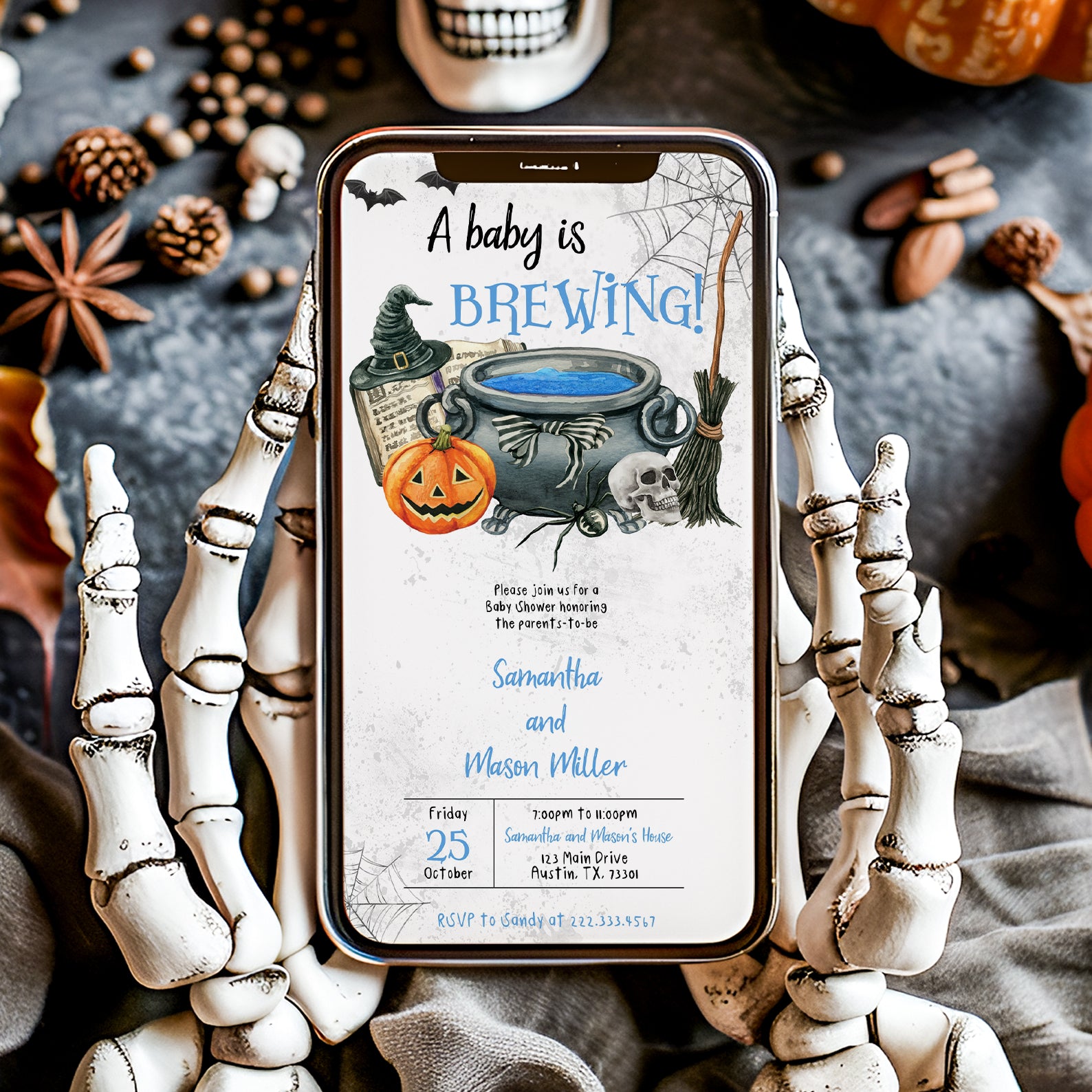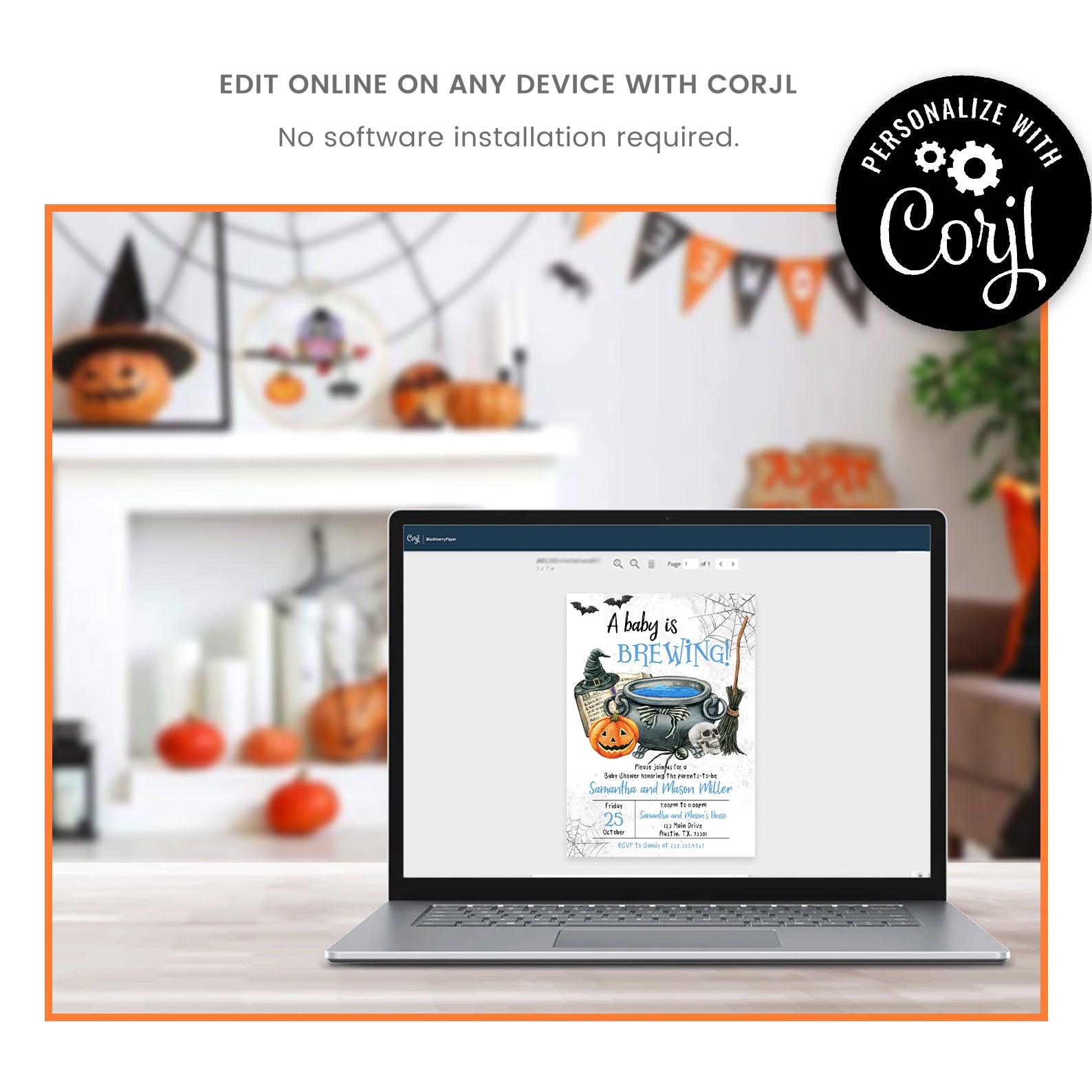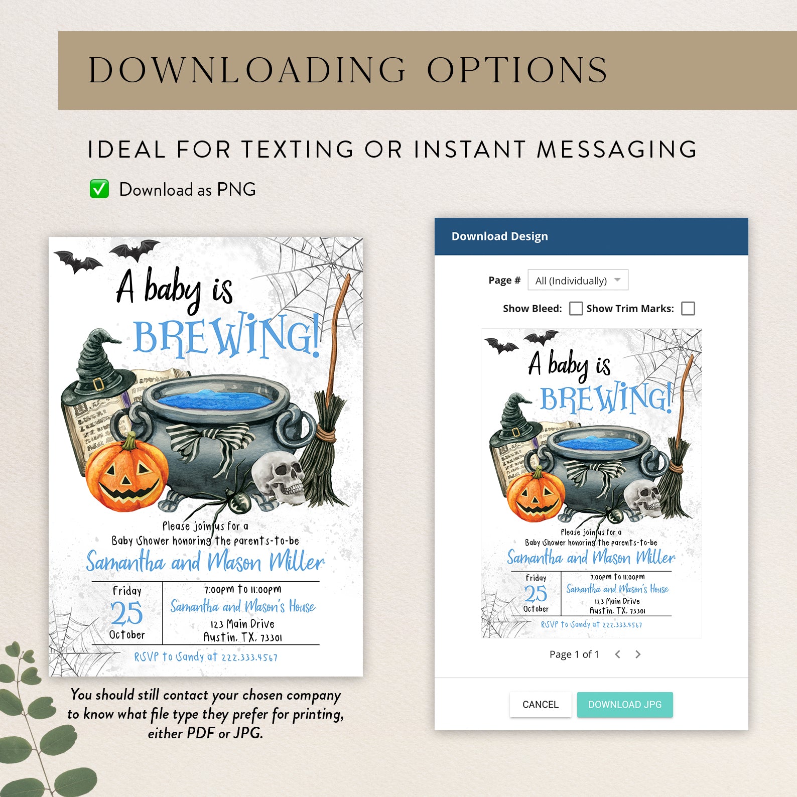 - Purchase this A Baby is Brewing: Whimsical Halloween Baby Shower Invite! template