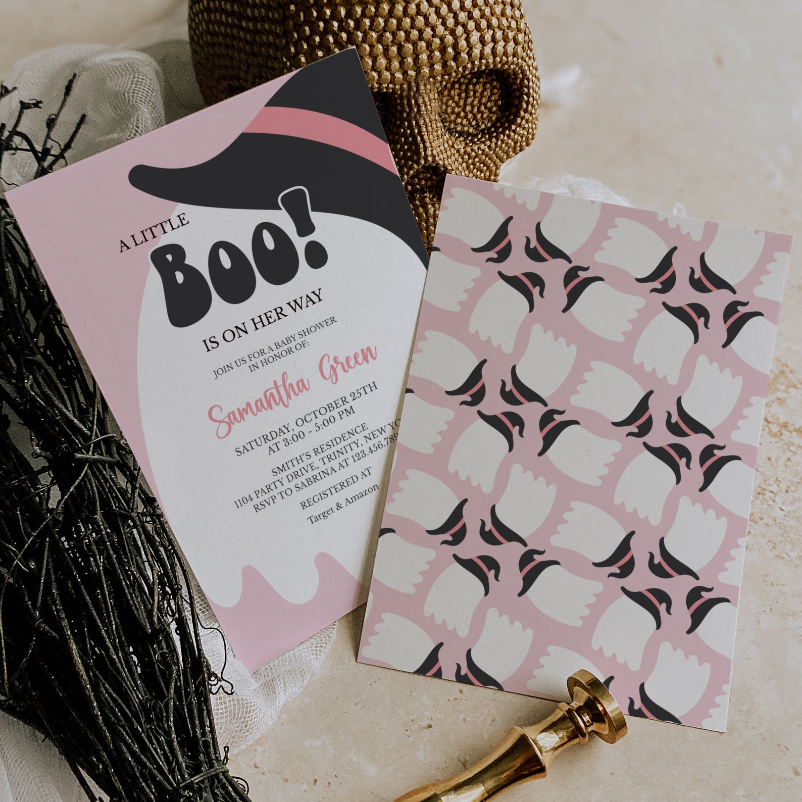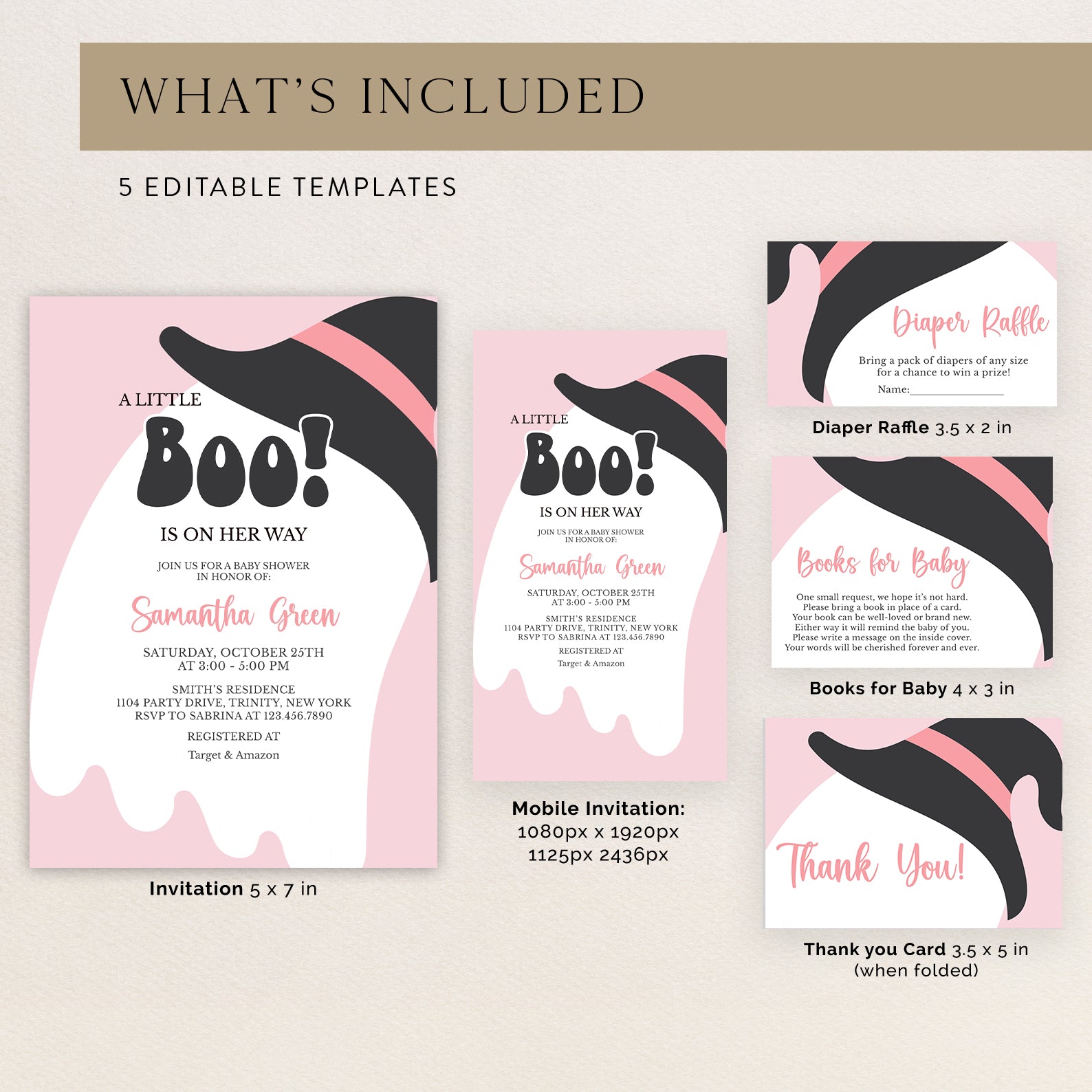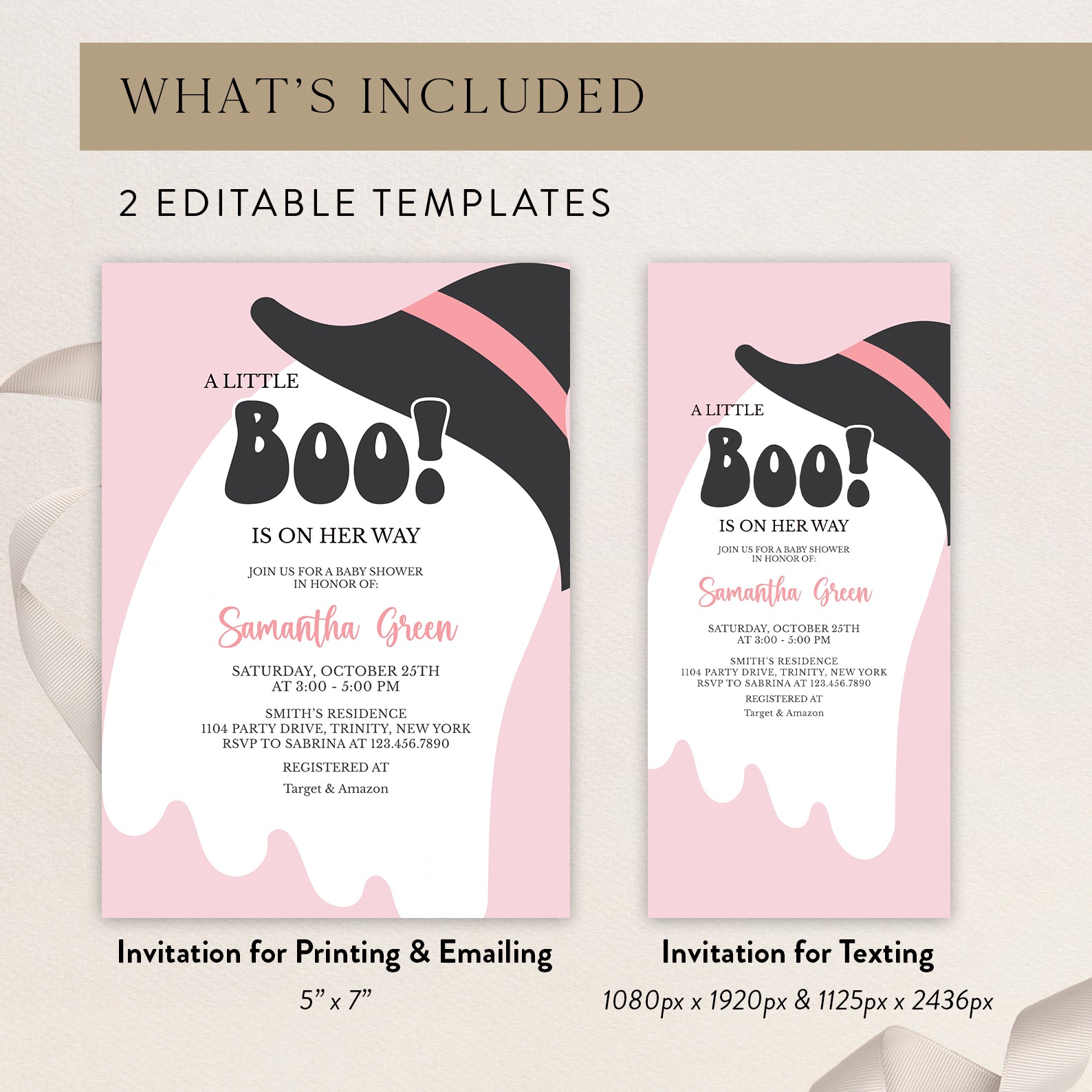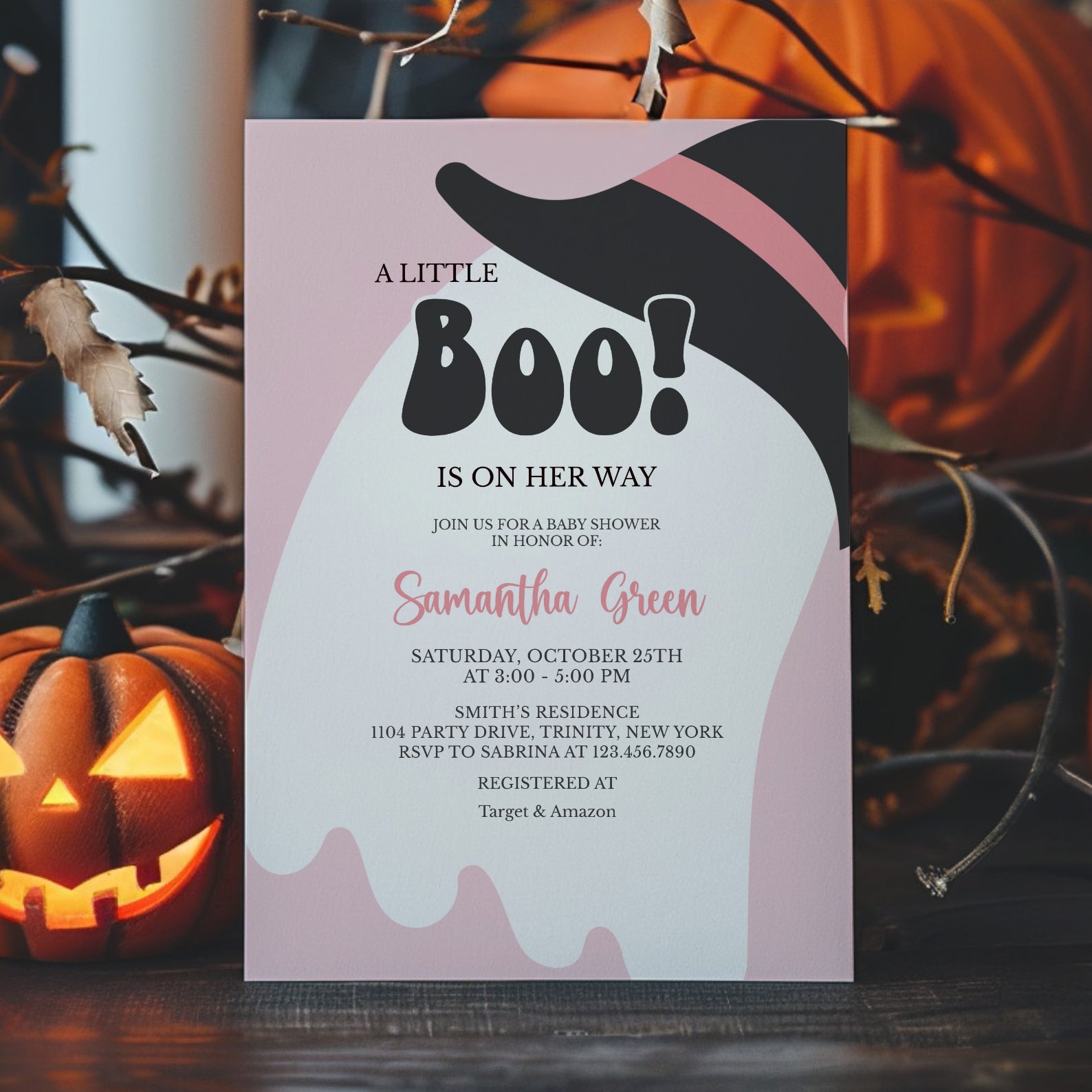 - Purchase this A Little Boo Is On Her Way: Pink Halloween Invite Bundle template