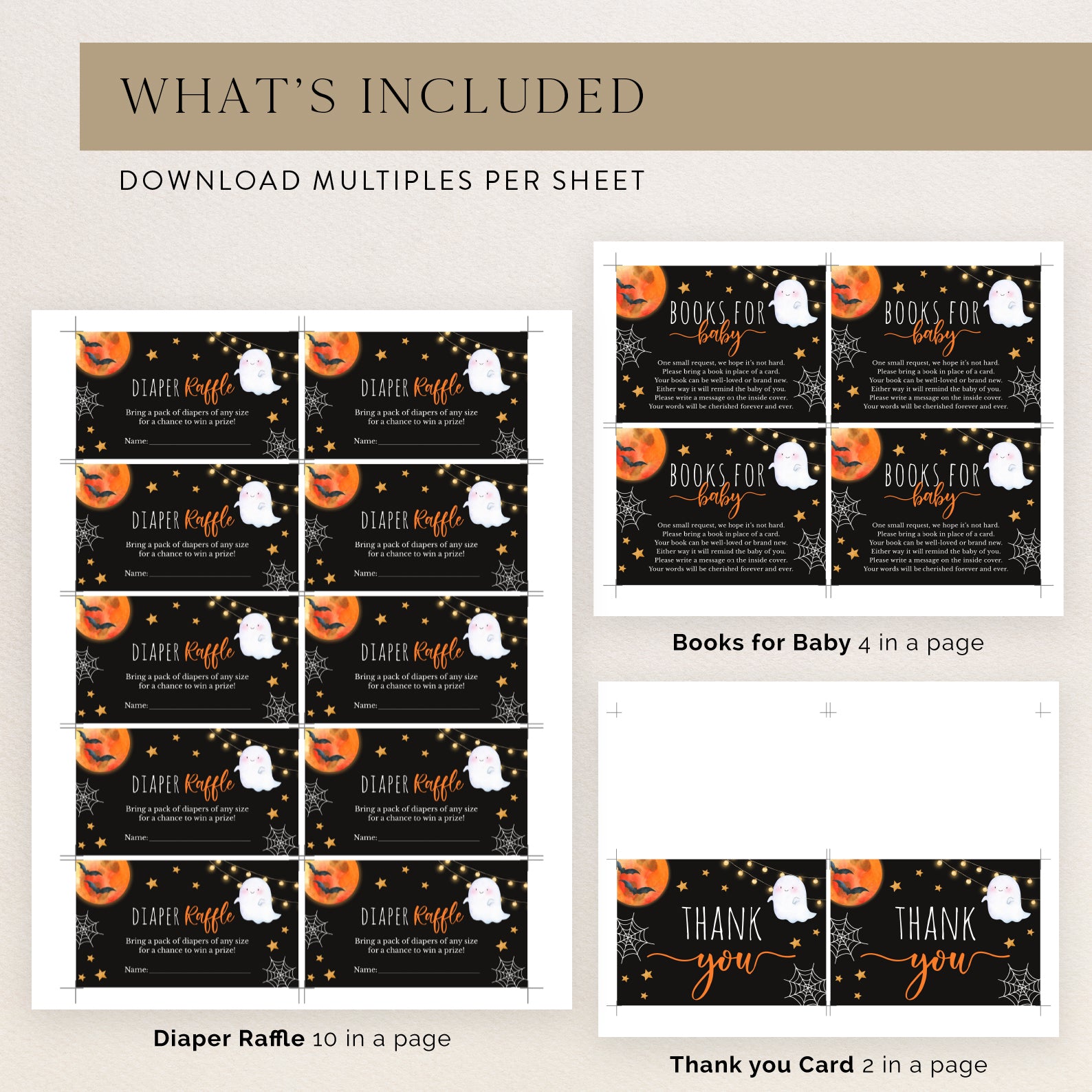 Get ready for a spooktacular celebration with our 'Little Boo's Spooktacular Arrival' invitation bundle! Perfect for a Halloween-themed baby shower or gender reveal, this charming set features an invitation with a black background adorned with stars, twinkling lights, cute ghosts, spider webs, flying bats, and a vibrant orange full moon. The bundle also includes a digital version for easy sharing, a diaper raffle card to encourage diaper donations, a books for baby card to request cherished books, and a thank you card to express your gratitude. Set a festive tone and excite your guests for a hauntingly good time with this delightful bundle!