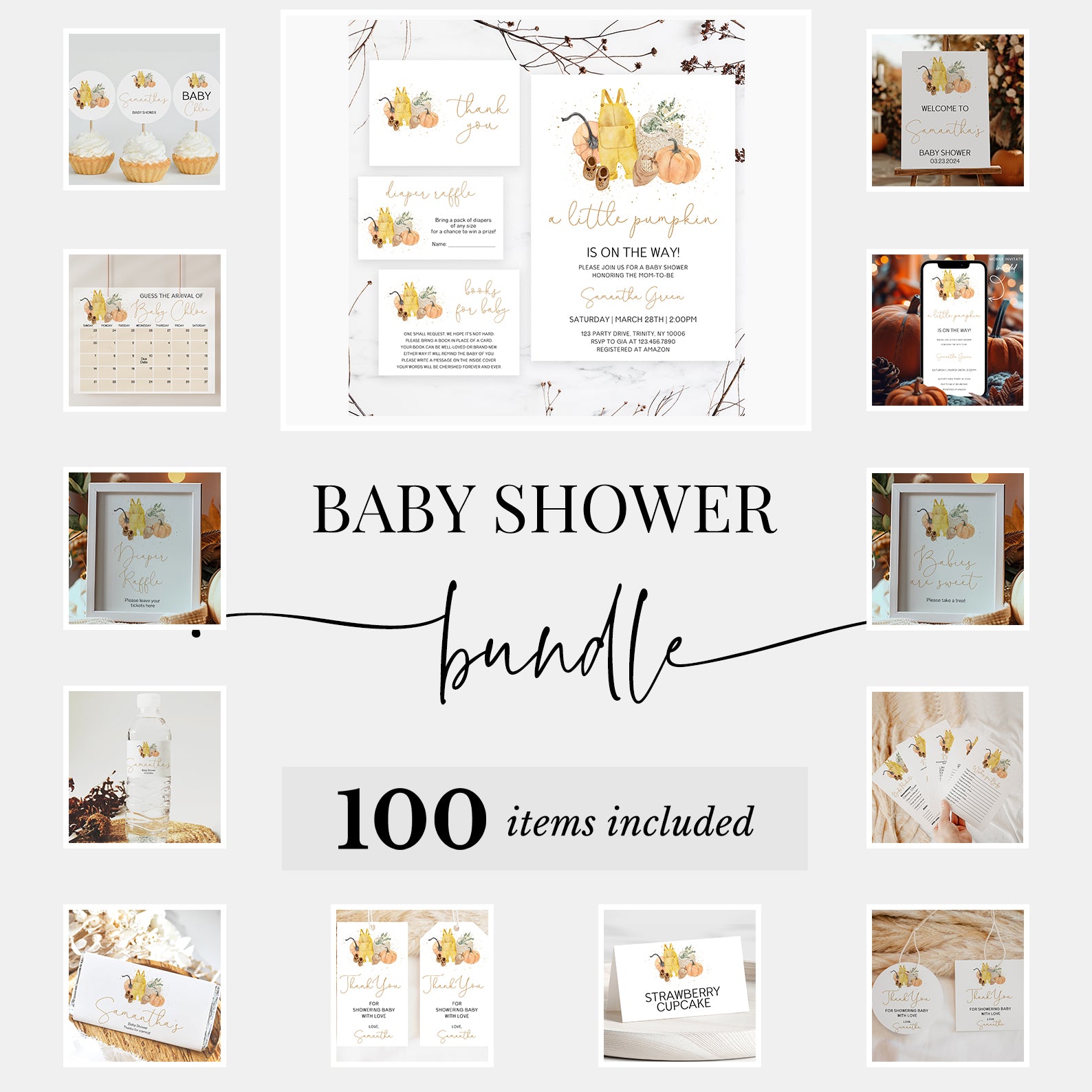 Get everything you need for a picture-perfect celebration with our fall baby shower mega bundle! This all-in-one digital set includes 100 editable items from invitations and thank you cards to diaper raffle tickets, table signs, favor tags, water bottle labels, cupcake toppers, and more. Designed with cozy autumn vibes, it features pumpkins, baby clothes, floral accents, and shimmering gold touches. Ideal for hosting a warm, whimsical, and beautifully coordinated baby shower.