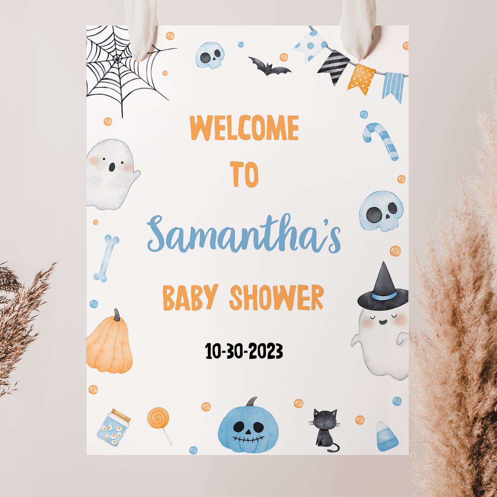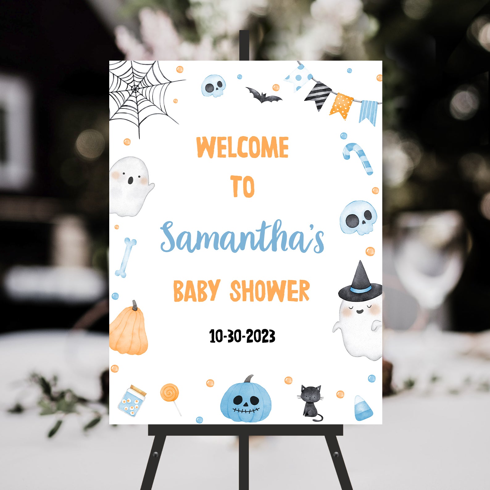 1. Purchase this Adorable Baby Shower Digital Welcome Sign: Ghosts & Sweet Treats template