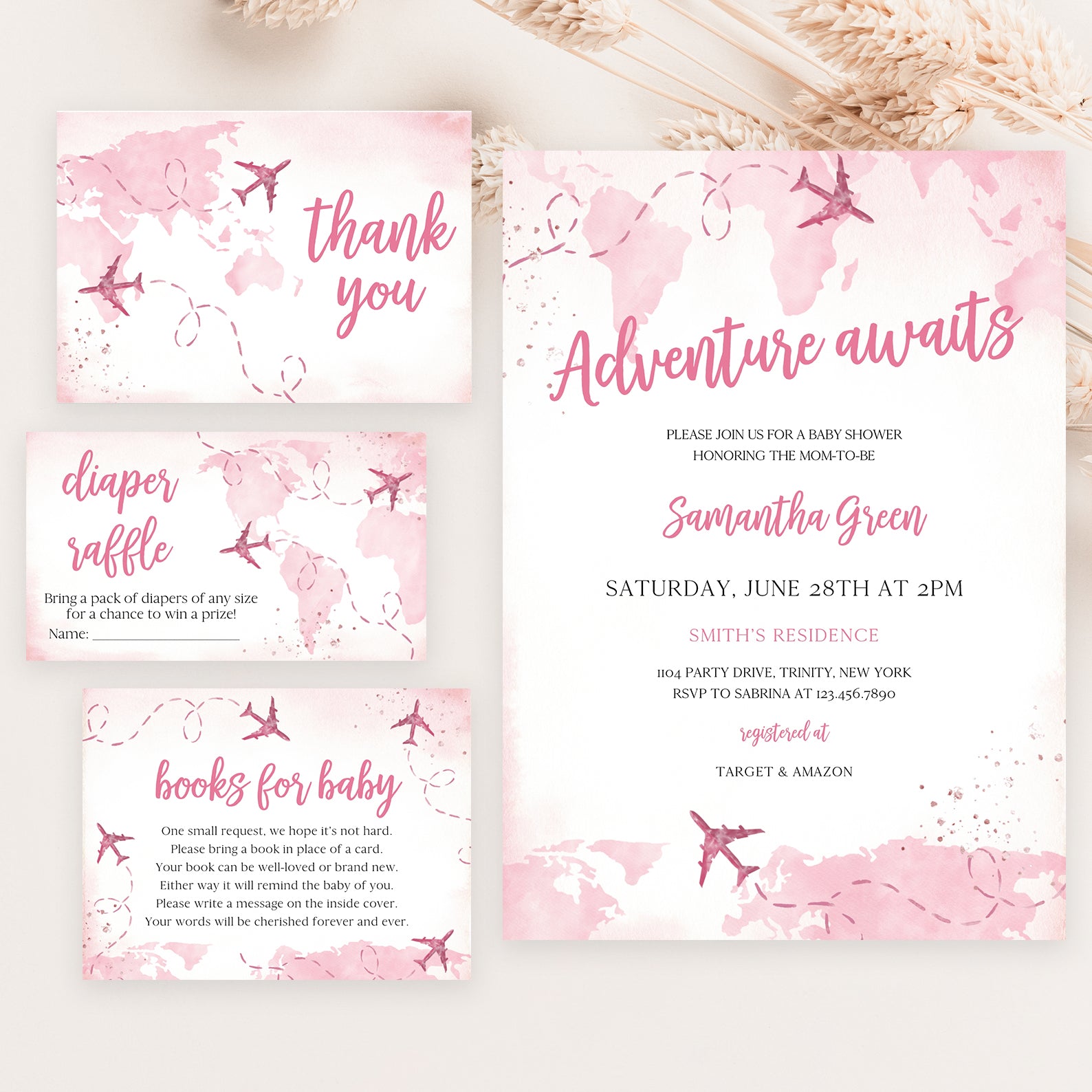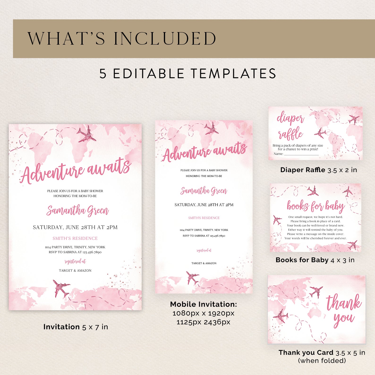 - Purchase this Adventure Awaits Baby Shower Digital Invite Bundle: Pink Travel Theme template