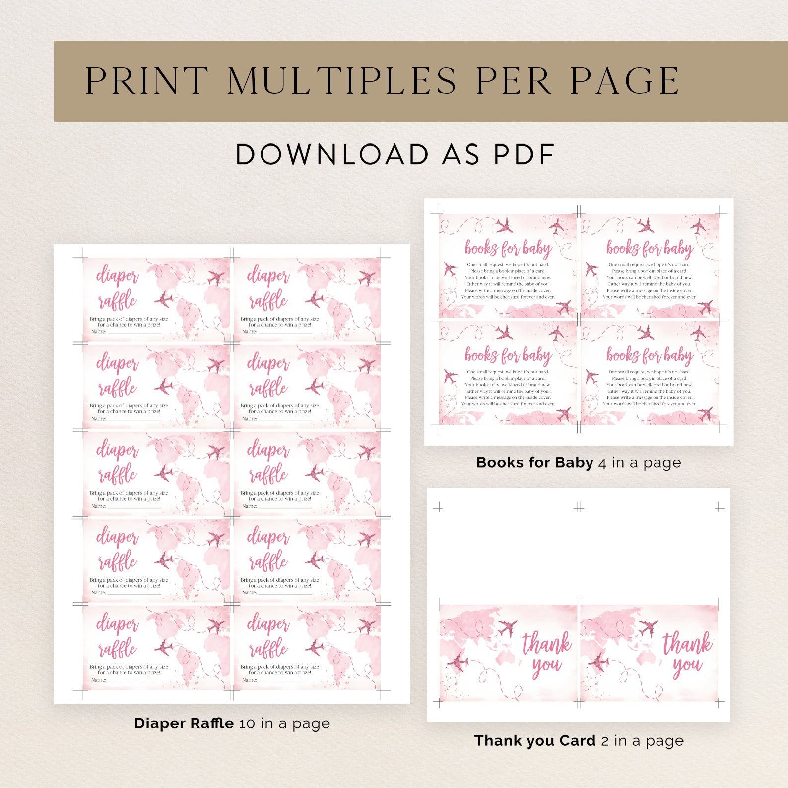 Celebrate your baby shower with our pink "Adventure Awaits" invitation bundle! Featuring a playful map design with flying airplanes, this set includes a digital invite, mobile version, diaper raffle, books for baby, and thank you card. Easy to personalize, it’s perfect for a fun, travel-themed celebration!