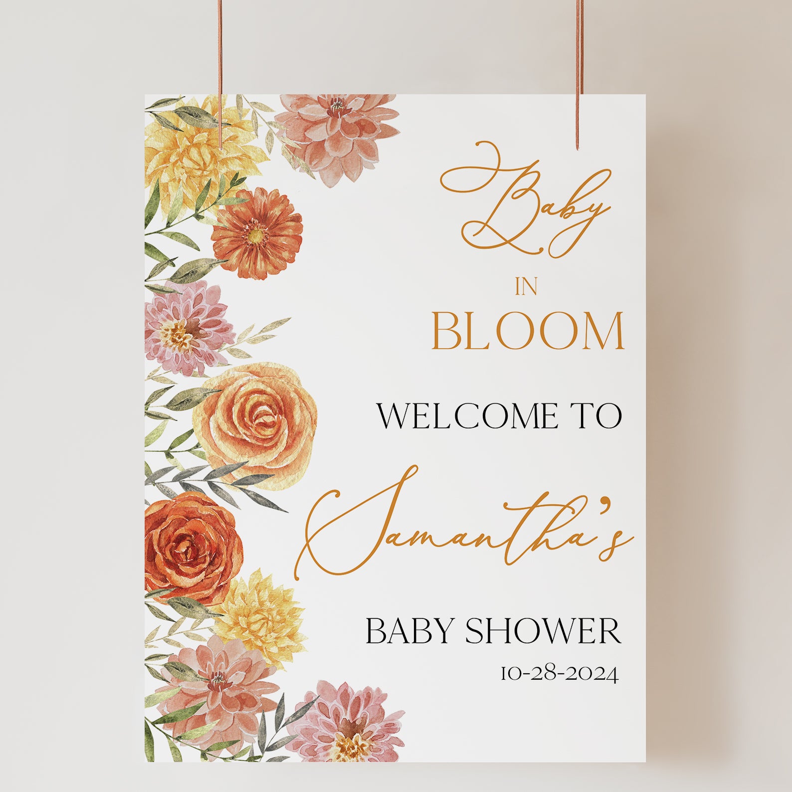 1. Purchase this Baby in Bloom Fall Baby Shower Welcome Sign with Flowers & Leaves template