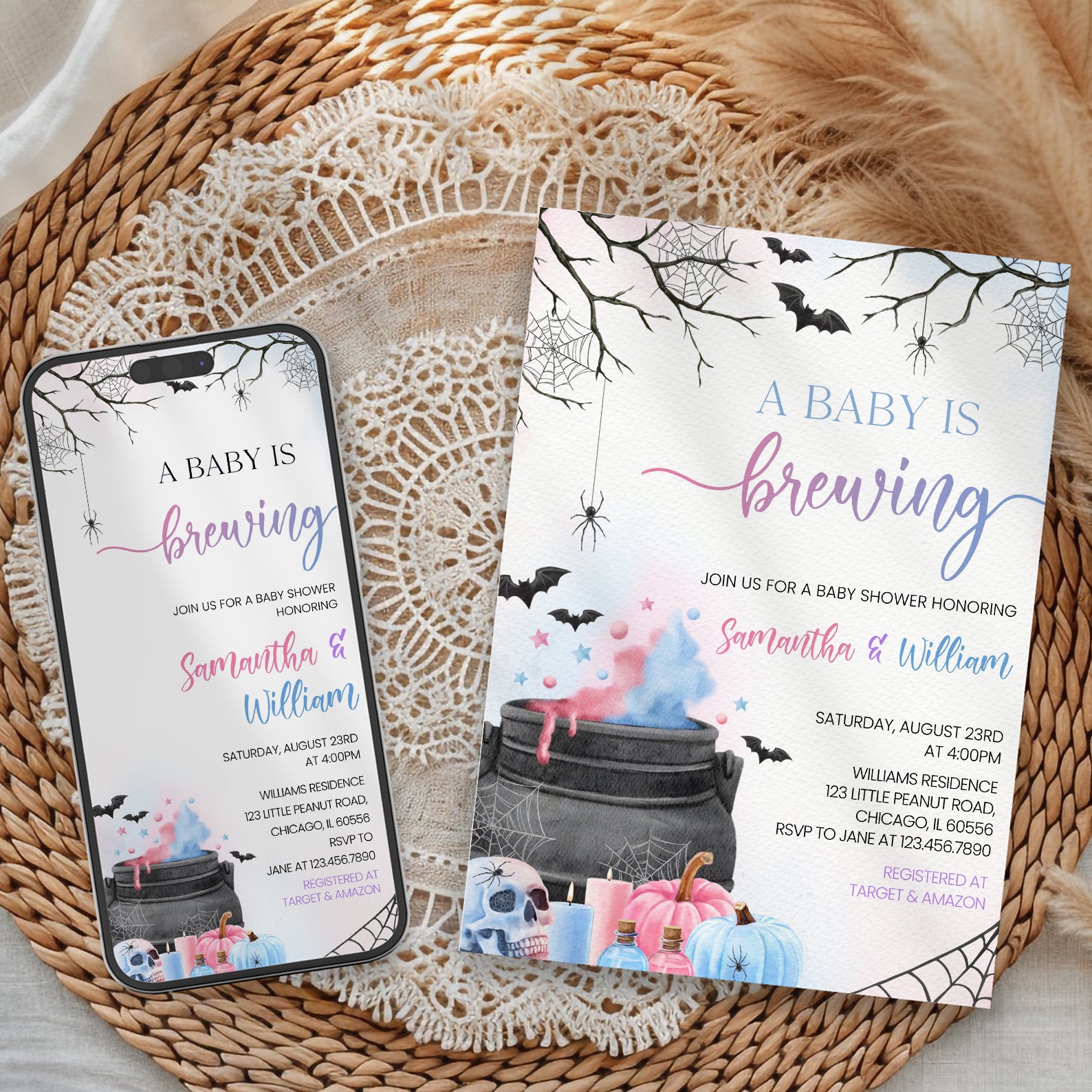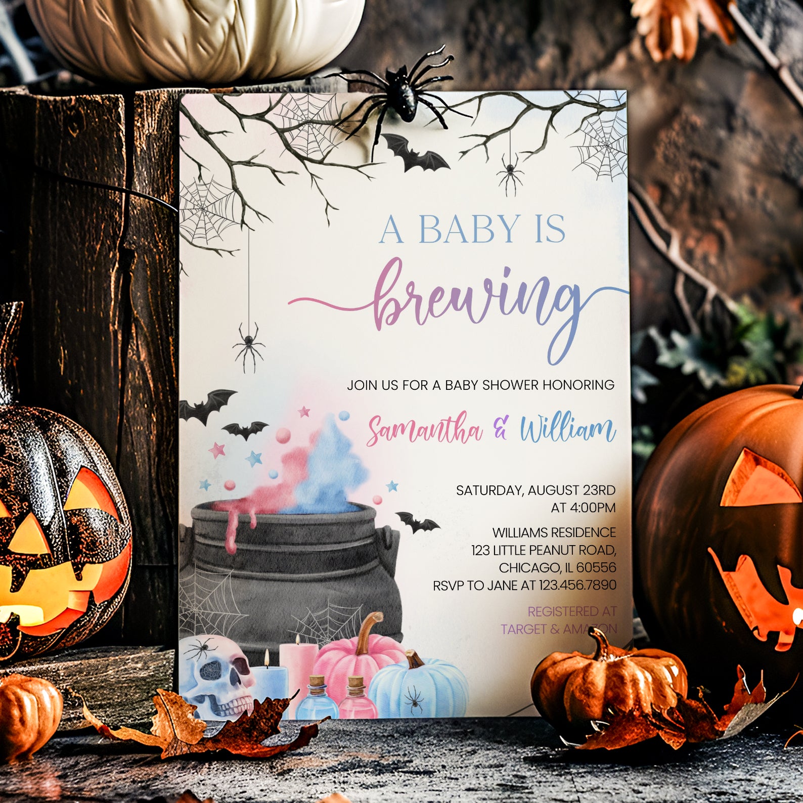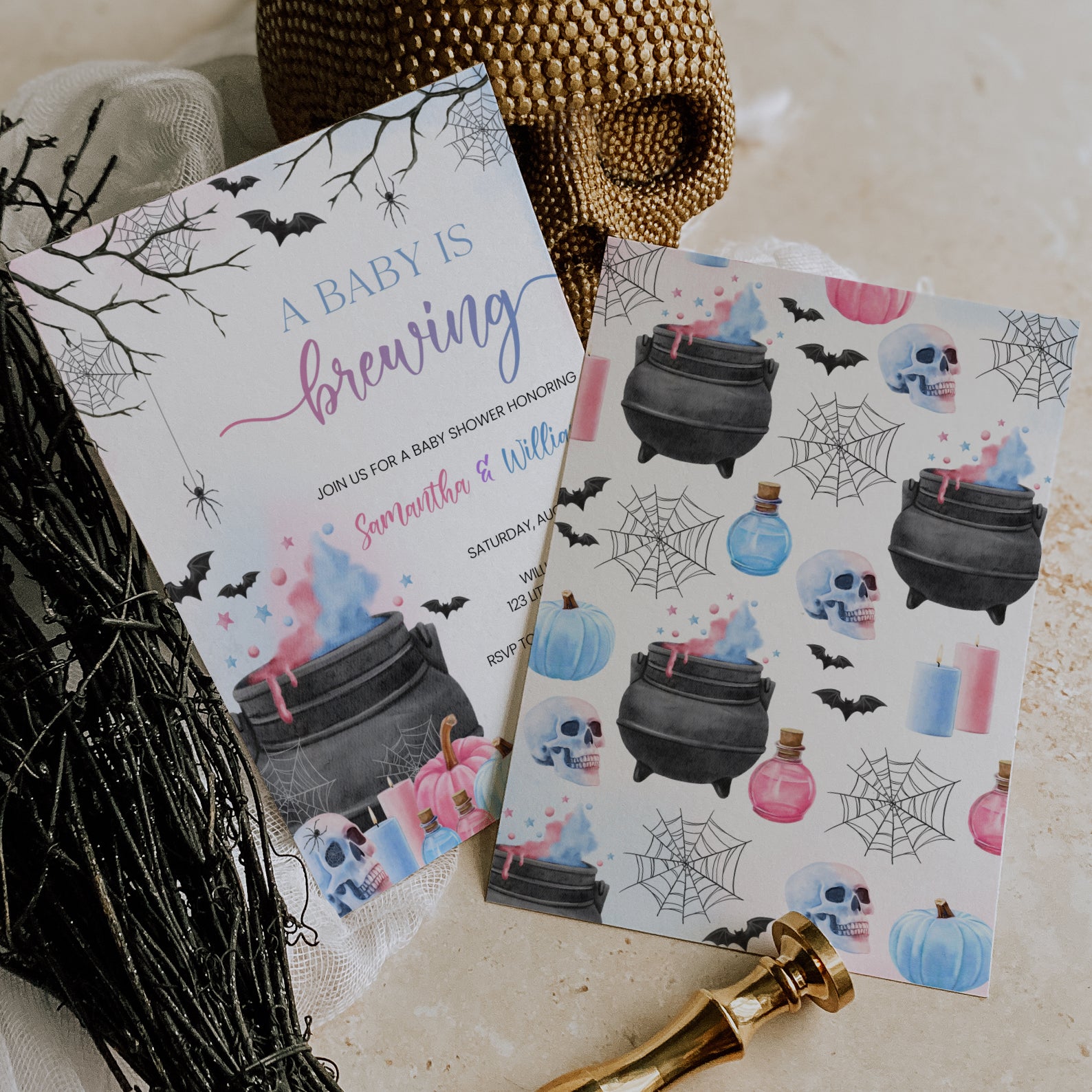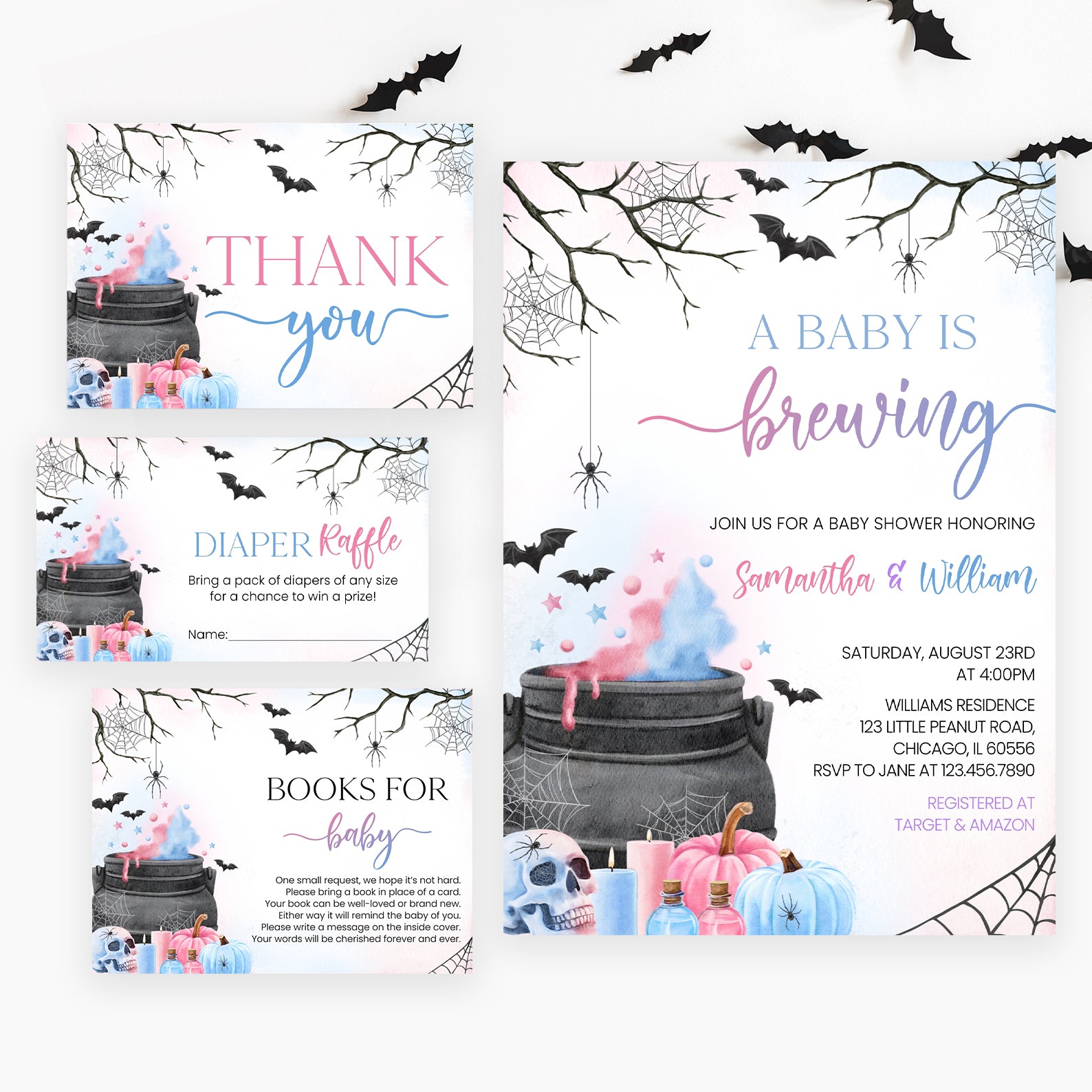 Invitation: Featuring a baby brewing in a cauldron with gender-neutral colors or shades of pink, blue, purple, or orange. Surrounded by whimsical bats, pumpkins, candles, spiders, and spider webs, this design sets a perfect Halloween mood.