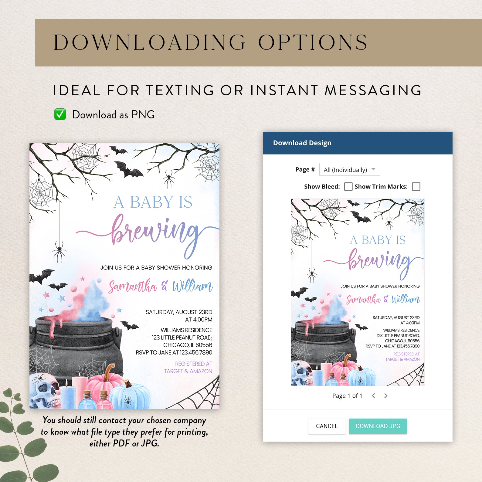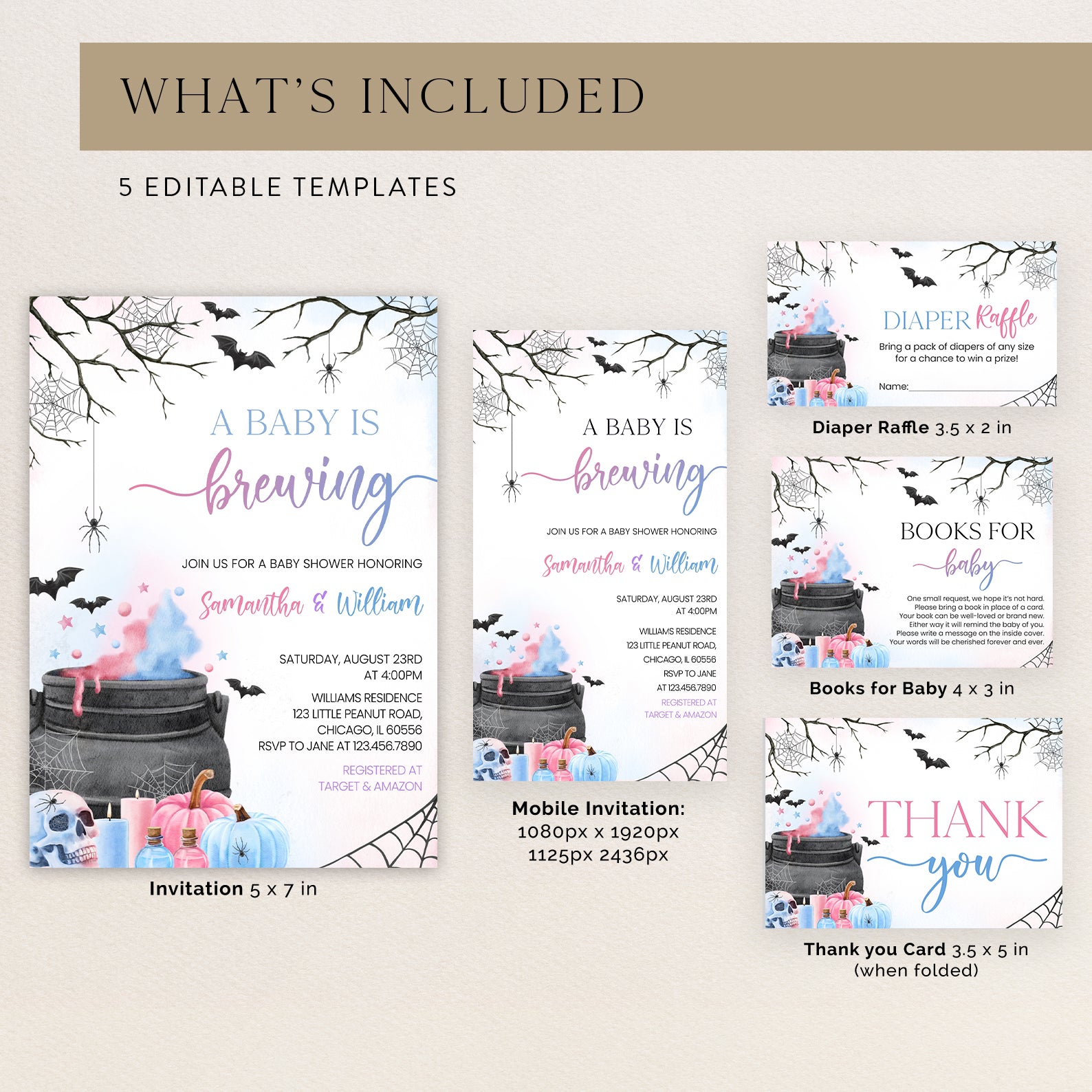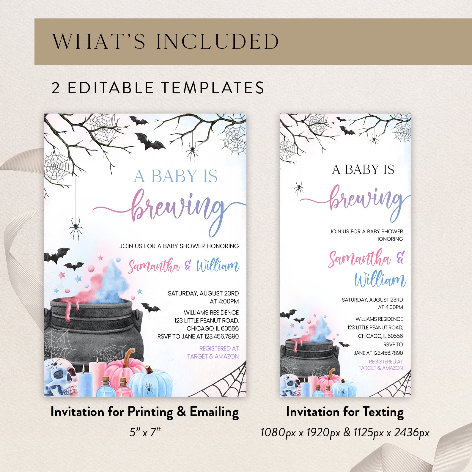 - Purchase this Baby Potion Brewing Invite Bundle: Spooky Bats, Webs, & Pumpkins template