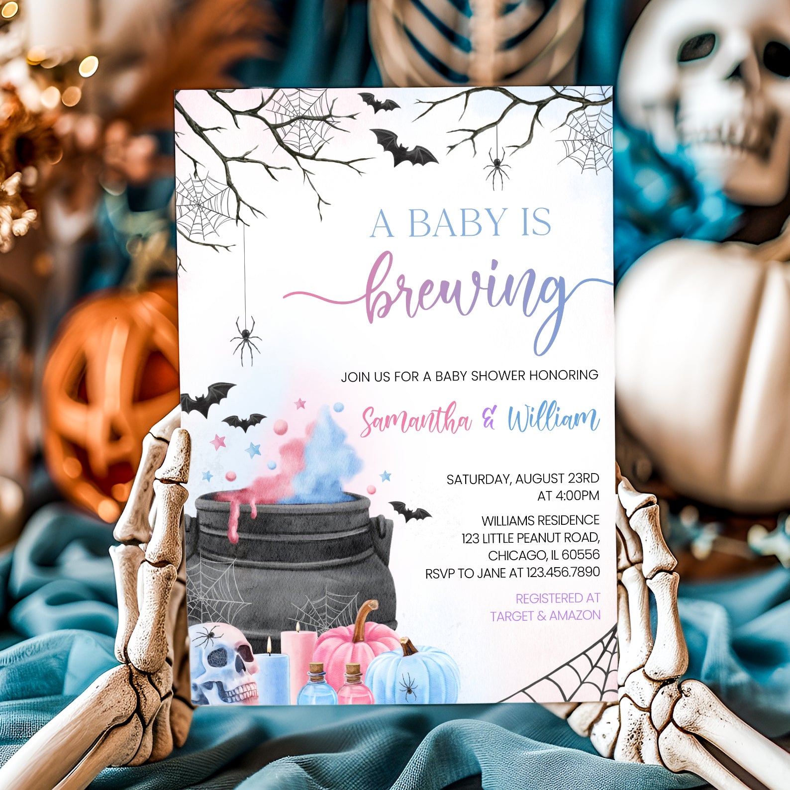 Celebrate the upcoming arrival of your little pumpkin with our adorable Halloween baby shower invitation! This spooktacular design features a baby brewing in a potion within a cauldron, with options for gender-neutral colors or variations of pink, blue, purple, or orange. Surrounded by bats, pumpkins, candles, spiders, spider webs, and other festive Halloween elements, this invitation is the perfect way to gather friends and family for a memorable celebration. Get ready for a spooktacular baby shower that's sure to be a hauntingly good time!