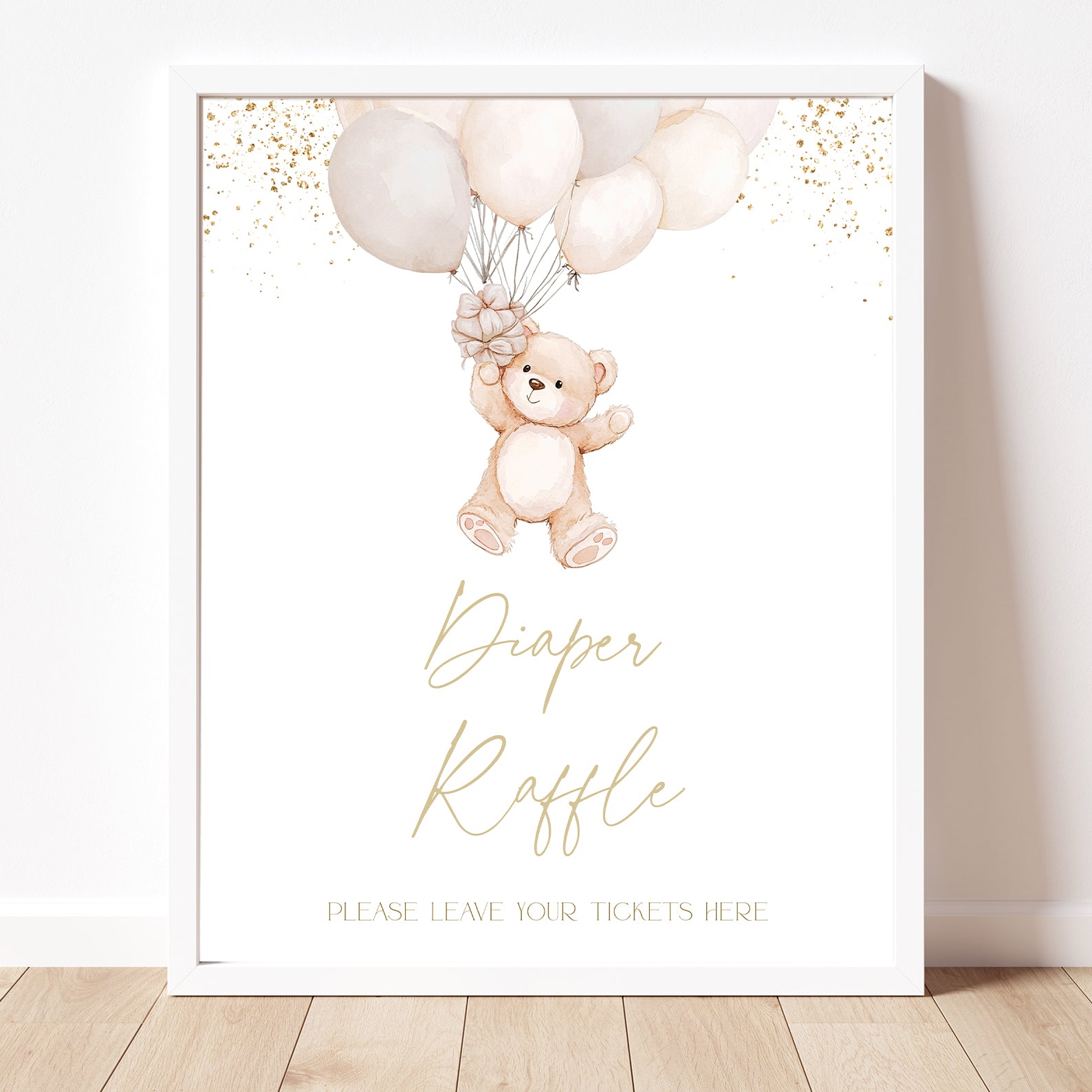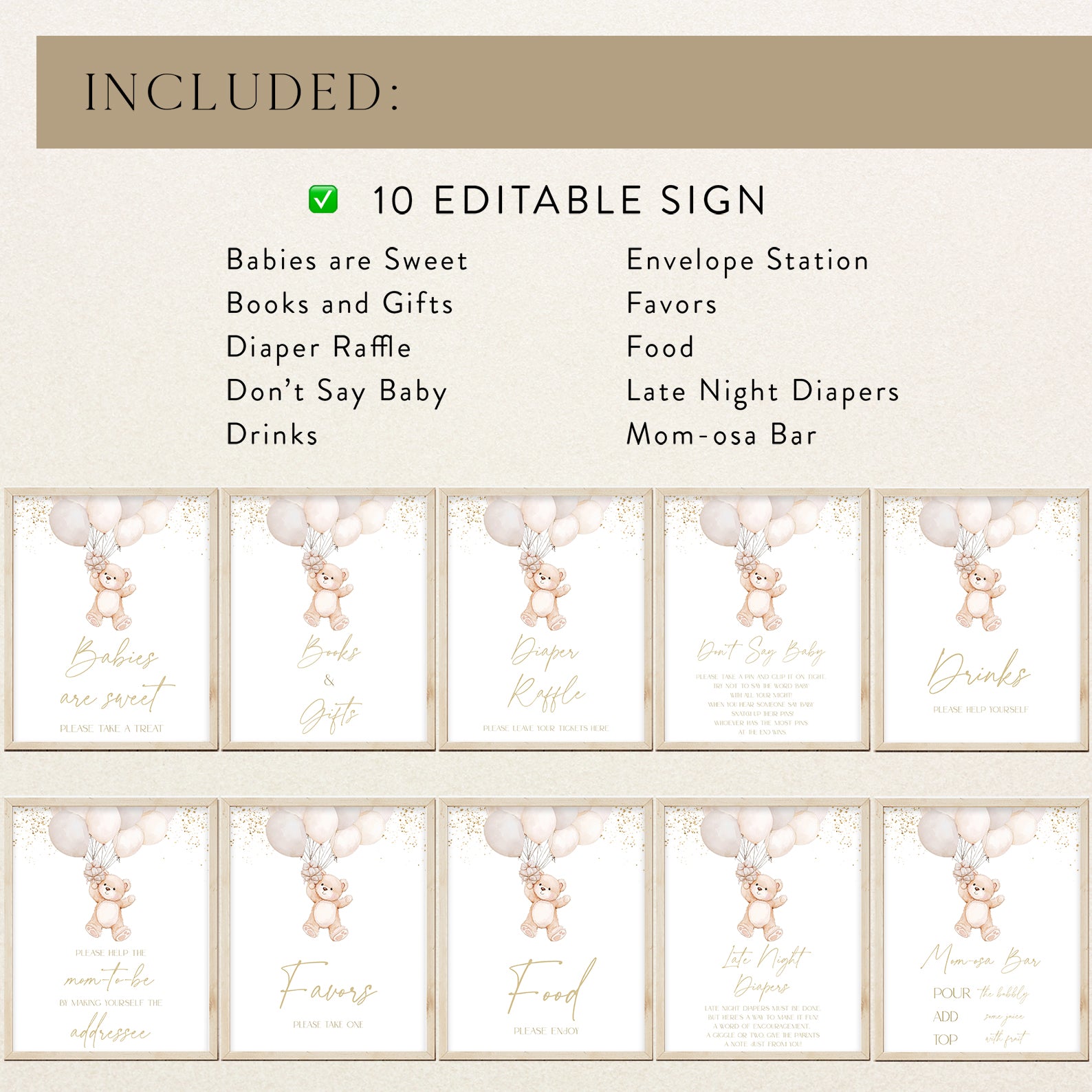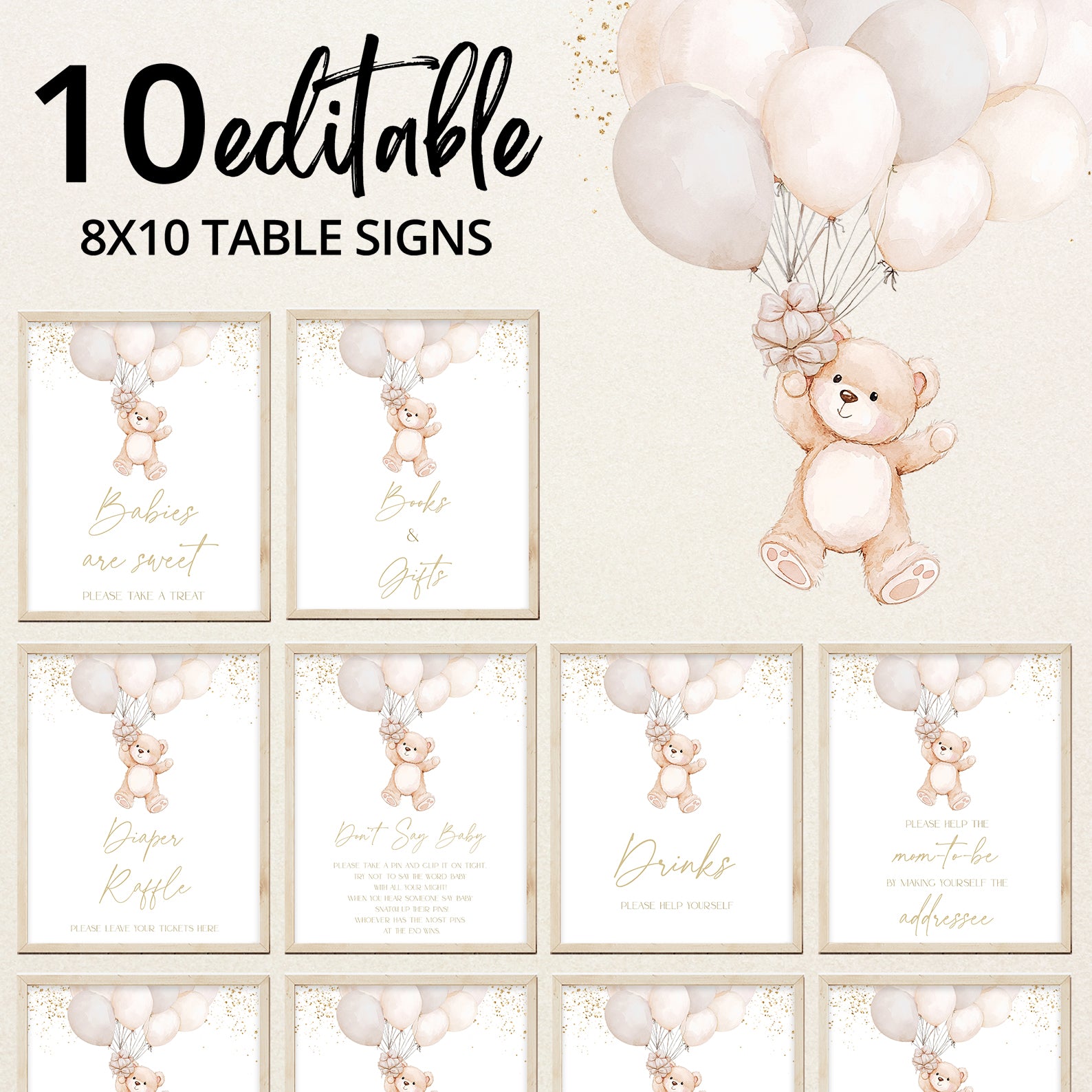 Add a charming touch to your baby shower with this set of ten editable table signs! Featuring elegant gold accents and an adorable bear holding a ribbon of watercolor balloons, these signs create a whimsical and inviting atmosphere. The set includes: Babies Are Sweet, Books and Gifts, Diaper Raffle Sign, Don't Say Baby, Drinks Sign, Envelope Station, Favors, Food Sign, Late Night Diapers, and Mom-osa Bar—perfect for a beautifully coordinated celebration!