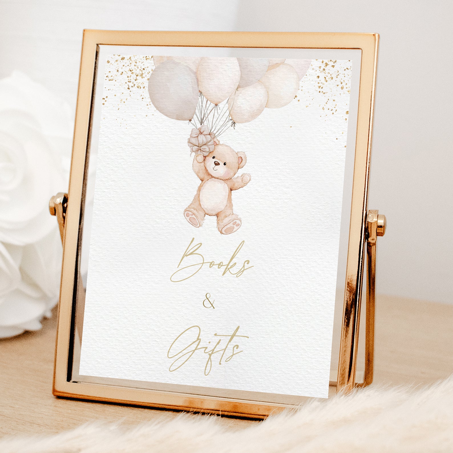 Baby Shower Digital Table Sign with Bear, Balloons & Gold Accents