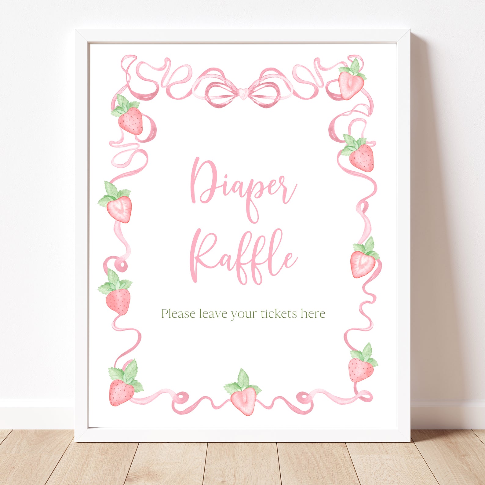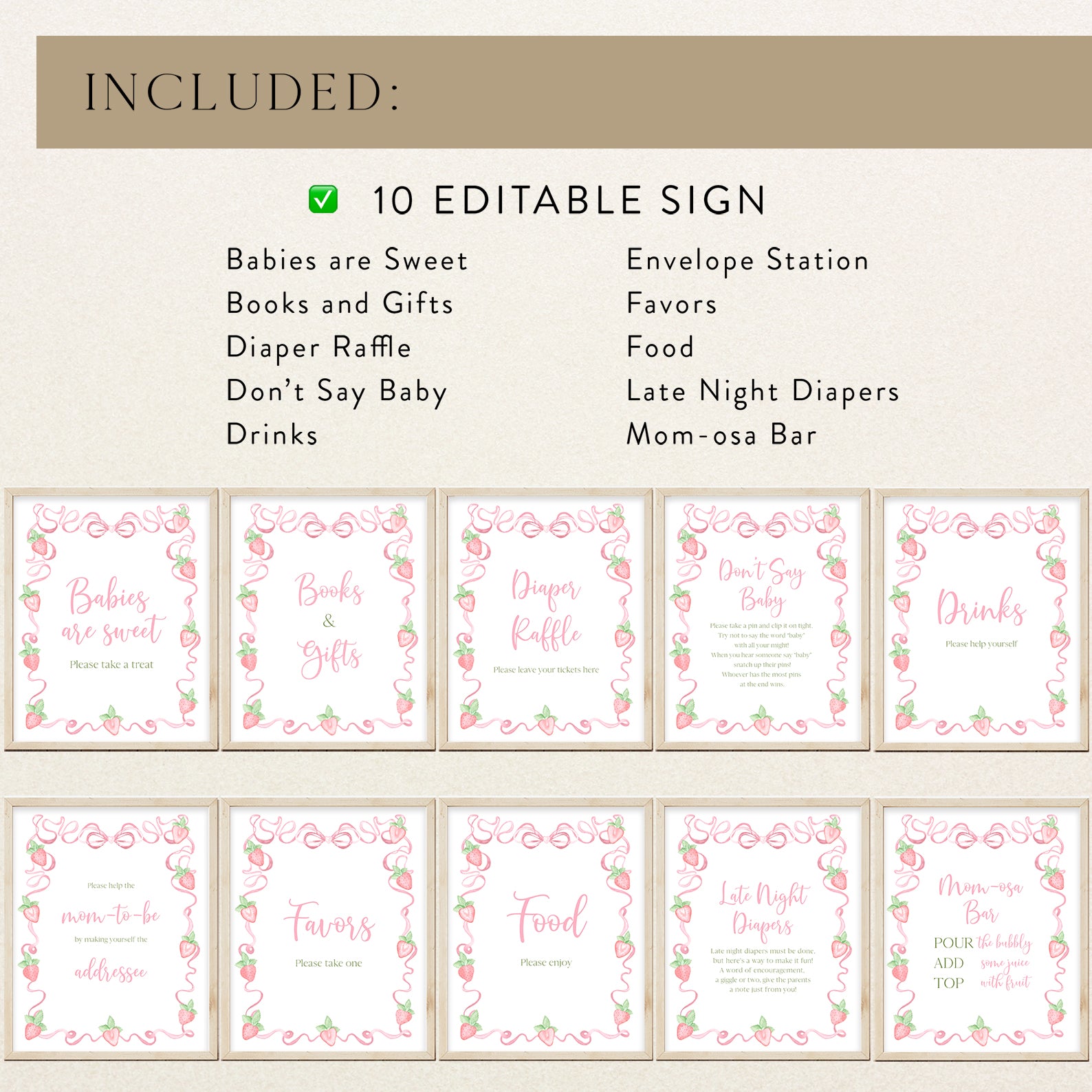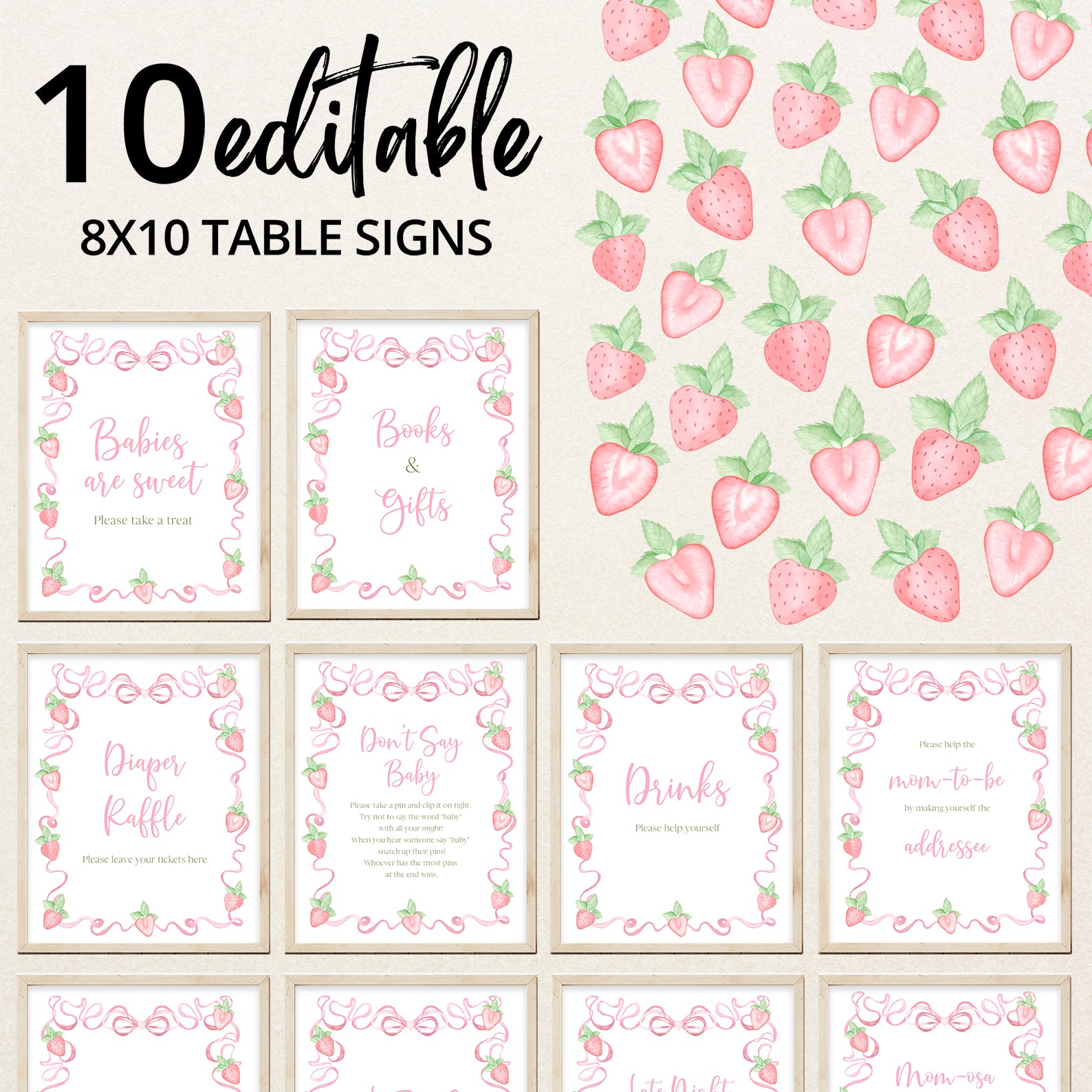 Add a sweet touch to your baby shower with this set of 10 editable table signs! Designed with soft pink watercolor berries and an elegant ribbon border, these signs bring charm and elegance to your celebration. Perfect for guiding guests to key stations, including Babies Are Sweet, Books & Gifts, Diaper Raffle, Don't Say Baby, Drinks, Envelope Station, Favors, Food, Late Night Diapers, and Mom-osa Bar. A beautiful addition to your berry-sweet event!