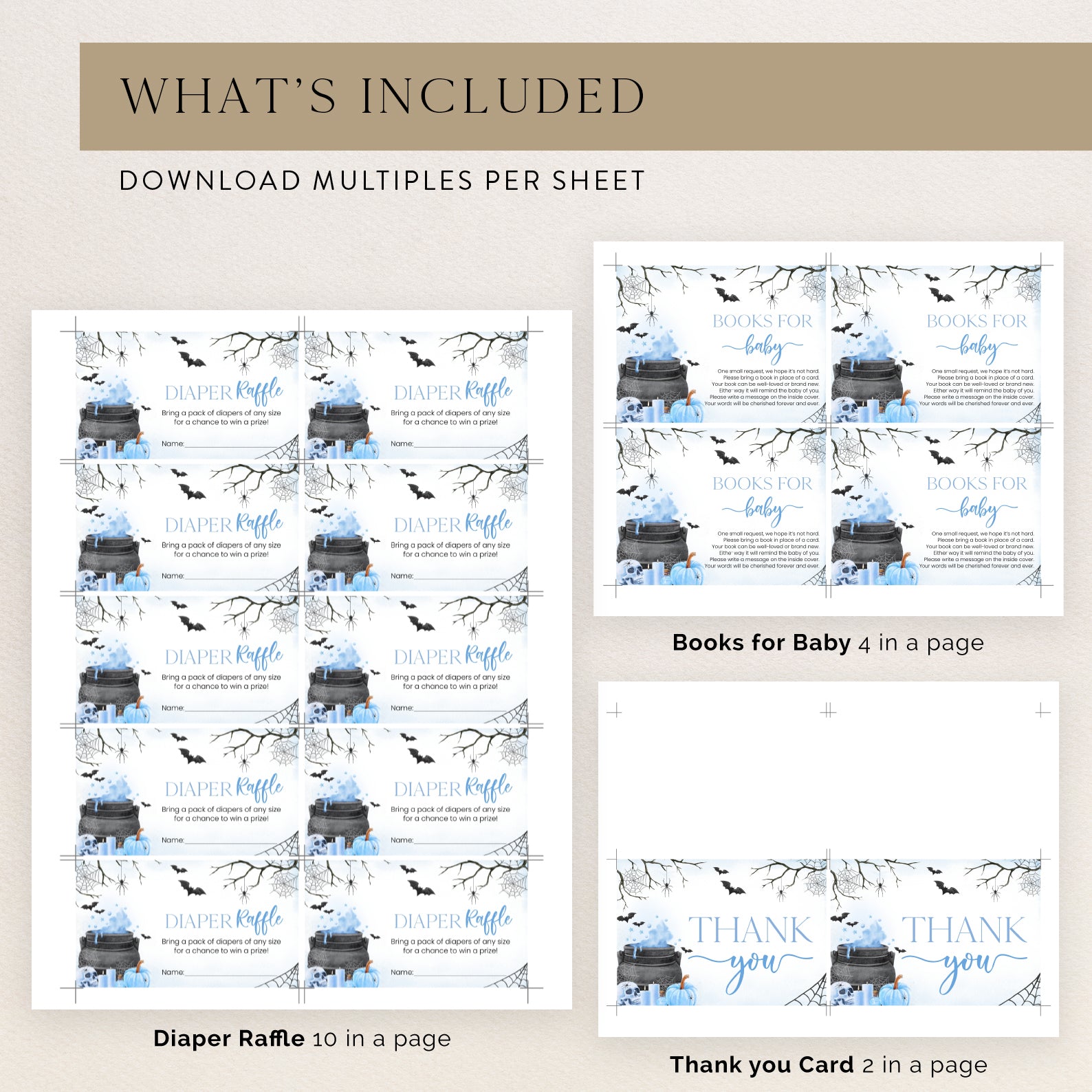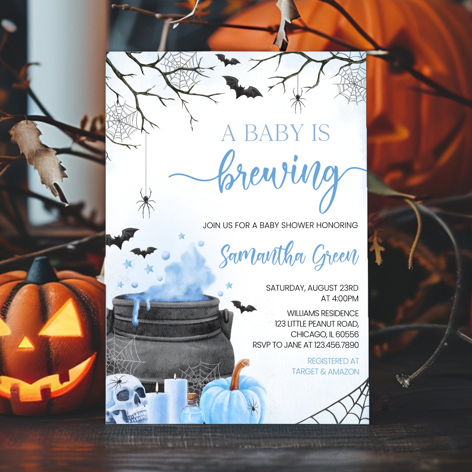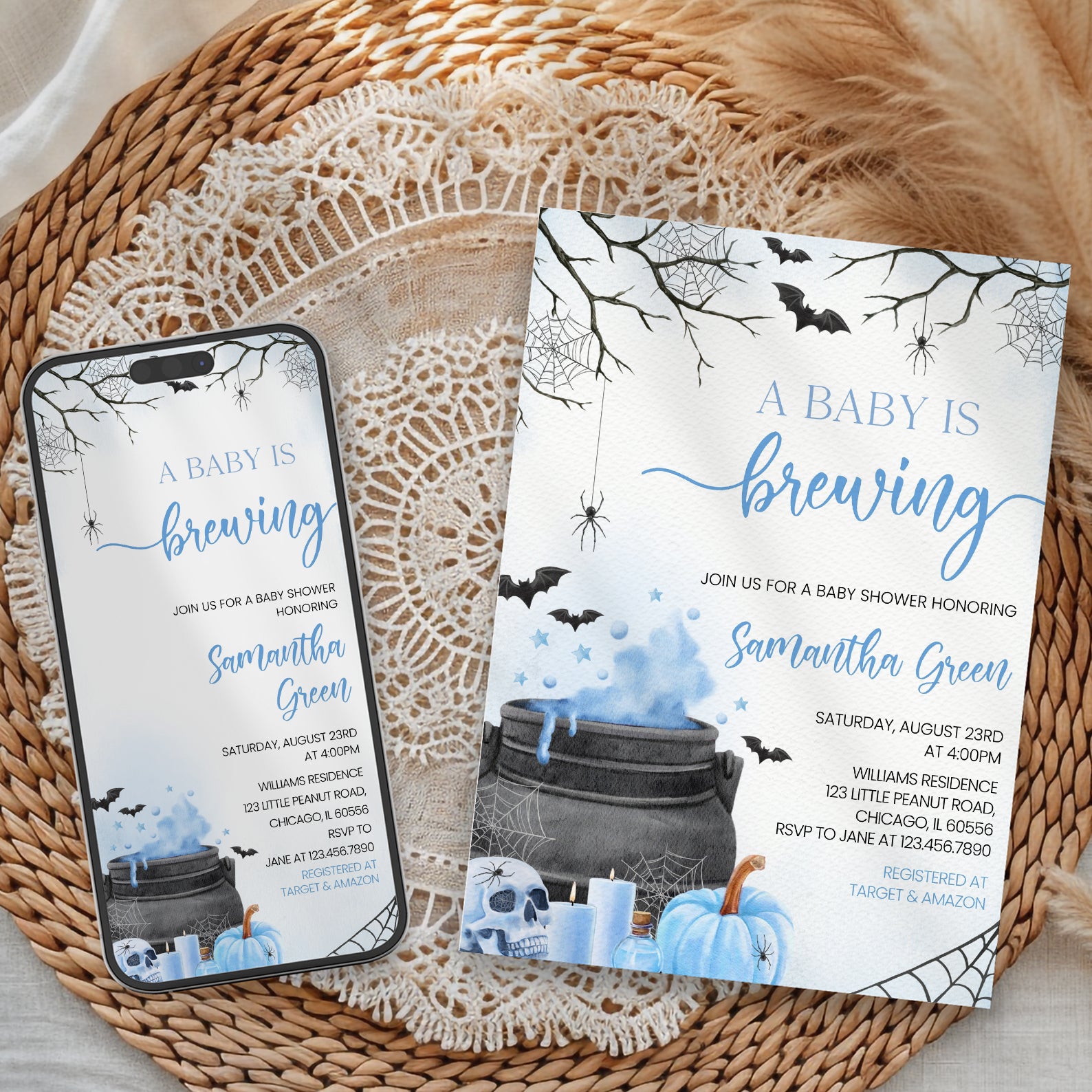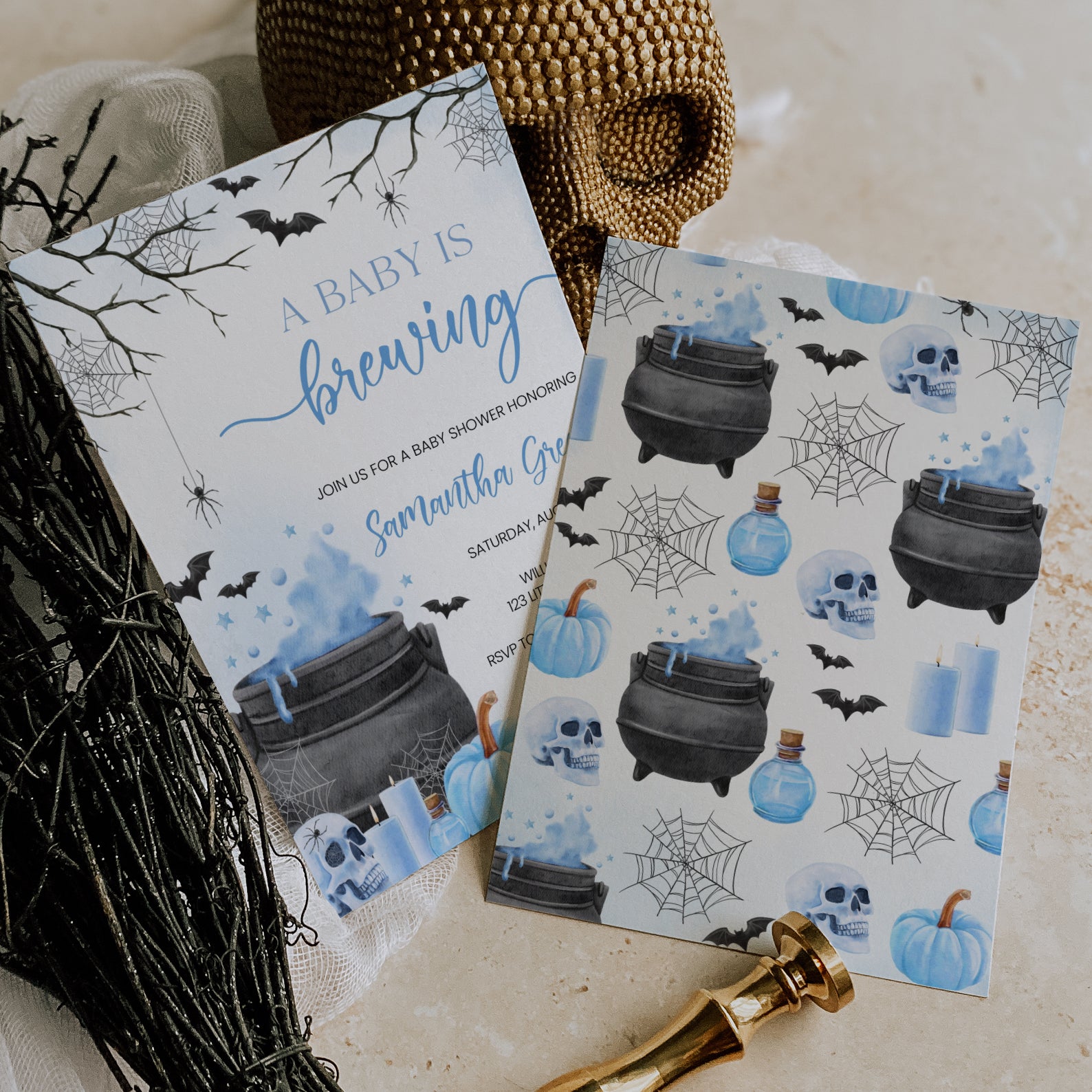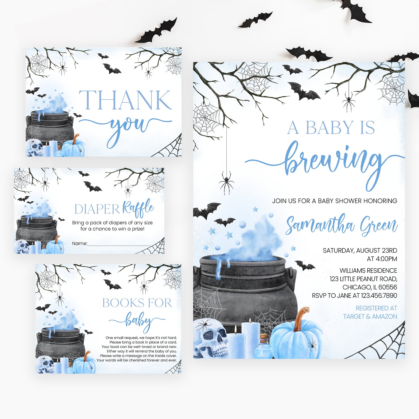 Blue Baby Potion Brewing Invite Bundle: Spooky Bats, Webs, & Pumpkins