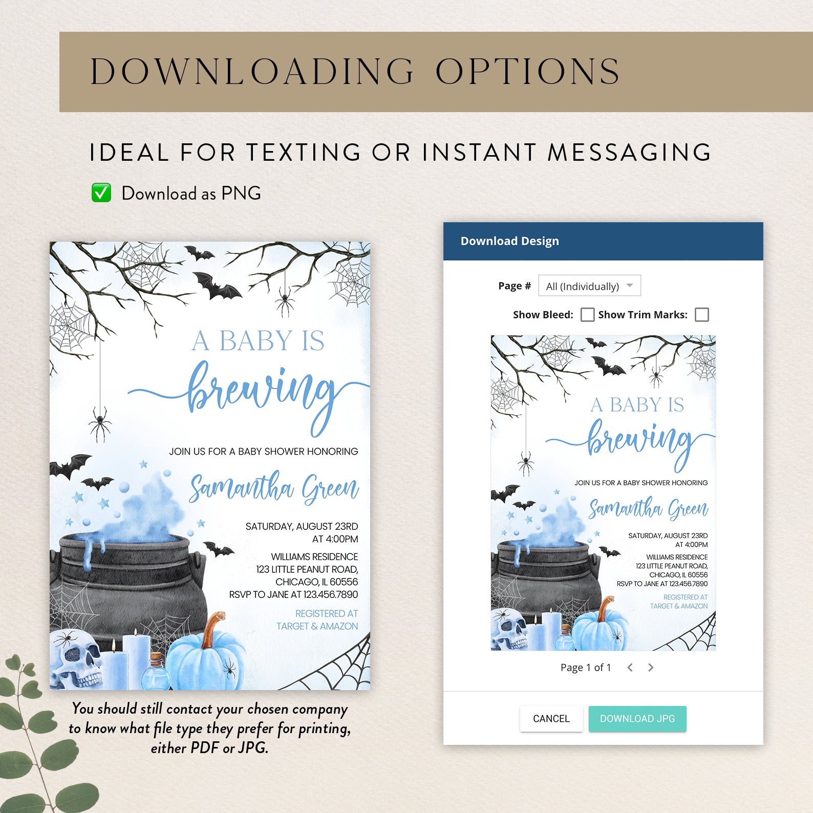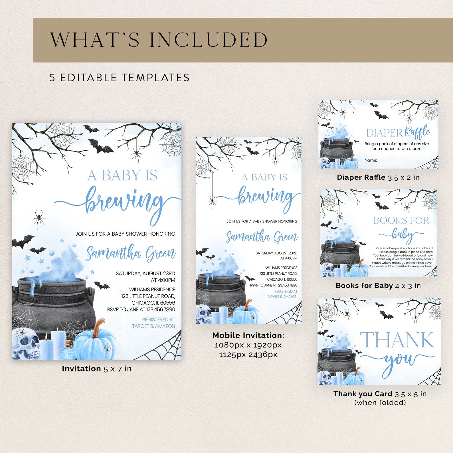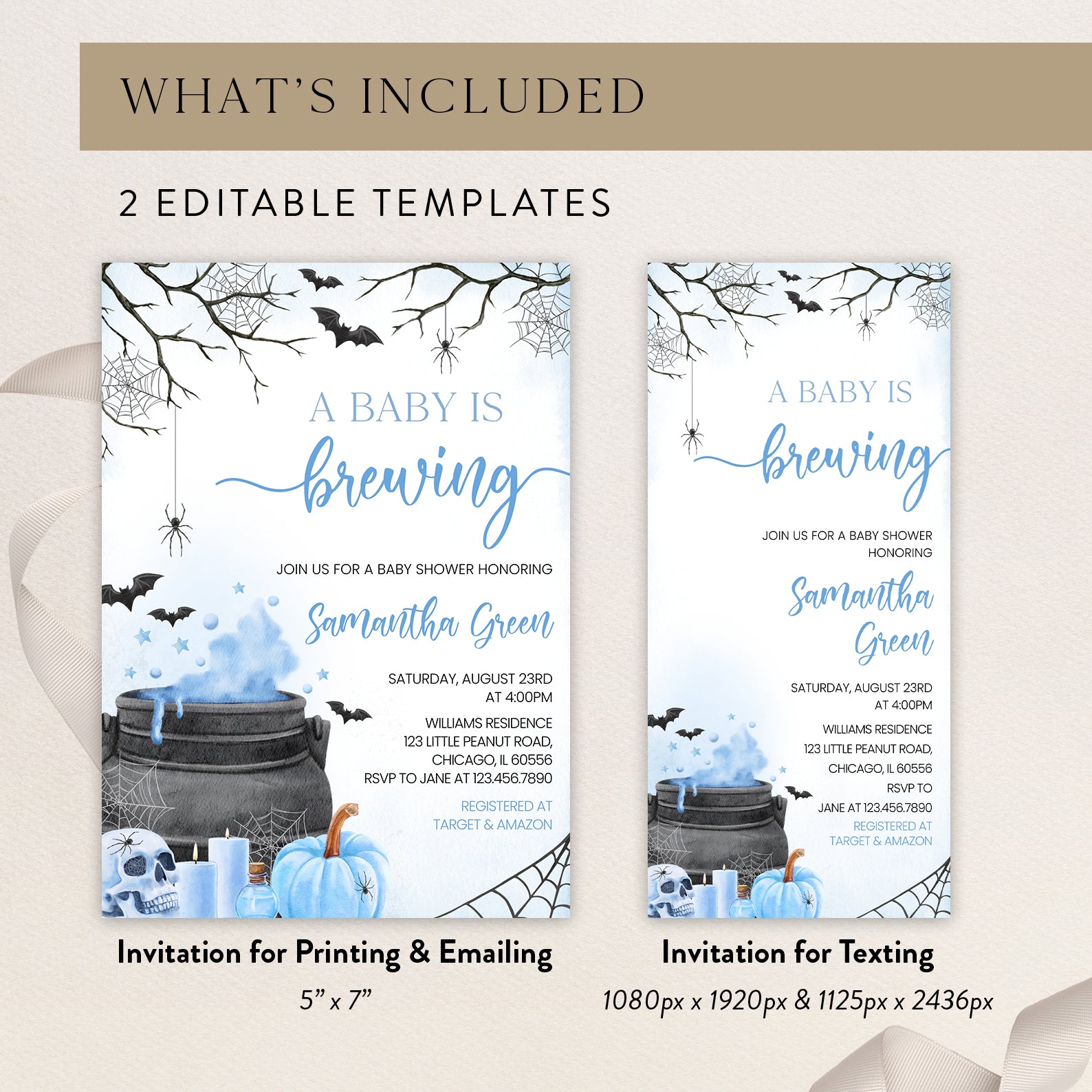 - Purchase this Blue Baby Potion Brewing Invite Bundle: Spooky Bats, Webs, & Pumpkins template
