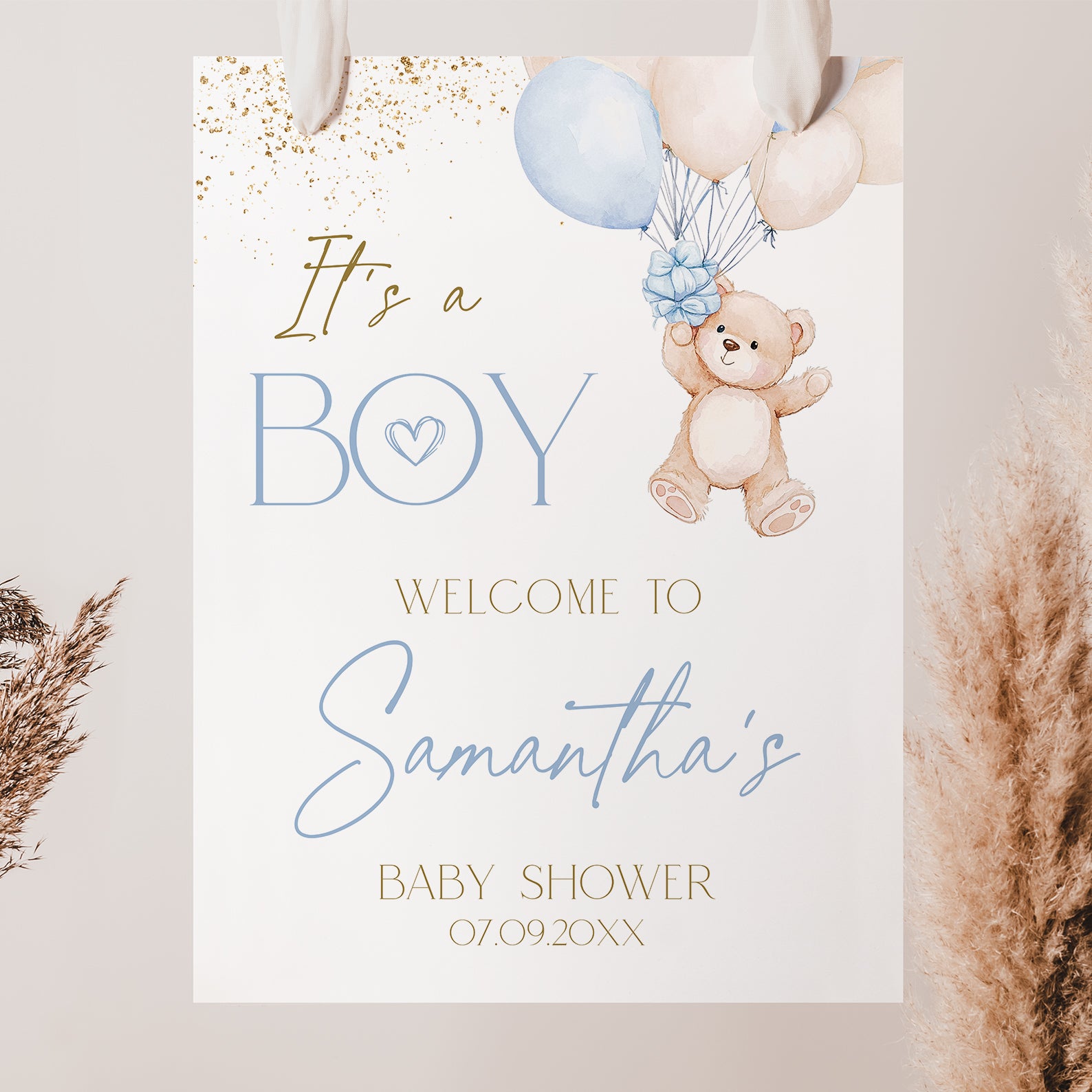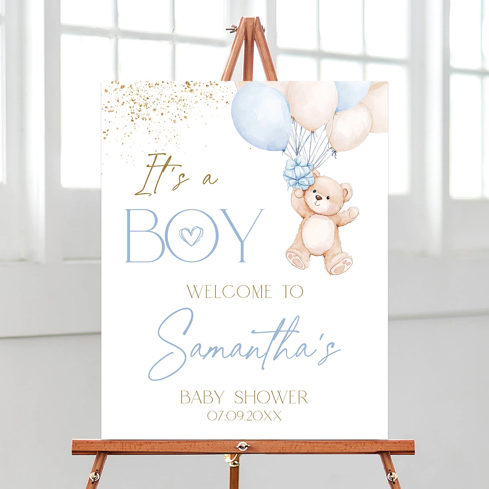 Blue Baby Shower Digital Welcome Sign with Bear, Balloons & Gold Accents