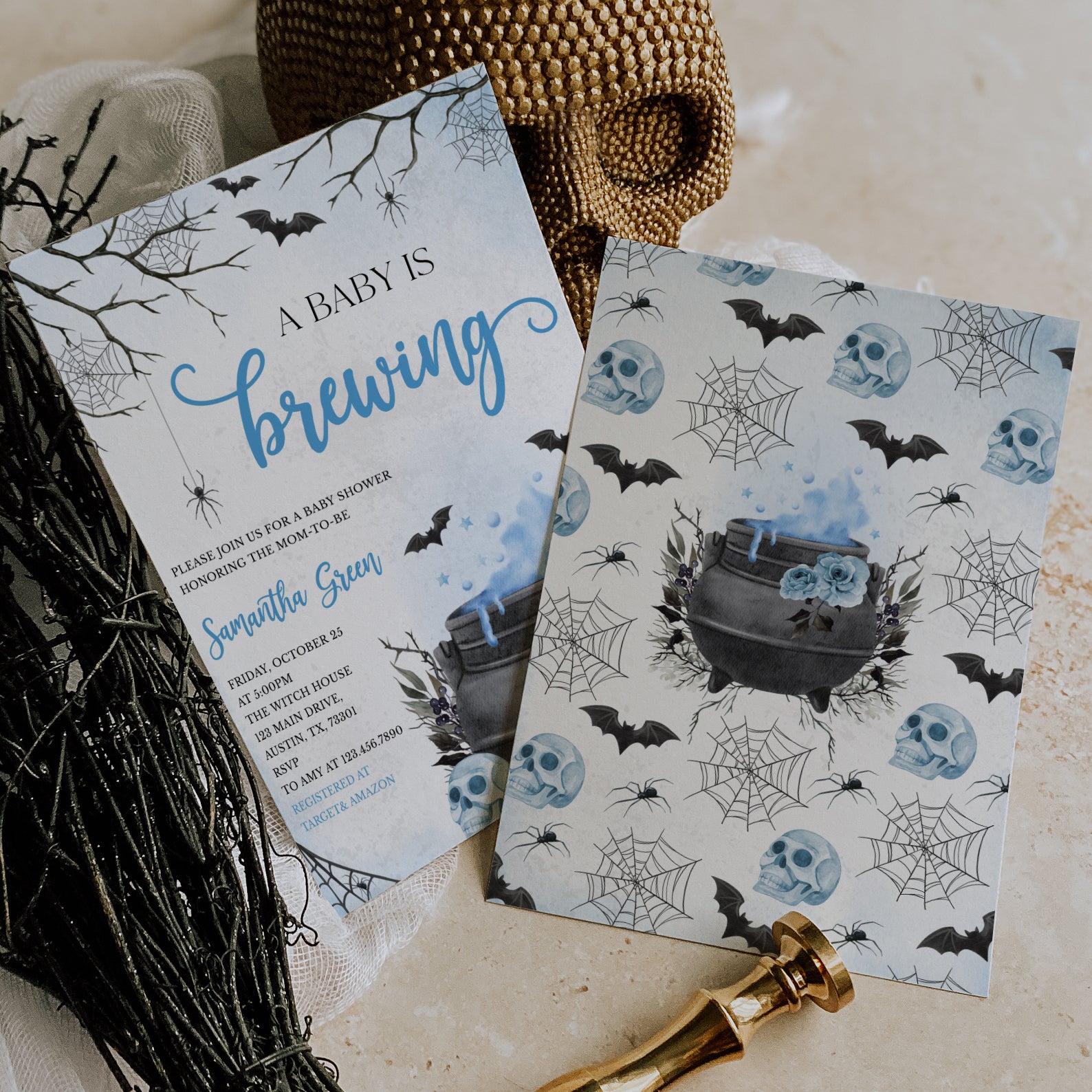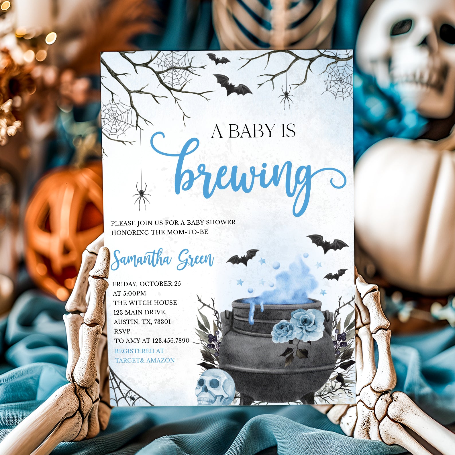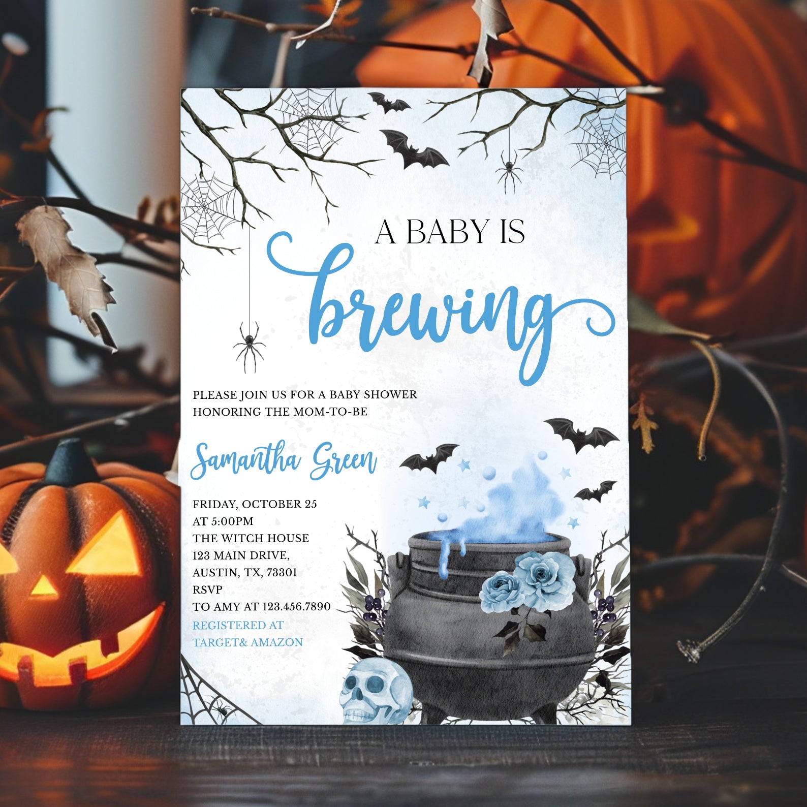 - Purchase this Blue Digital Invite: 'A Baby is Brewing' with Spooky Cauldron Fun template