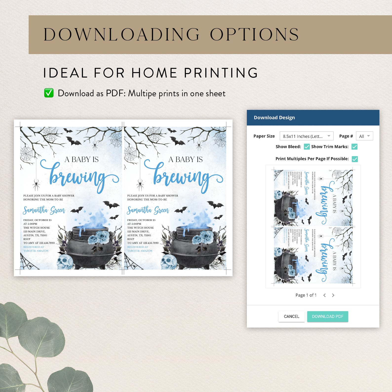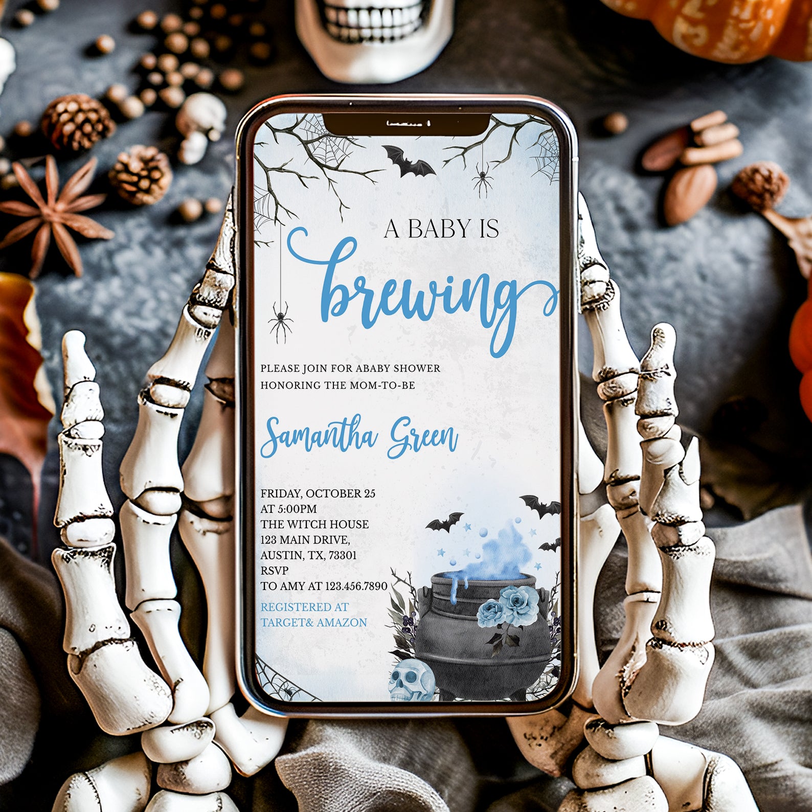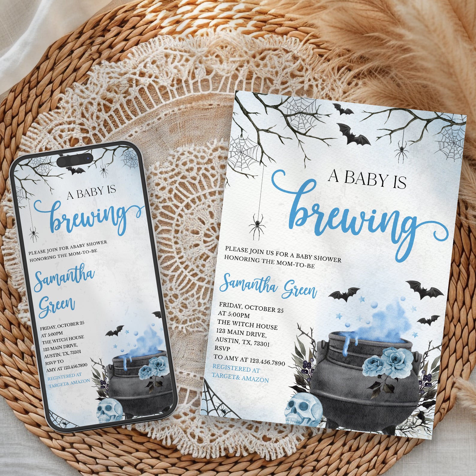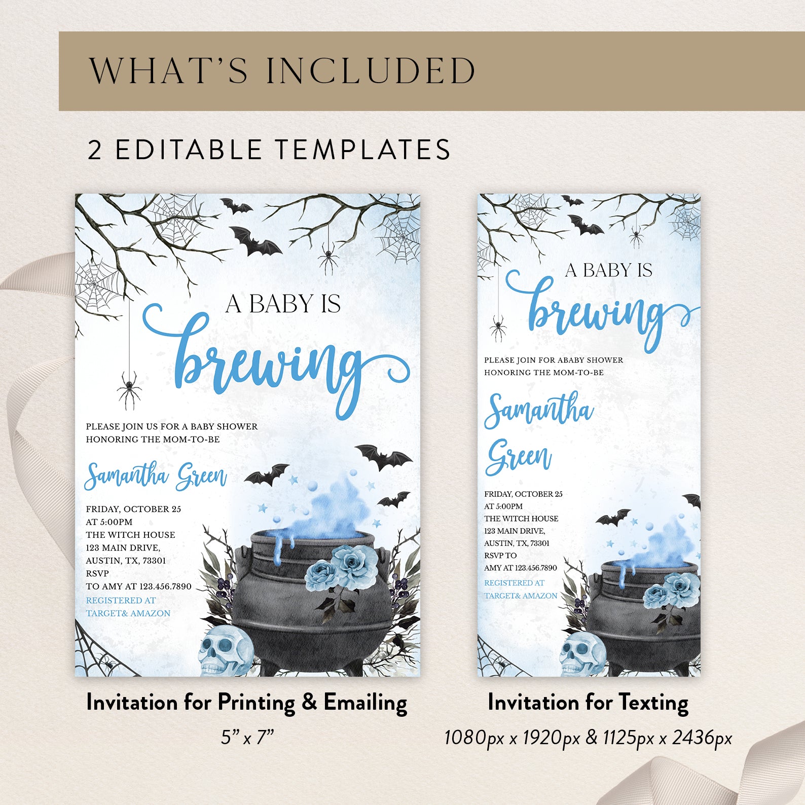- Purchase this Blue Digital Invite: 'A Baby is Brewing' with Spooky Cauldron Fun template