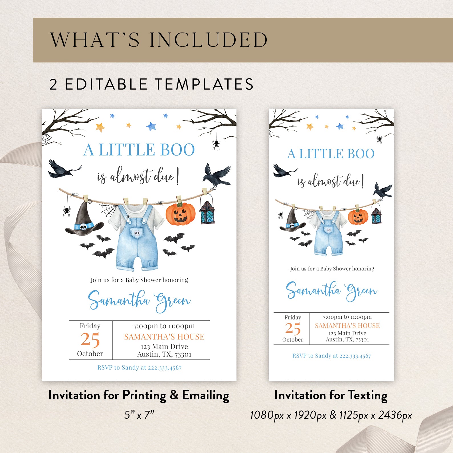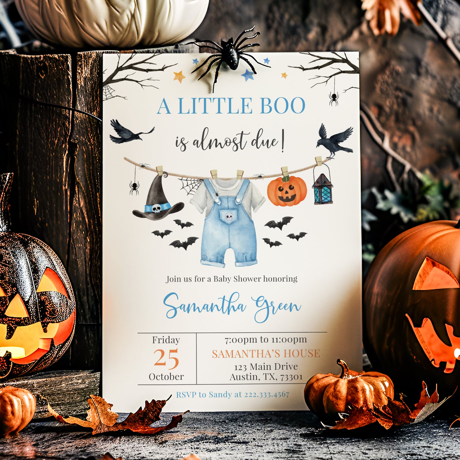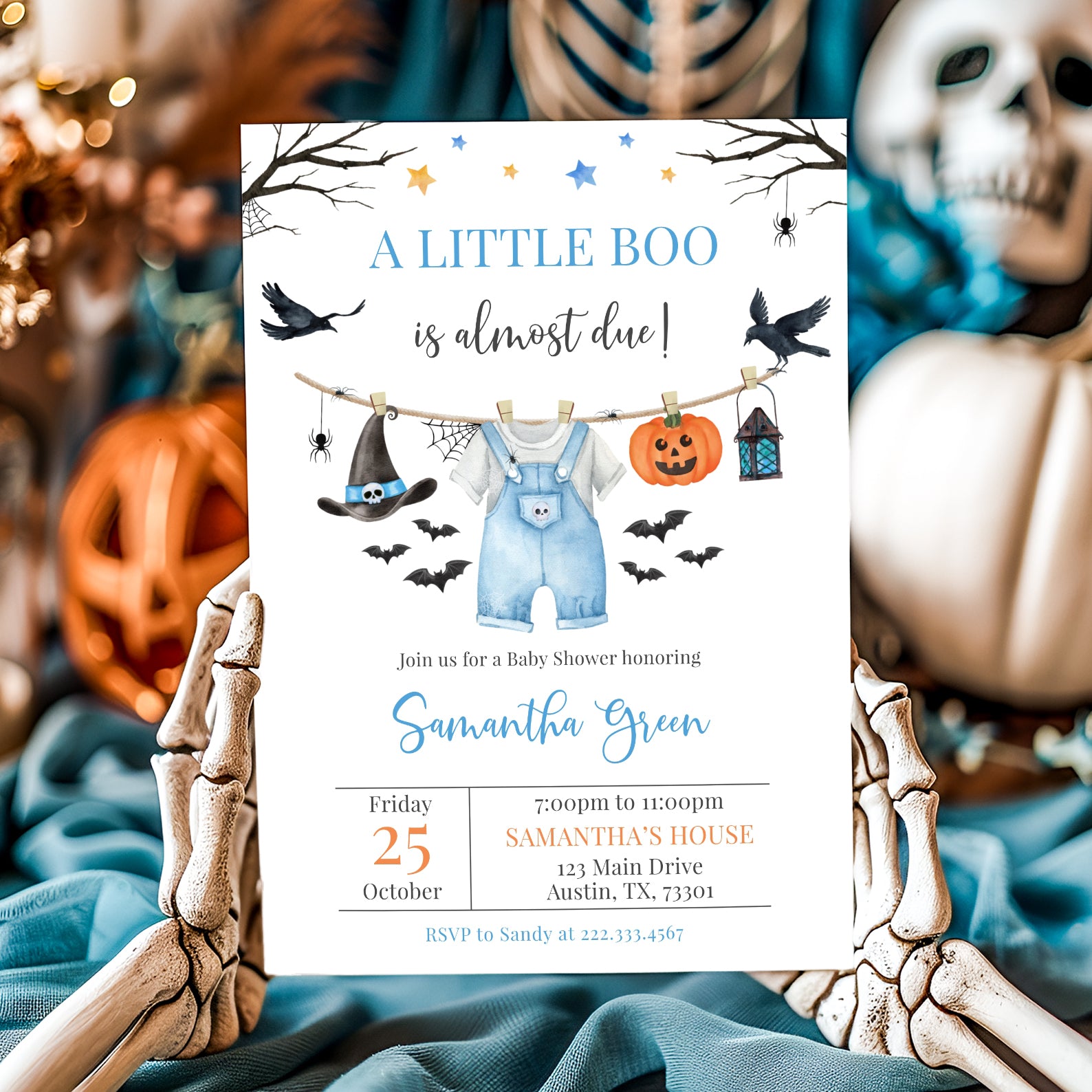 1. Purchase this Blue Halloween Baby Shower Invite: Stars, Crows & Jumpsuit template