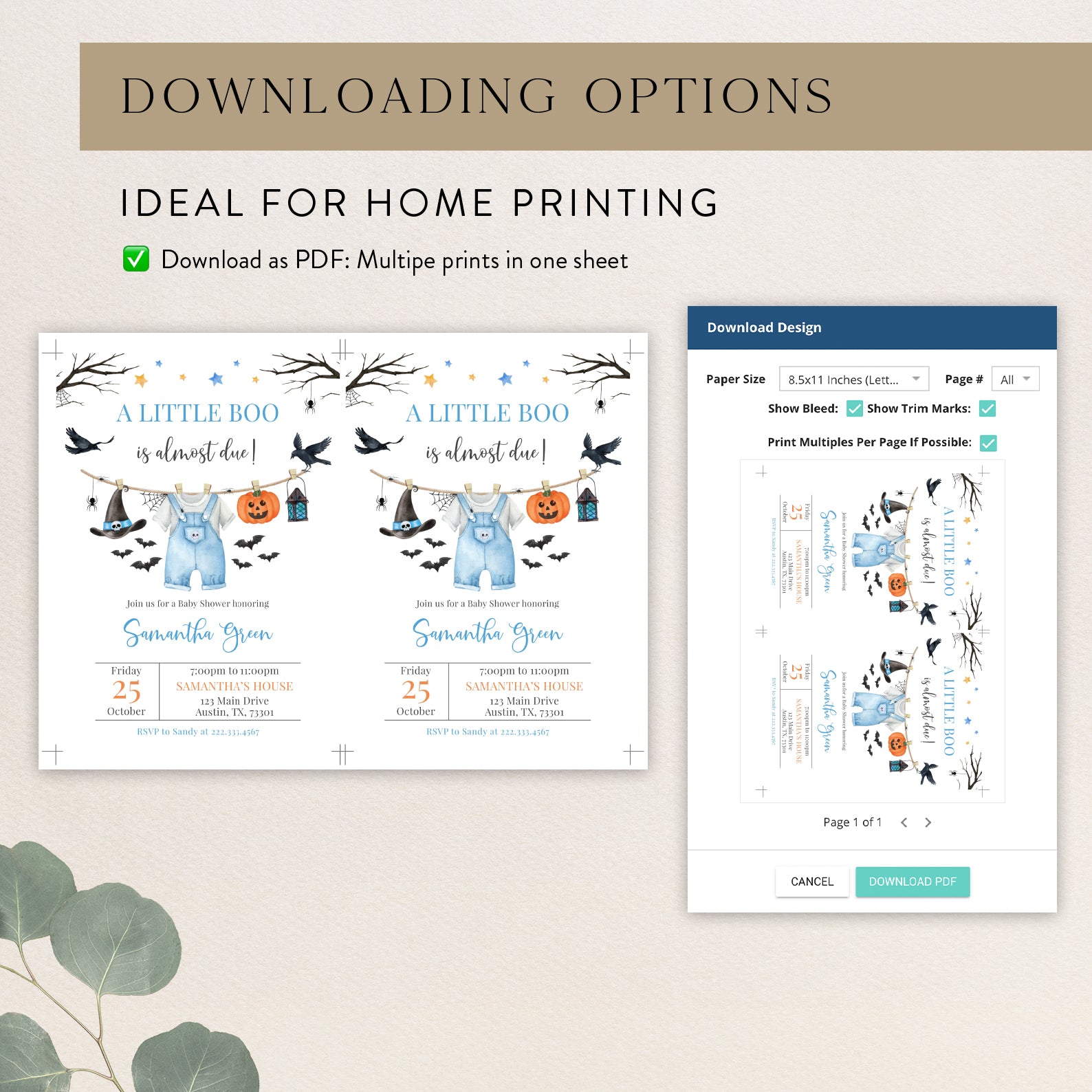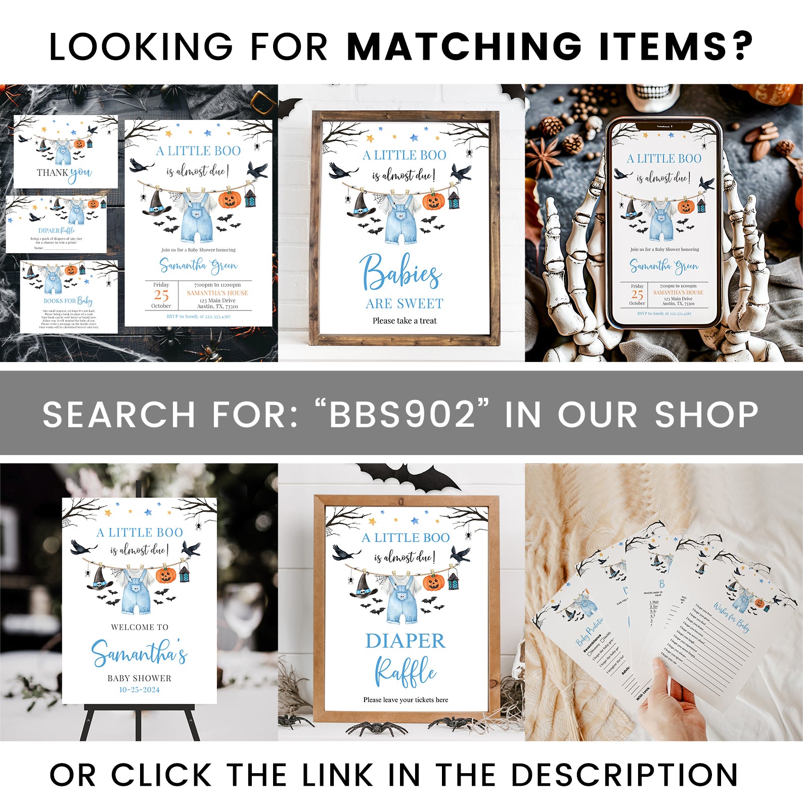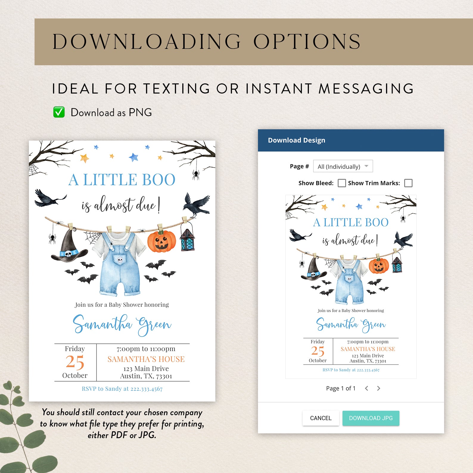 1. Purchase this Blue Halloween Baby Shower Invite: Stars, Crows & Jumpsuit template