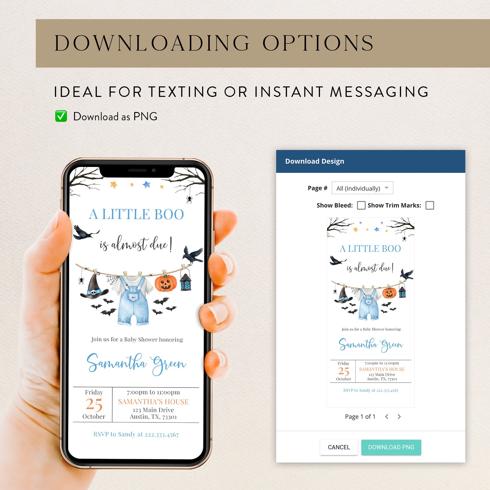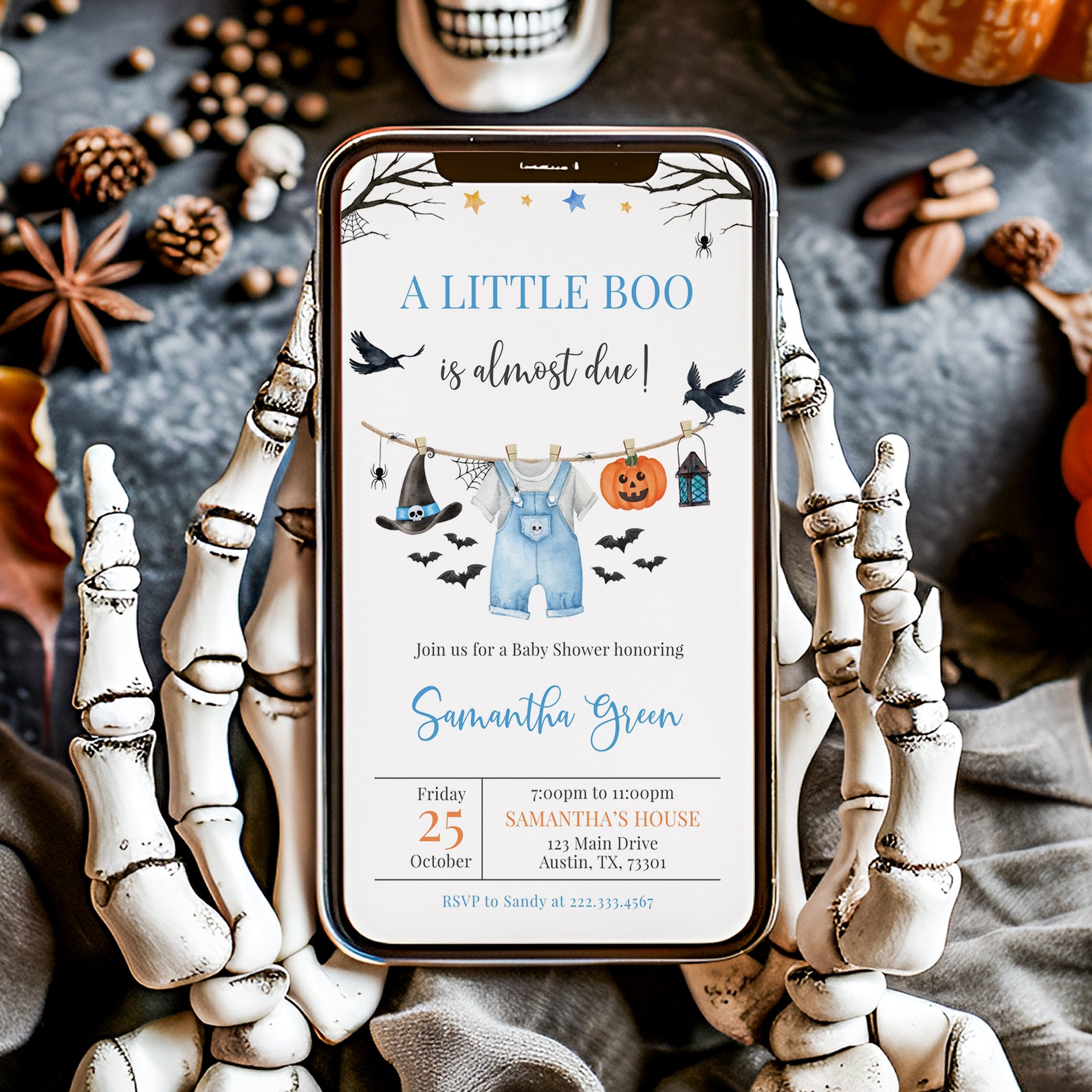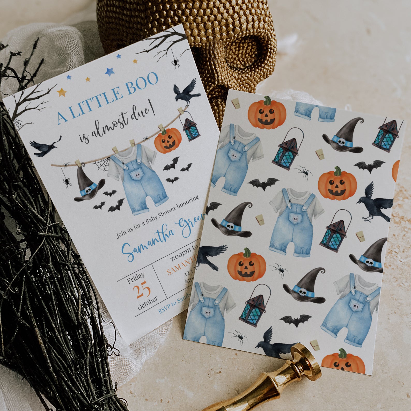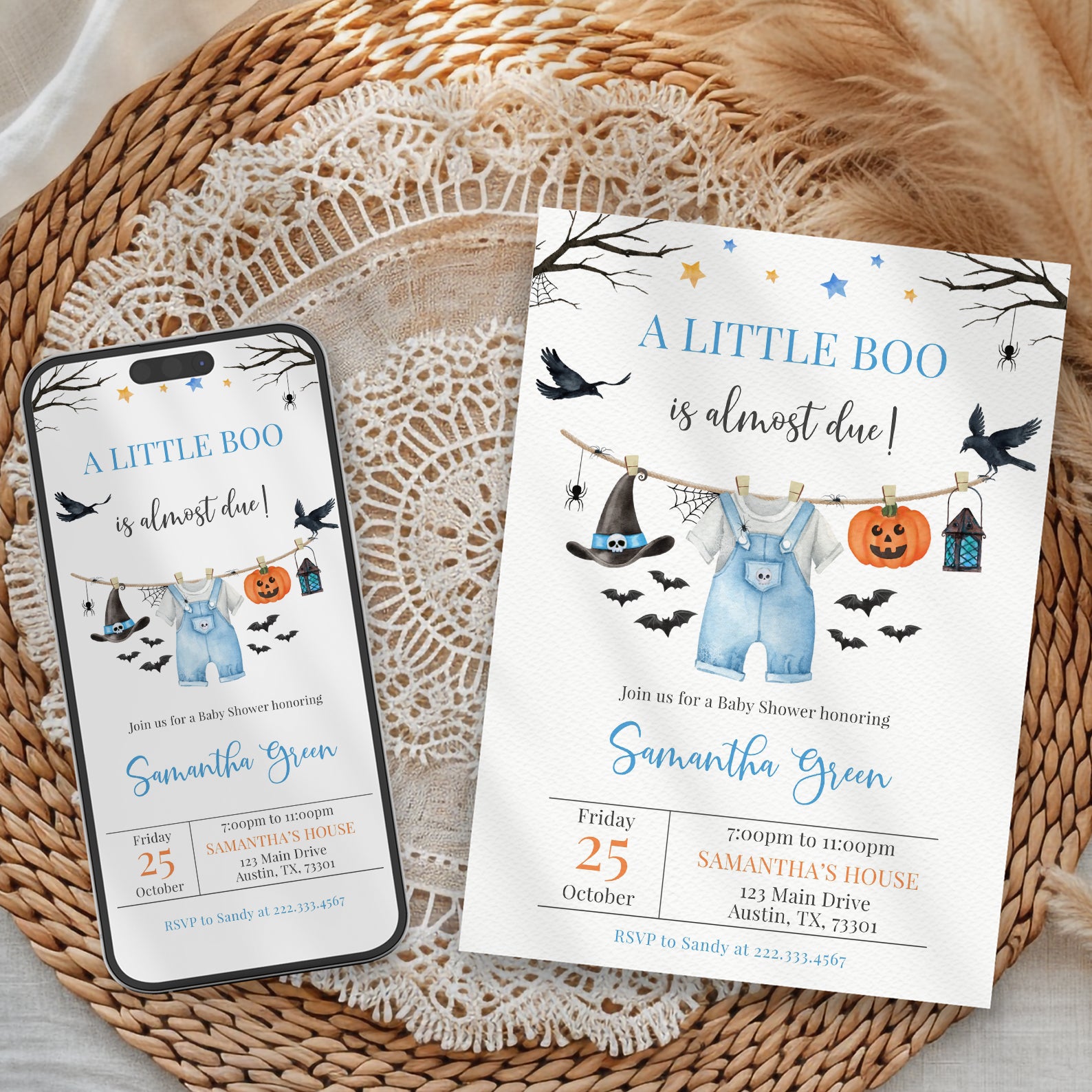 Celebrate the upcoming arrival of your little one with our enchanting Halloween baby shower digital invitation! Available in a choice of pink or blue, this design features whimsical stars and spooky tree branches, setting the perfect atmosphere for your festive gathering. Adorned with a charming jumpsuit and witch hat, along with playful pumpkins, lanterns, and a sprinkle of falling spiders and flying bats, this invitation captures the spirit of Halloween while welcoming your newest addition. Make your baby shower unforgettable with this delightful and unique invitation!