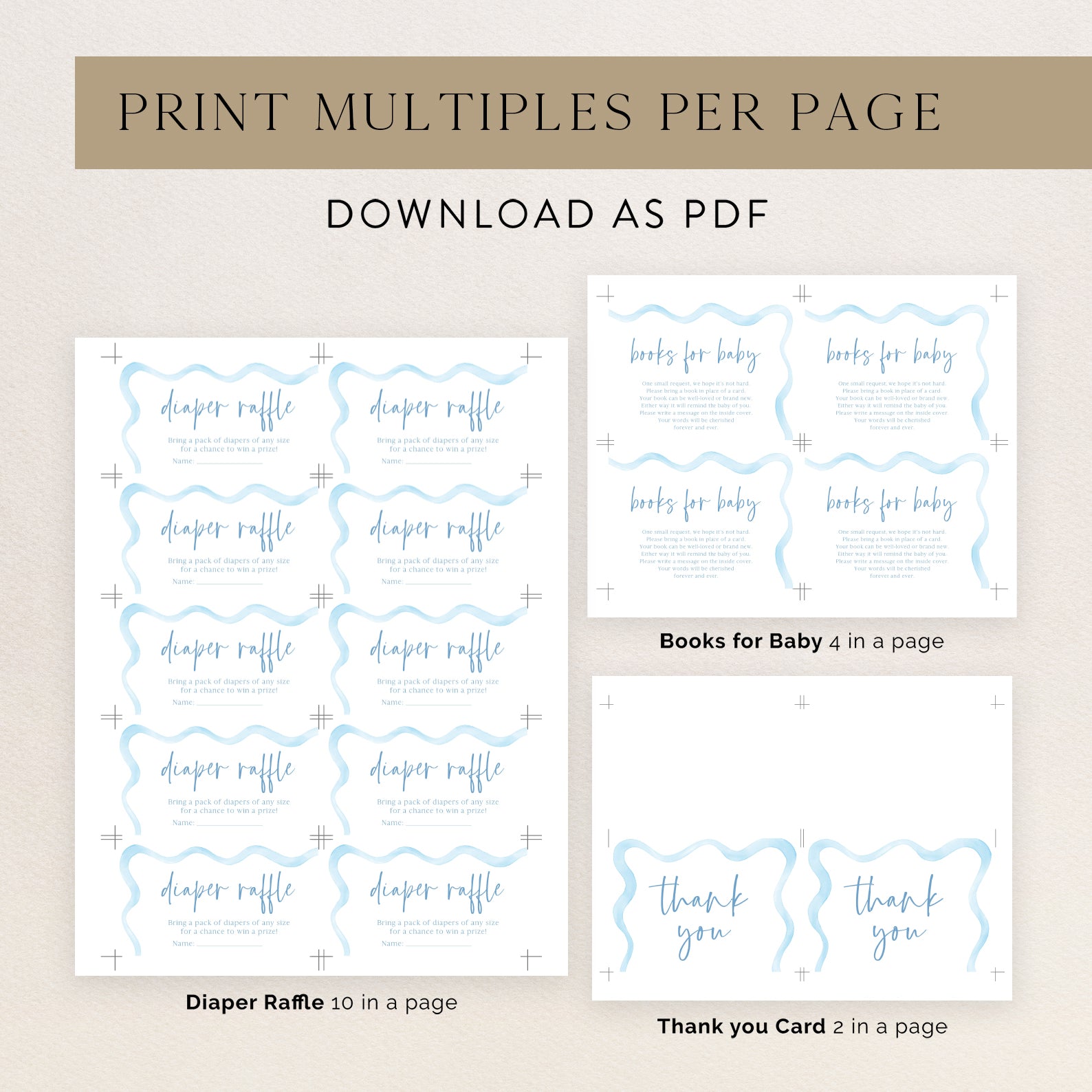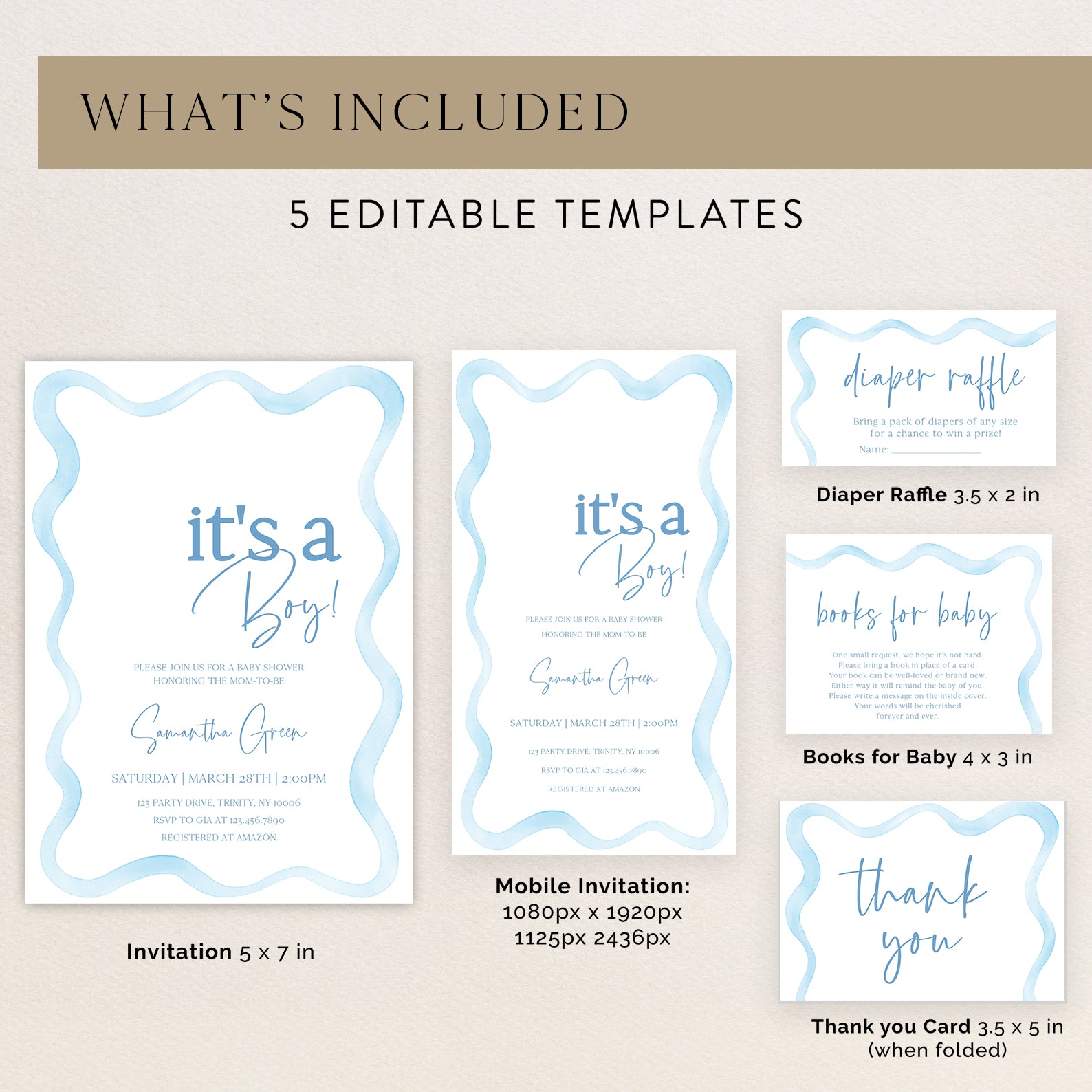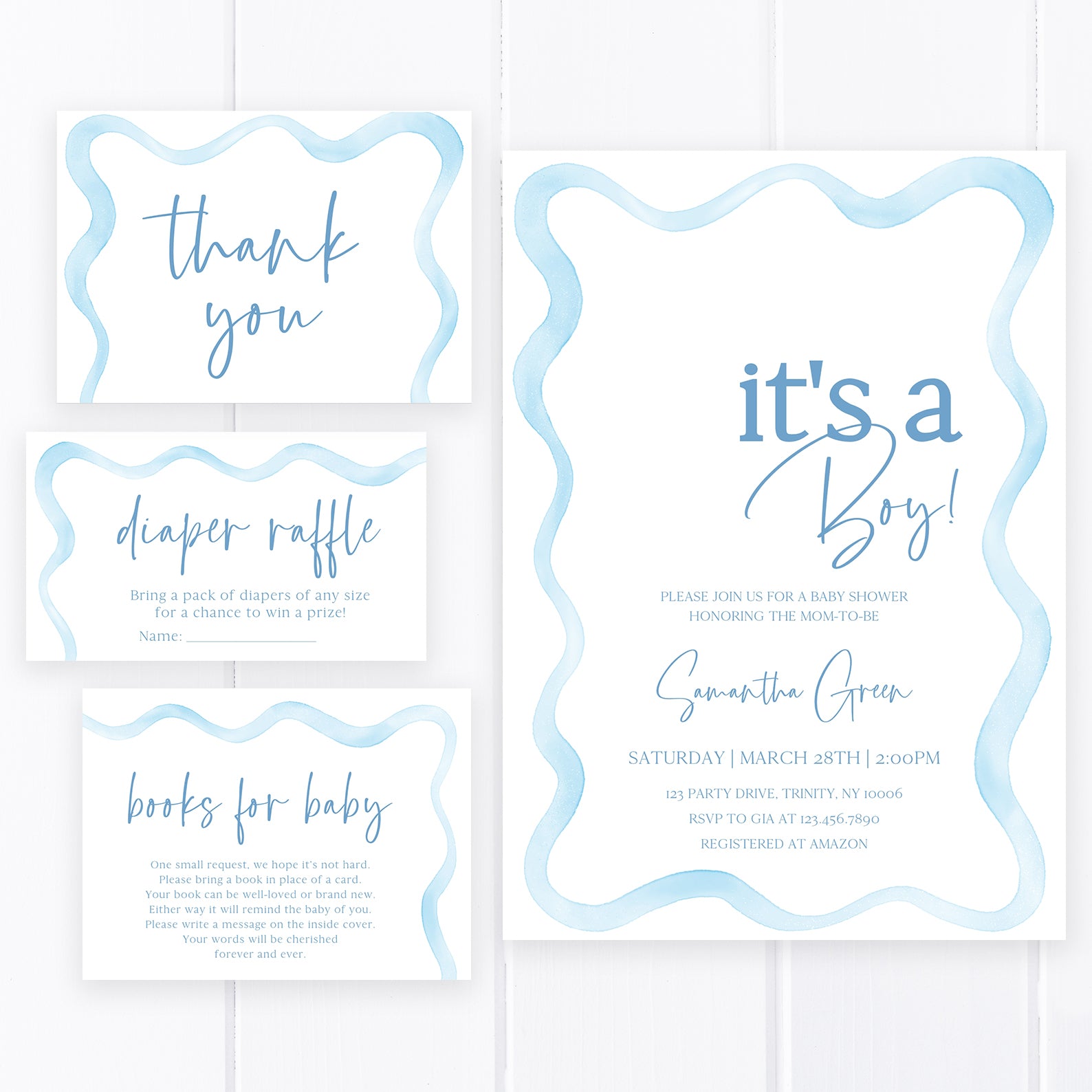 Blue Minimalist Wavy Border Baby Shower Digital Invitation Bundle