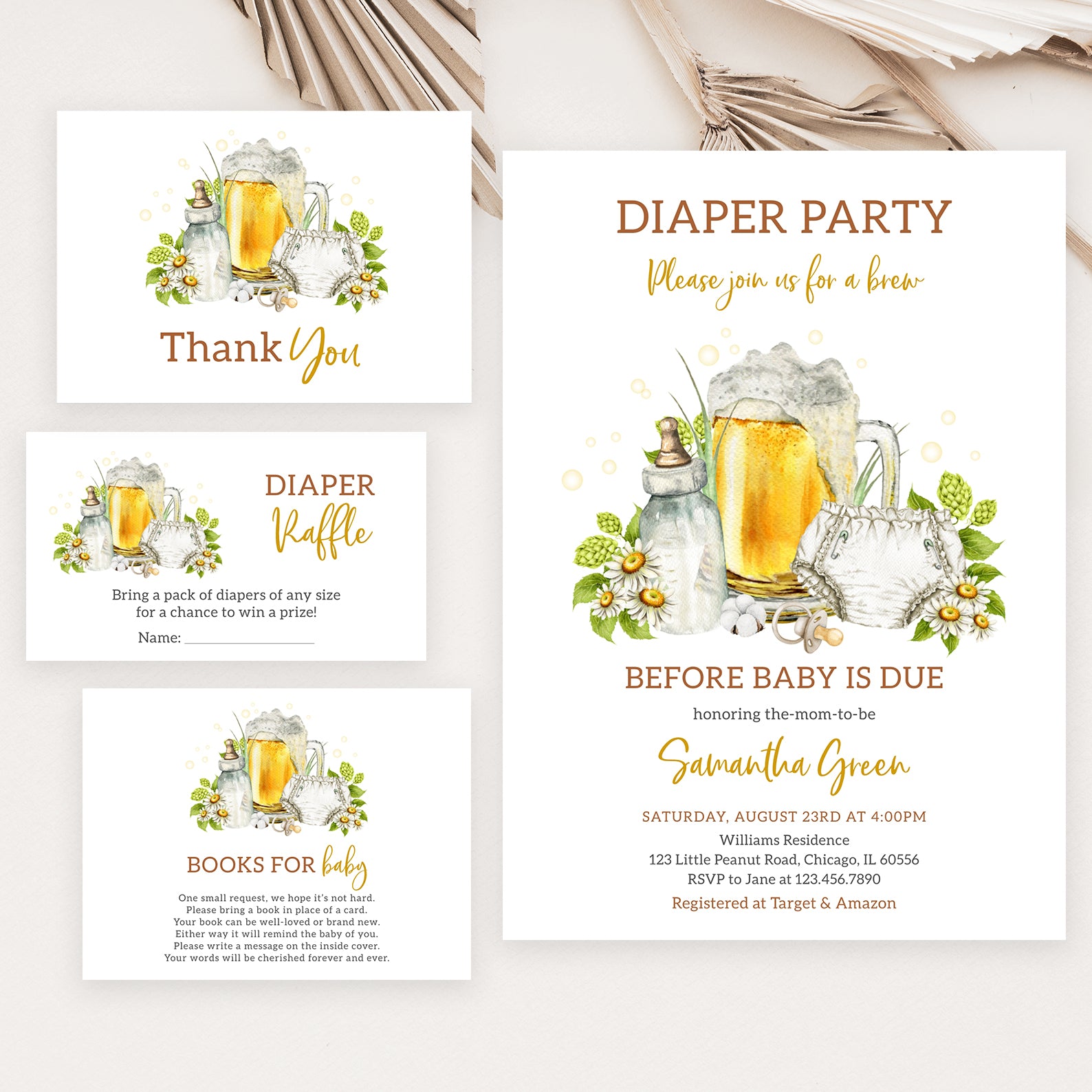 Get ready to celebrate with our Evergreen Diaper Party Invitation Bundle! Featuring a playful design with a beer mug, baby essentials, cheerful yellow bubbles, green leaves, and white daisies, this set includes an invitation, mobile invite, diaper raffle, books for baby, and thank you card. Perfect for a fun "brew before baby is due" celebration!