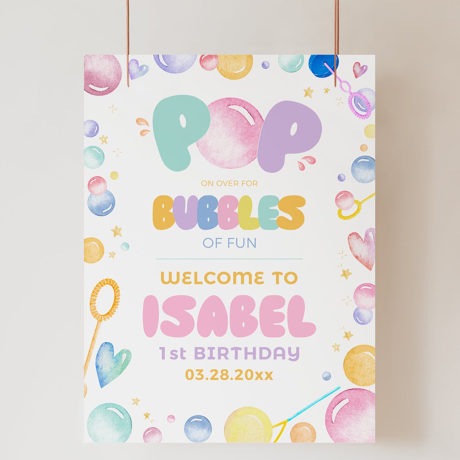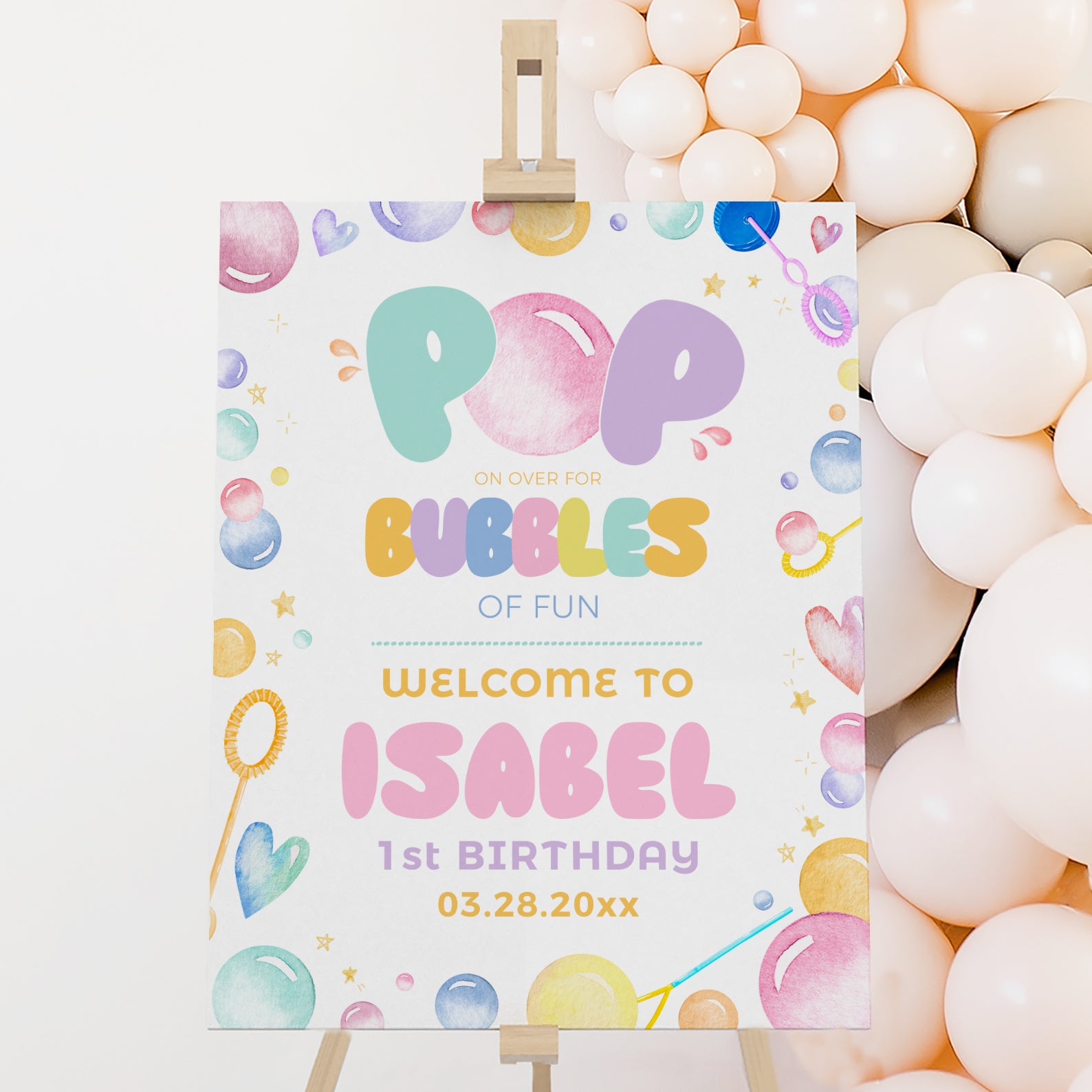 1. Purchase this Bubble Party Digital Birthday Welcome Sign: Pop On Over template