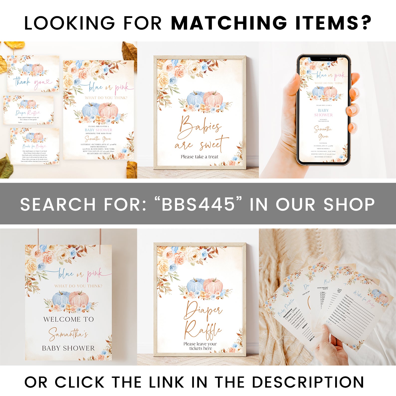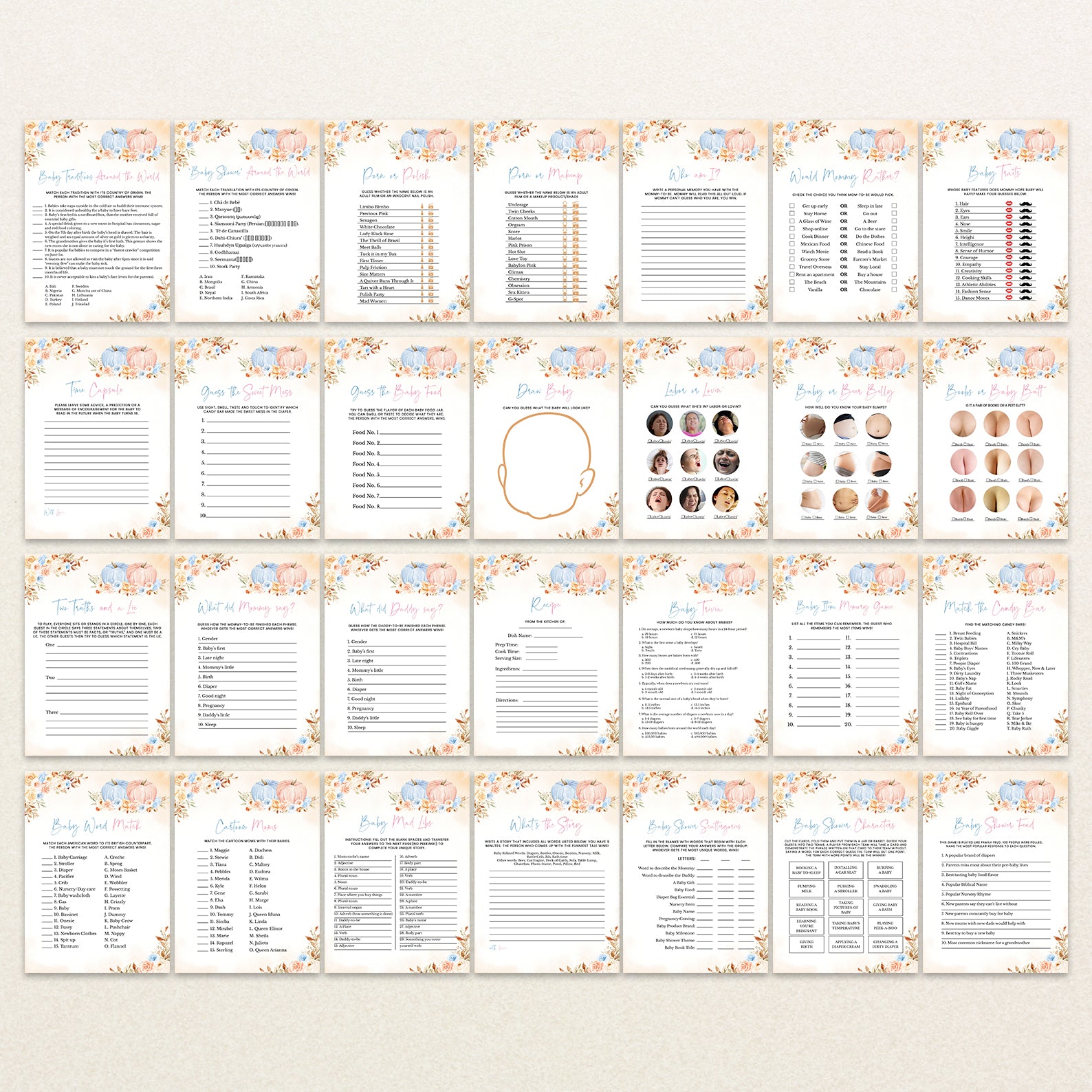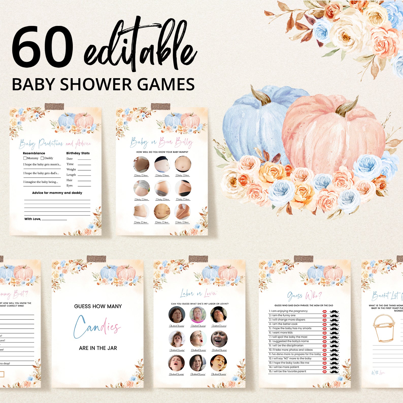 Keep guests engaged with this 60-piece editable baby shower game bundle, designed with playful pumpkins, elegant florals, and seasonal greenery in fall-inspired pink, blue, or orange tones. From ice-breakers to classics like “Don’t Say Baby,” every game pairs festive fun with a charming autumn aesthetic perfect for a memorable and stylish baby shower gathering.
