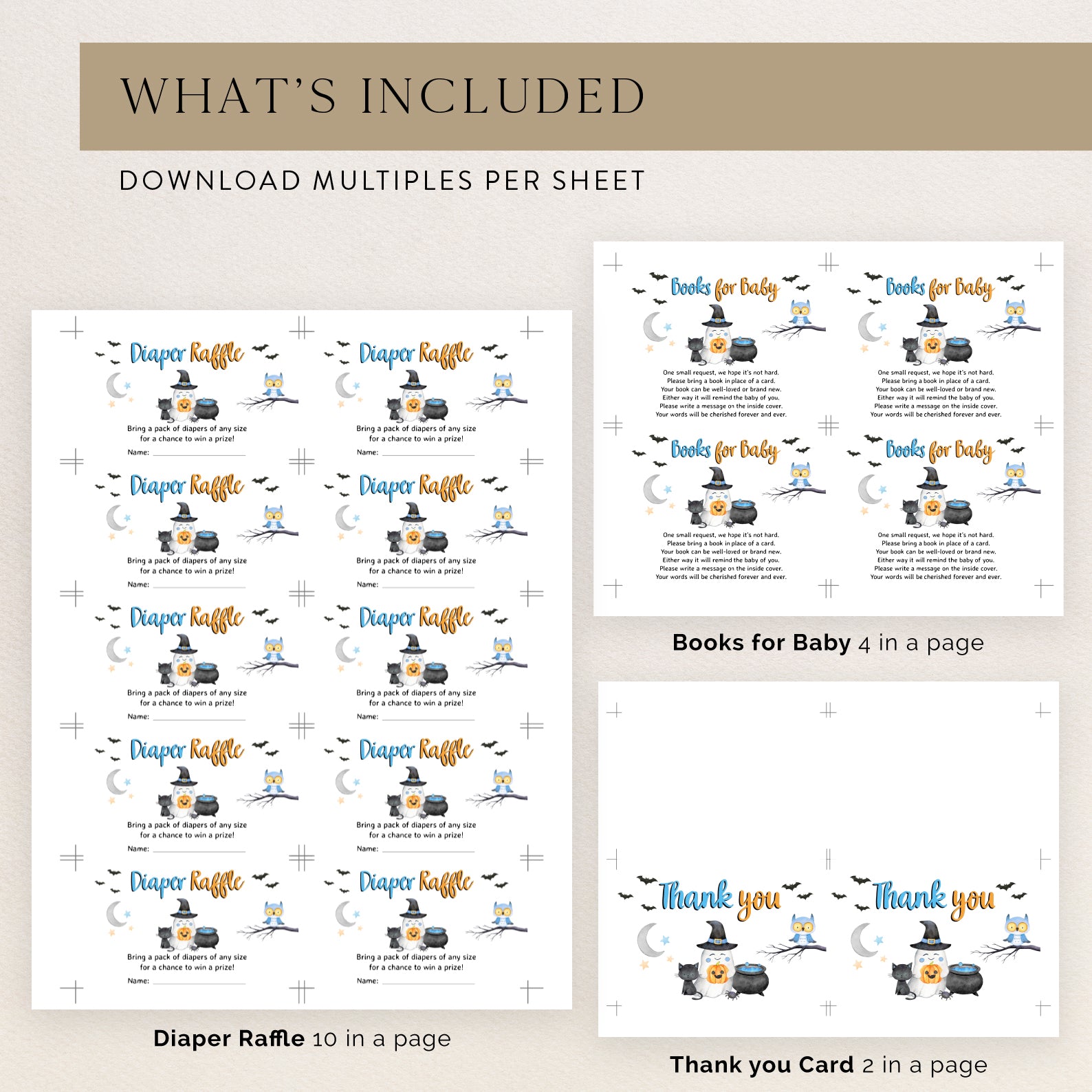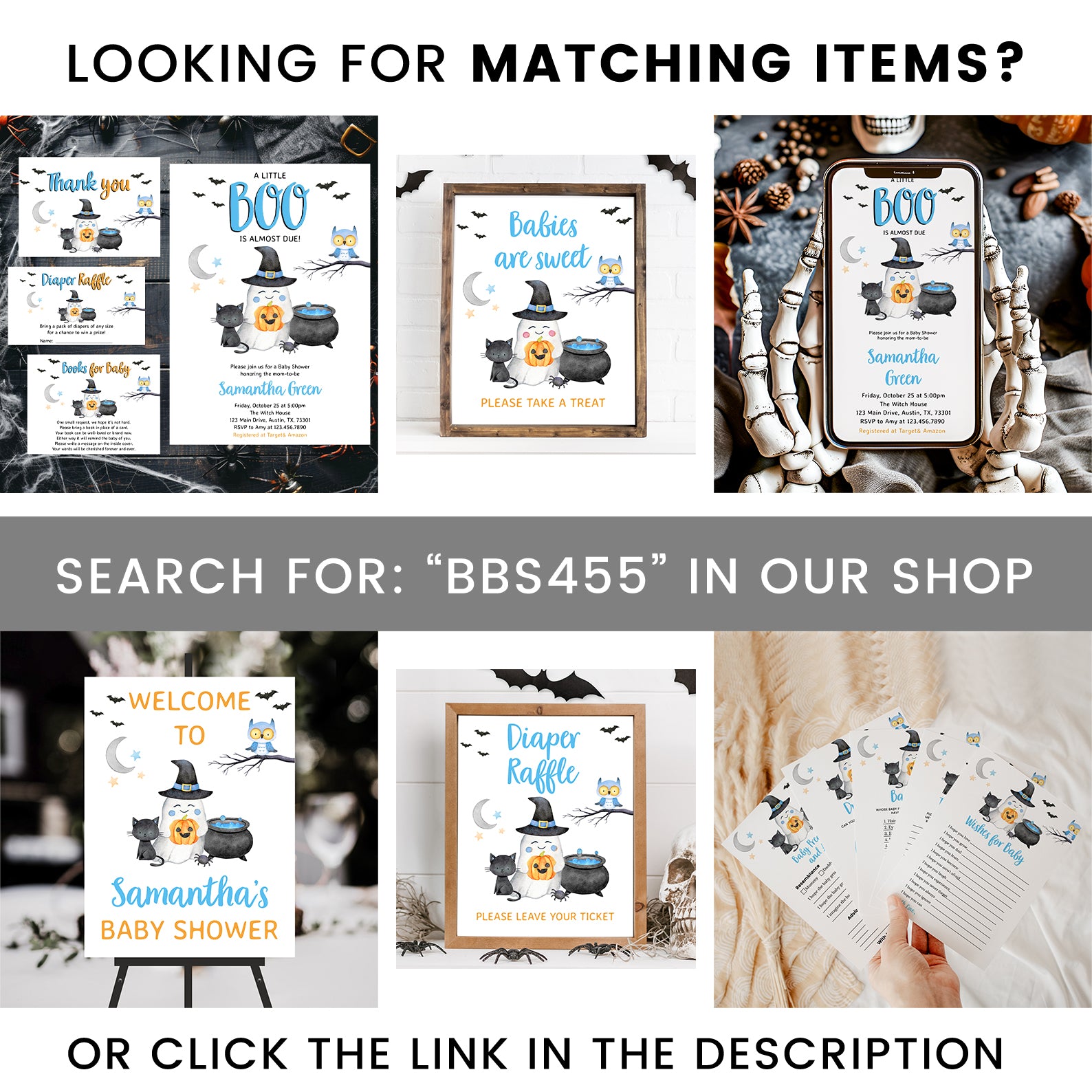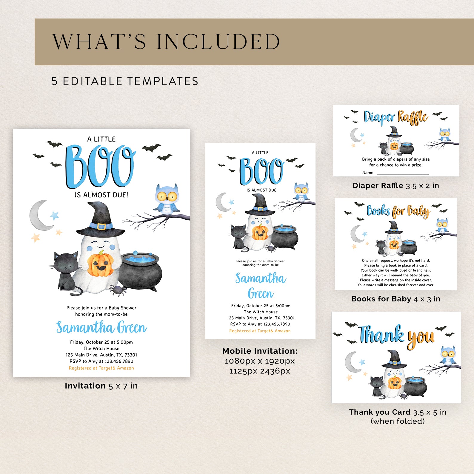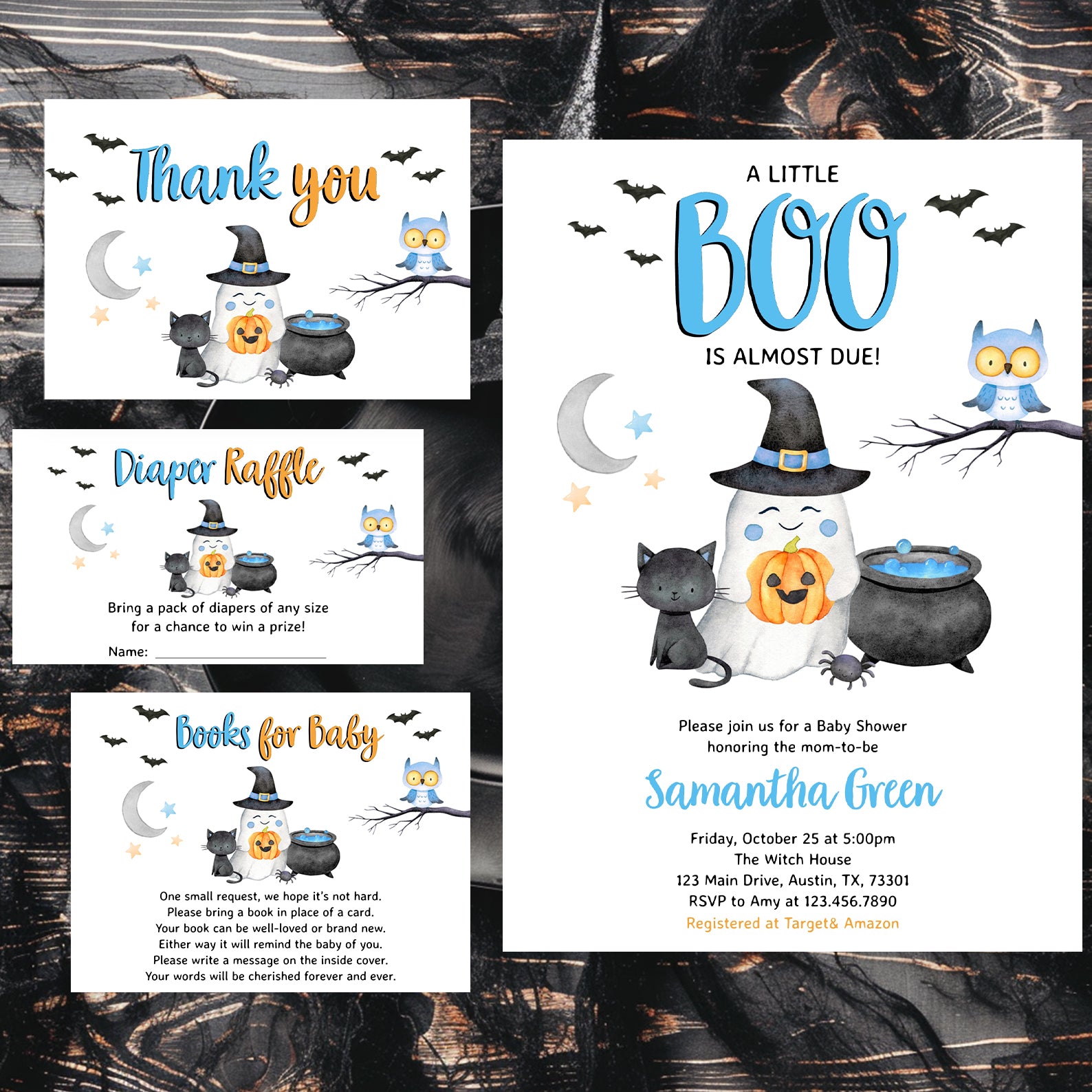 Celebrate your little one's arrival with our charming baby shower invitation bundle! Featuring a smiling ghost in a witch hat, a black cat, brewing cauldron, owl on a tree branch, and flying bats, this design adds a whimsical touch to your event. Choose from blue, pink, or purple themes to match your style. This bundle includes an invitation, mobile version, diaper raffle, books for baby, and thank you card, perfect for welcoming your little boo in delightful fashion!