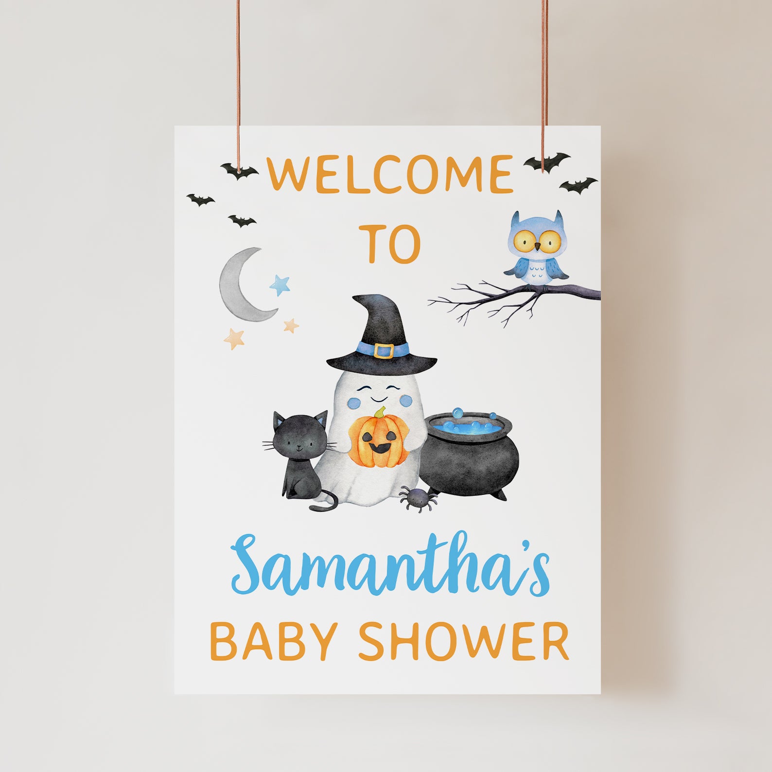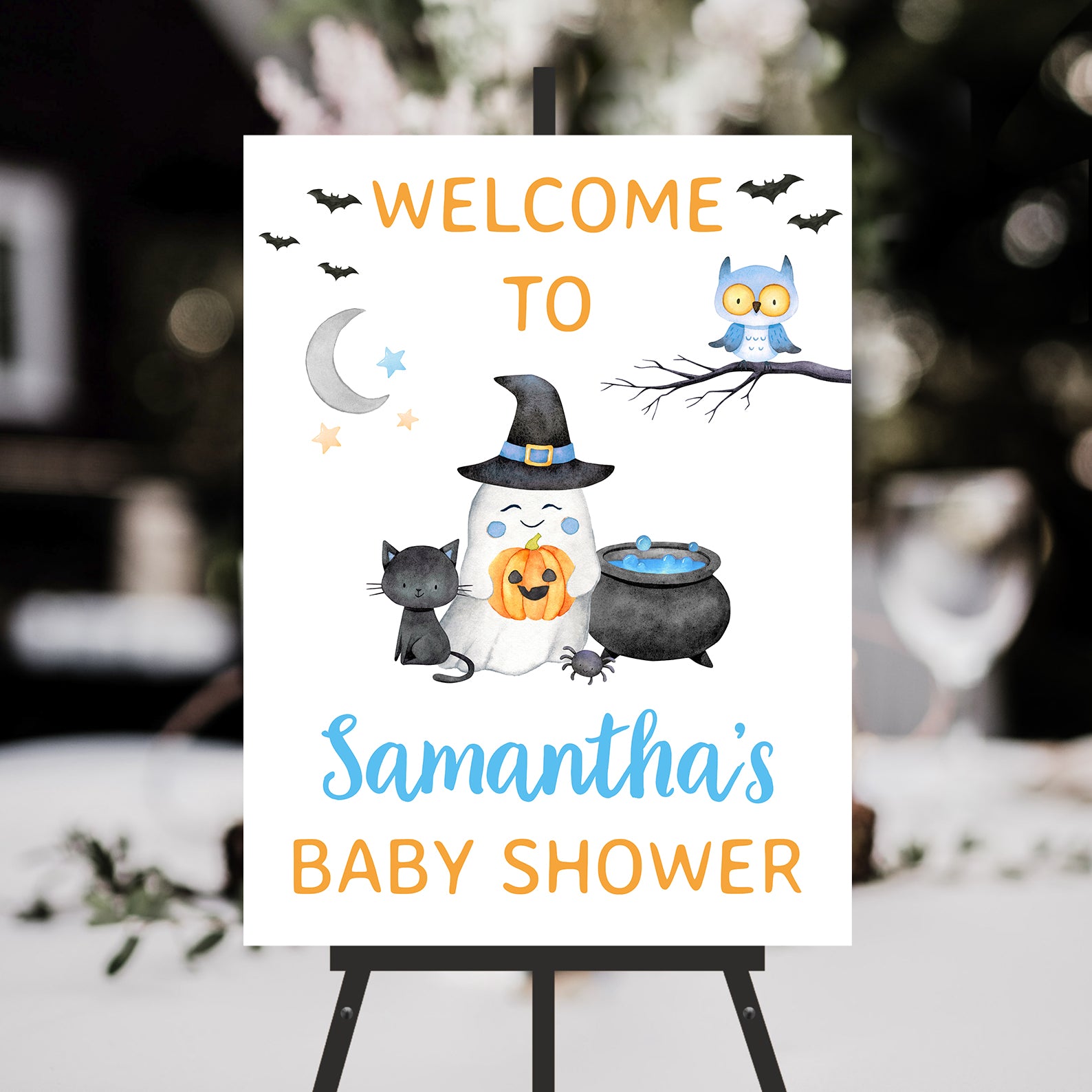 Greet your guests with our delightful welcome sign featuring a smiling ghost in a witch hat, a black cat, a brewing cauldron, an owl on a tree branch, and flying bats. Available in blue, pink, or purple, this whimsical design sets a charming tone for your baby shower. Perfect for adding a magical touch to your event!