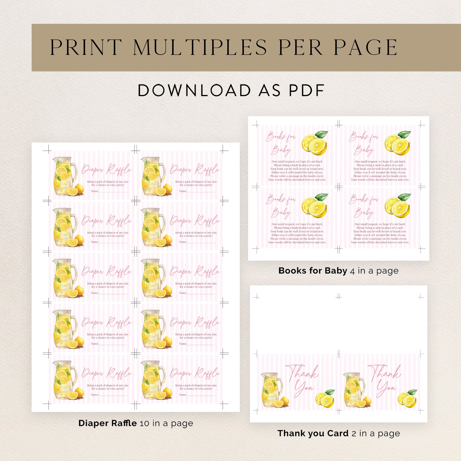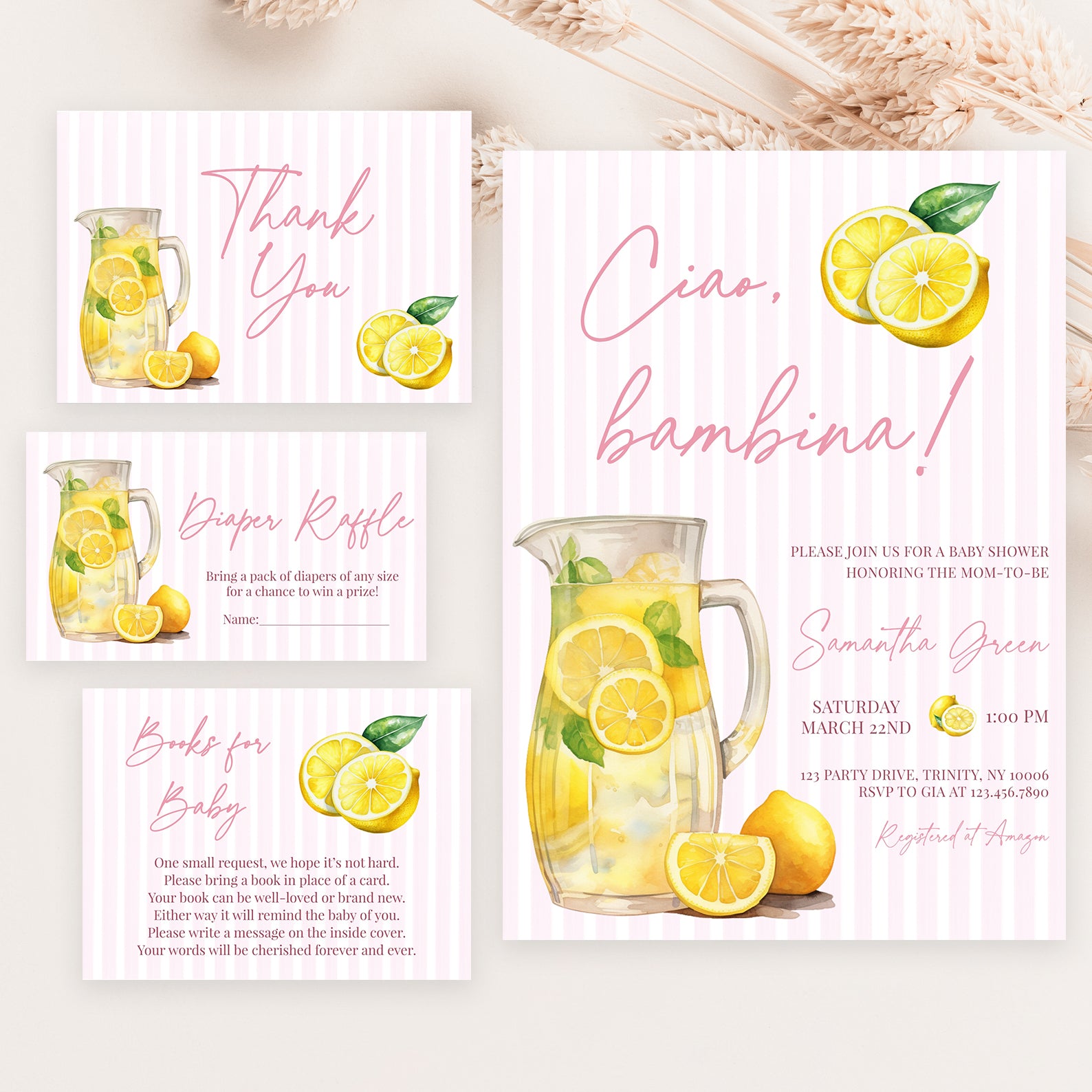 Celebrate your little one with our "Ciao, Bambina!" baby shower bundle! This sunny design features a pitcher of fresh lemon juice on a pink striped background—perfect for a cheerful, summer celebration. The set includes an invitation, mobile invite, diaper raffle, books for baby card, and thank you card. Easy to personalize and send!