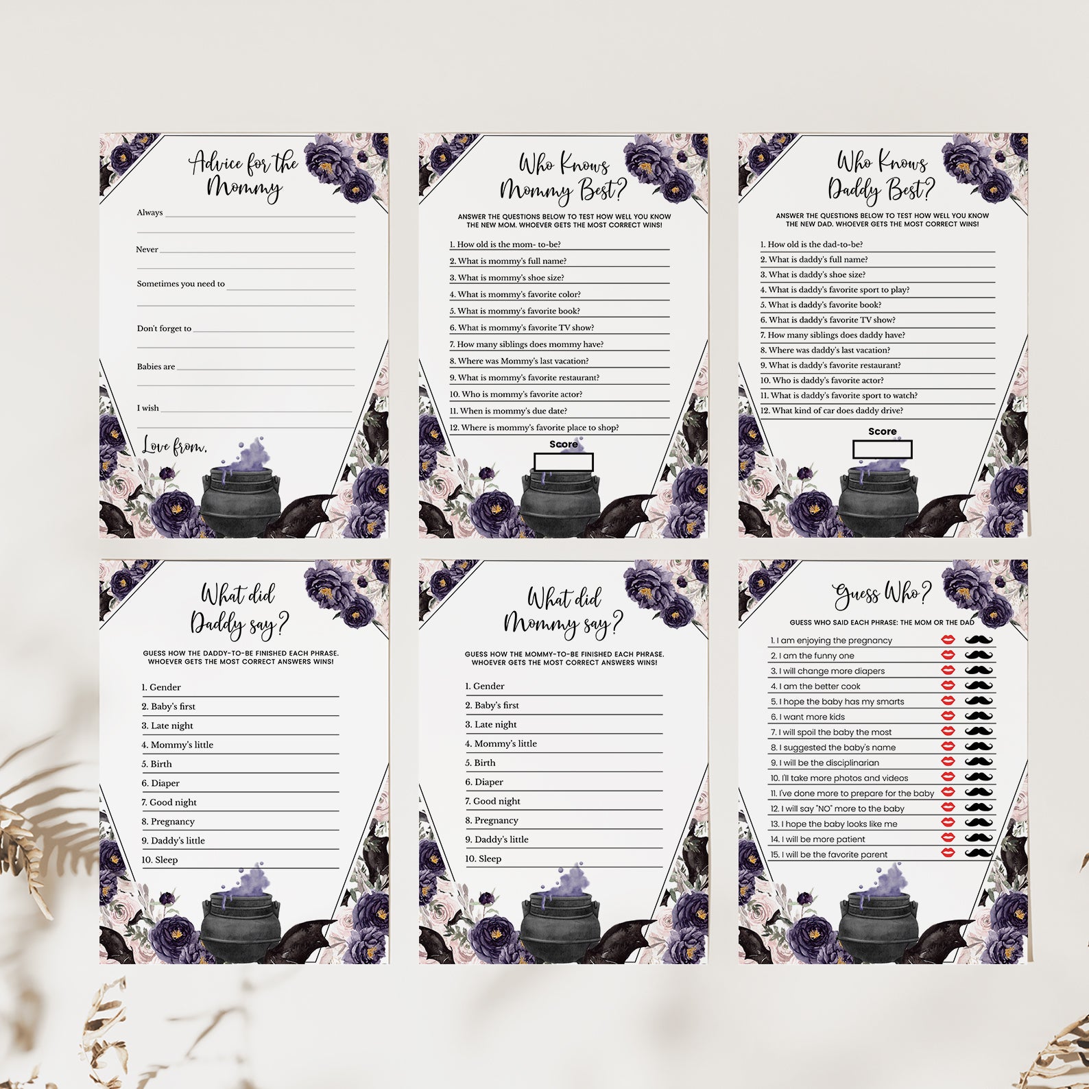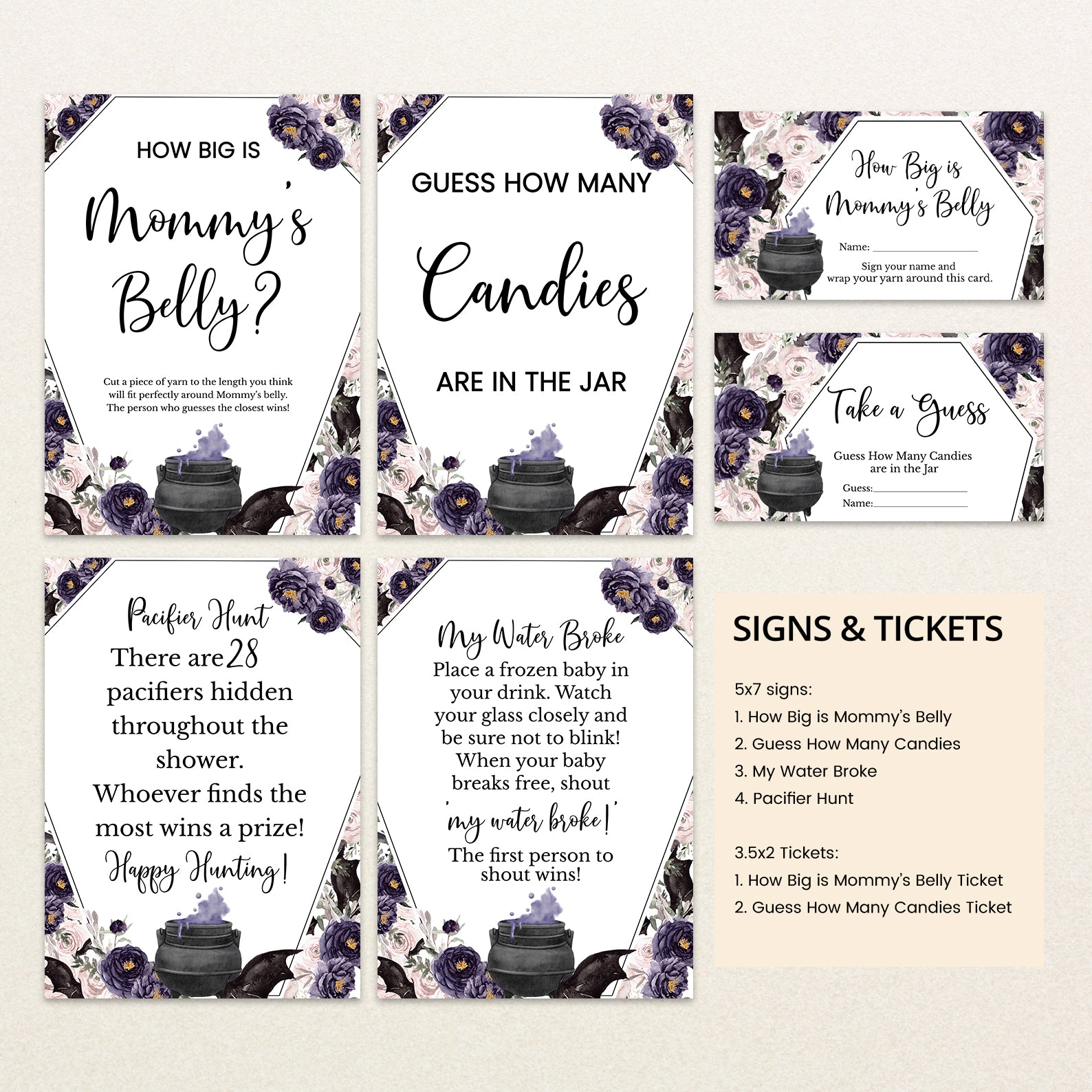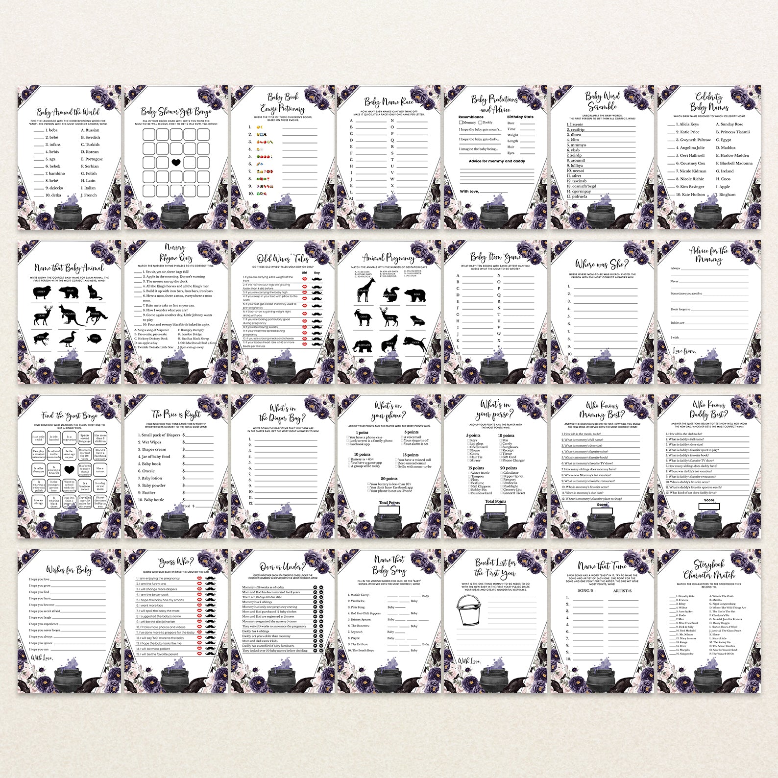Welcome your little one with a touch of enchantment using our “A Baby is Brewing” Game Bundle! This set of editable games is designed to captivate your guests with its unique coffin-shaped theme and whimsical cauldron, bubbling with a vibrant purple potion. Surrounding the cauldron are playful bats, set against a backdrop of delicate watercolor roses in rich purples and soft pinks. Perfect for adding a magical touch to your celebration, this bundle ensures a delightful mix of fun and festivity. Transform your baby shower into a spellbinding event with games that set the perfect tone for an unforgettable gathering!
