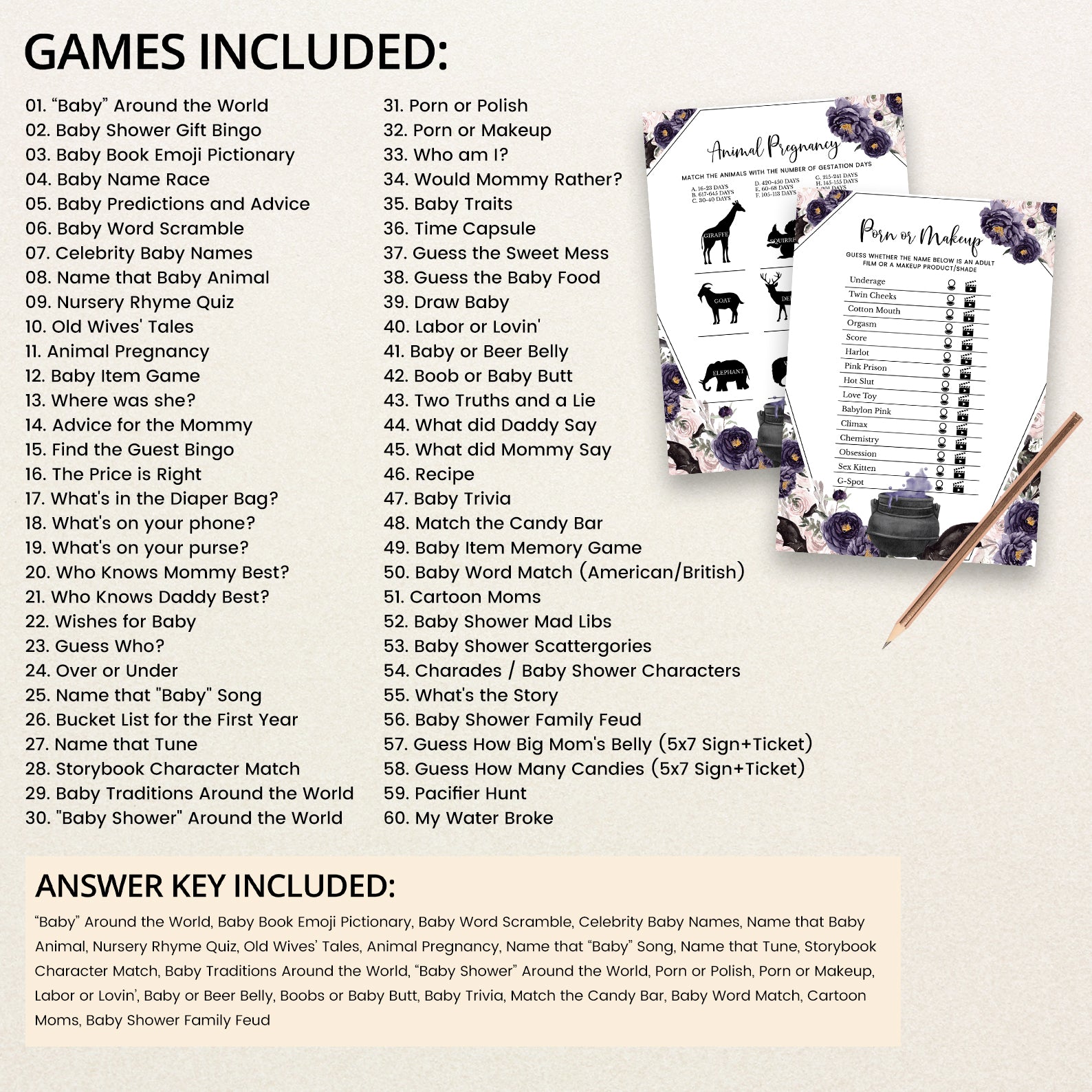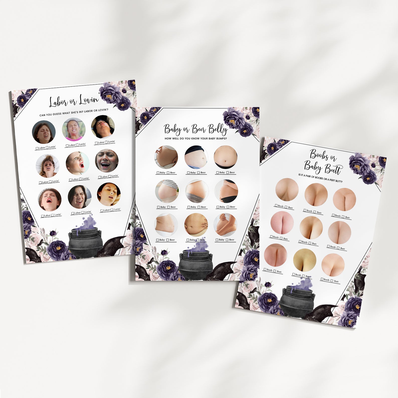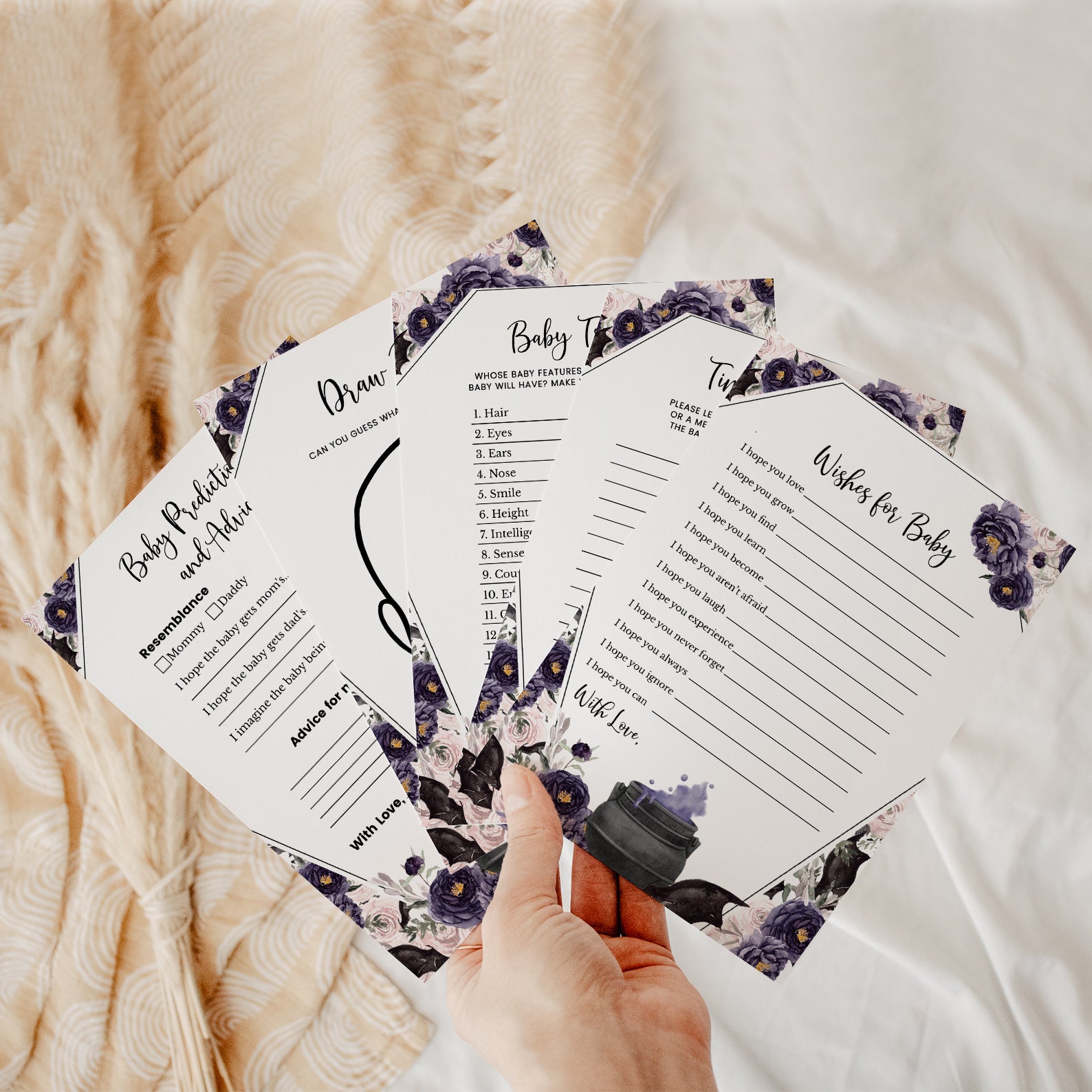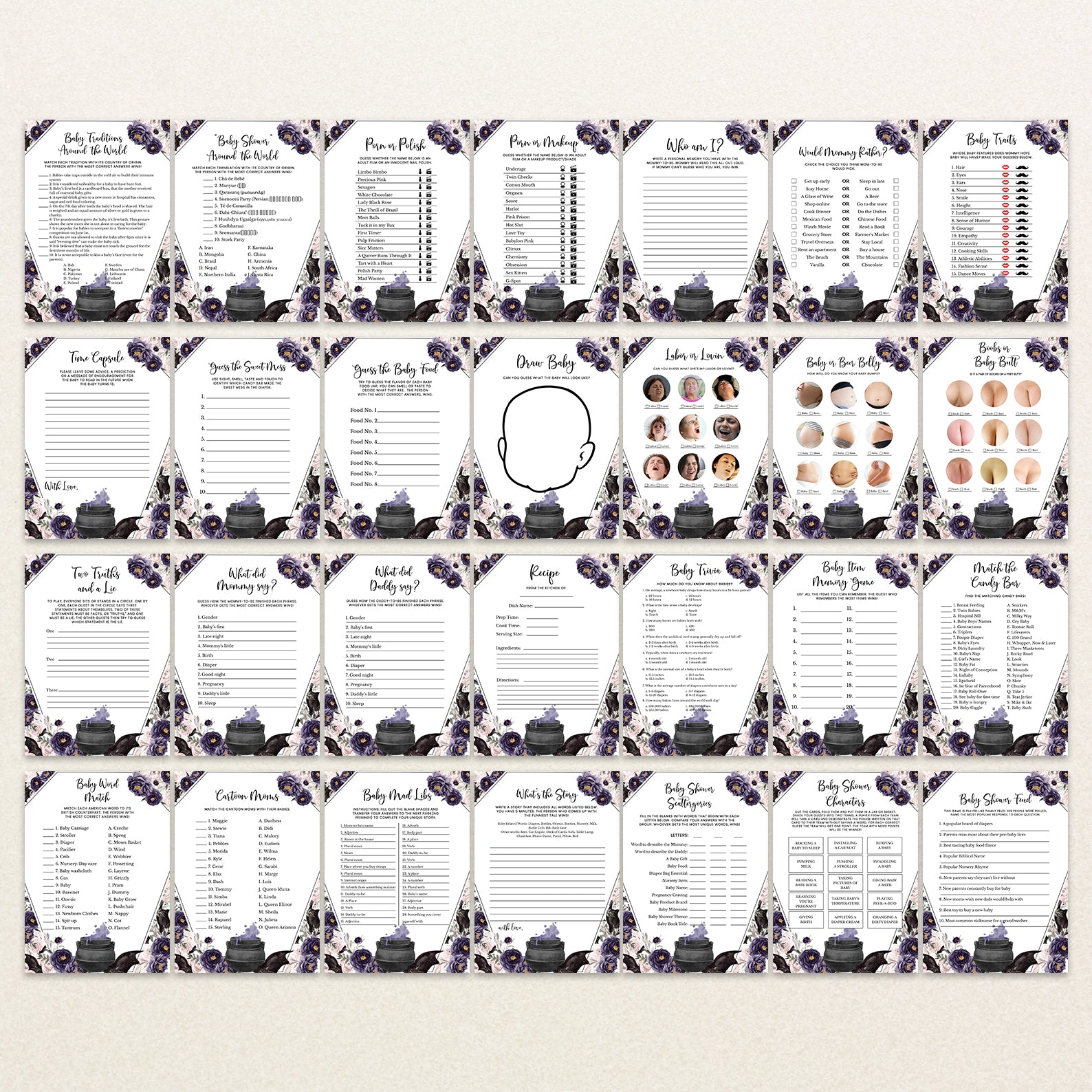 Welcome your little one with a touch of enchantment using our “A Baby is Brewing” Game Bundle! This set of editable games is designed to captivate your guests with its unique coffin-shaped theme and whimsical cauldron, bubbling with a vibrant purple potion. Surrounding the cauldron are playful bats, set against a backdrop of delicate watercolor roses in rich purples and soft pinks. Perfect for adding a magical touch to your celebration, this bundle ensures a delightful mix of fun and festivity. Transform your baby shower into a spellbinding event with games that set the perfect tone for an unforgettable gathering!