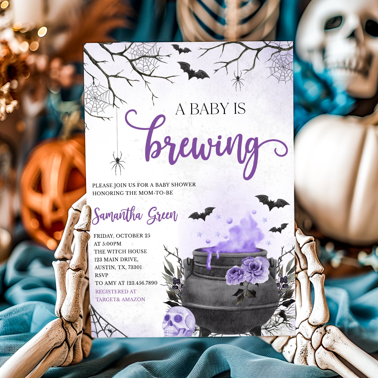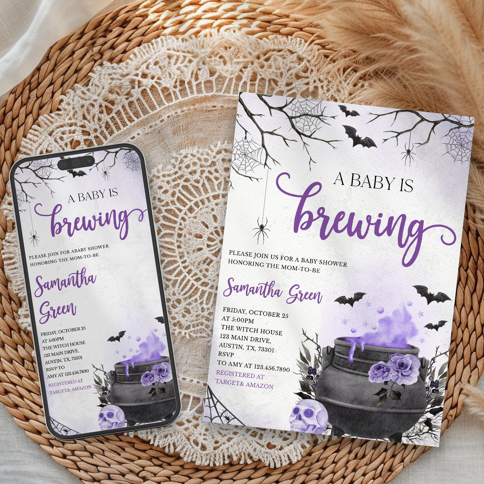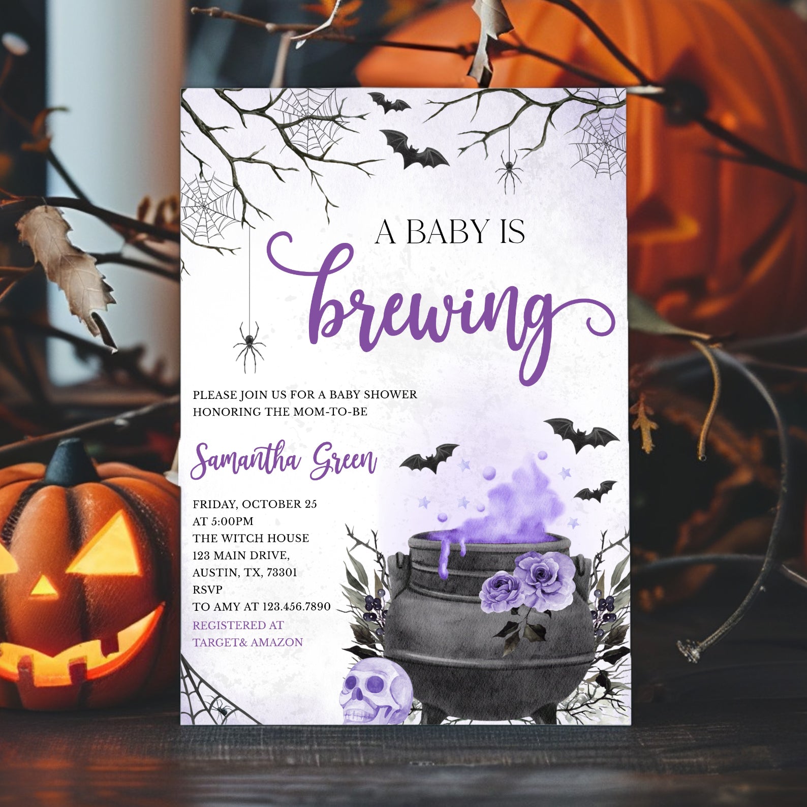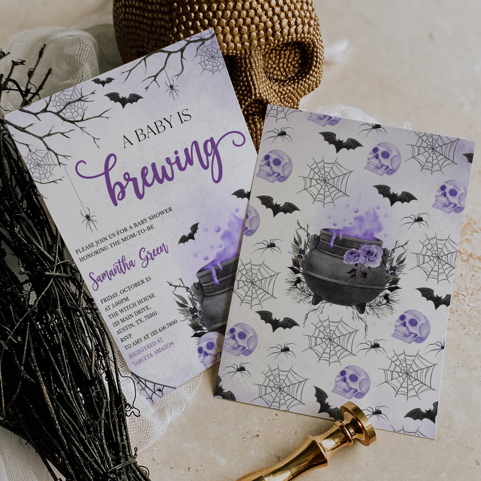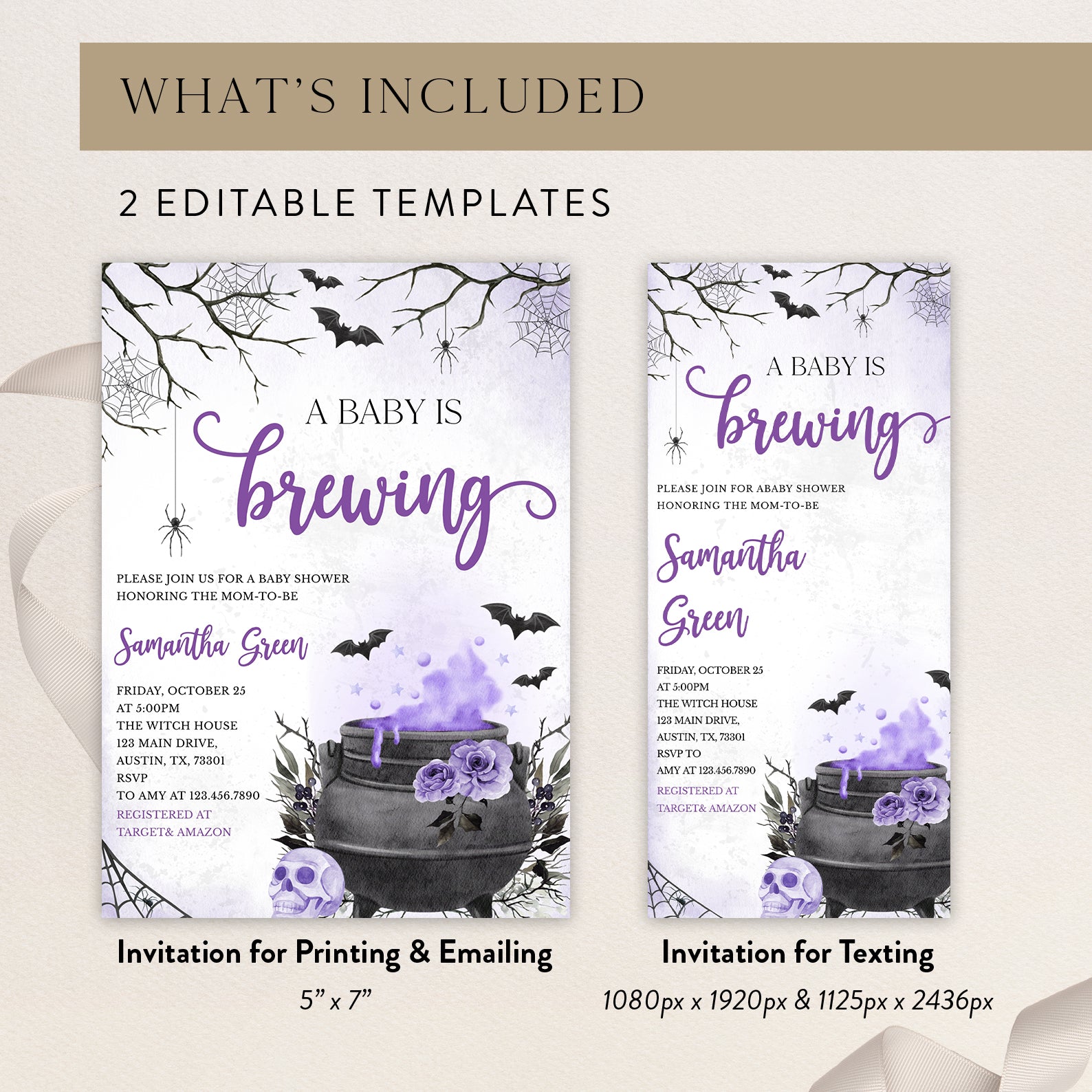- Purchase this Purple Digital Invite: 'A Baby is Brewing' with Spooky Cauldron Fun template