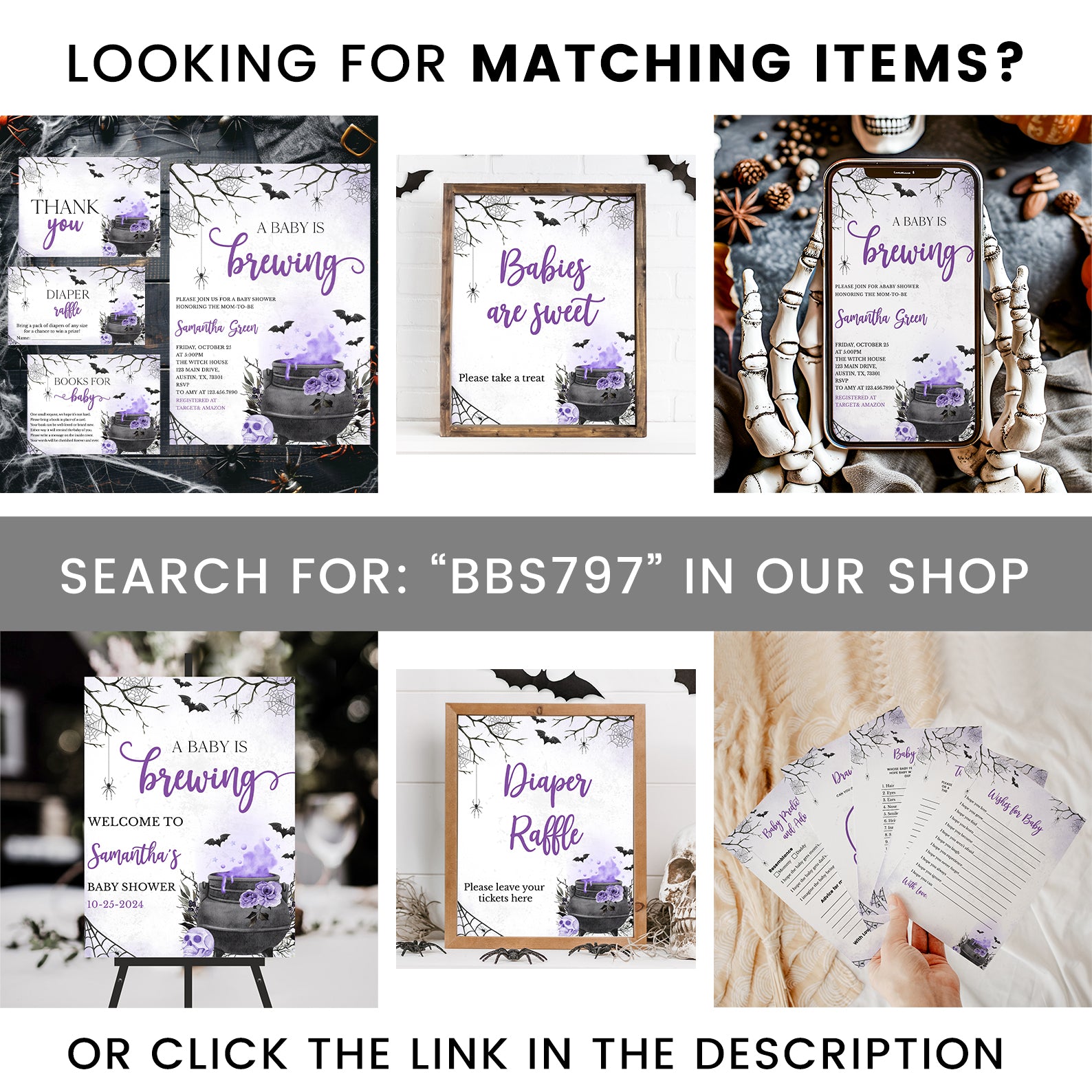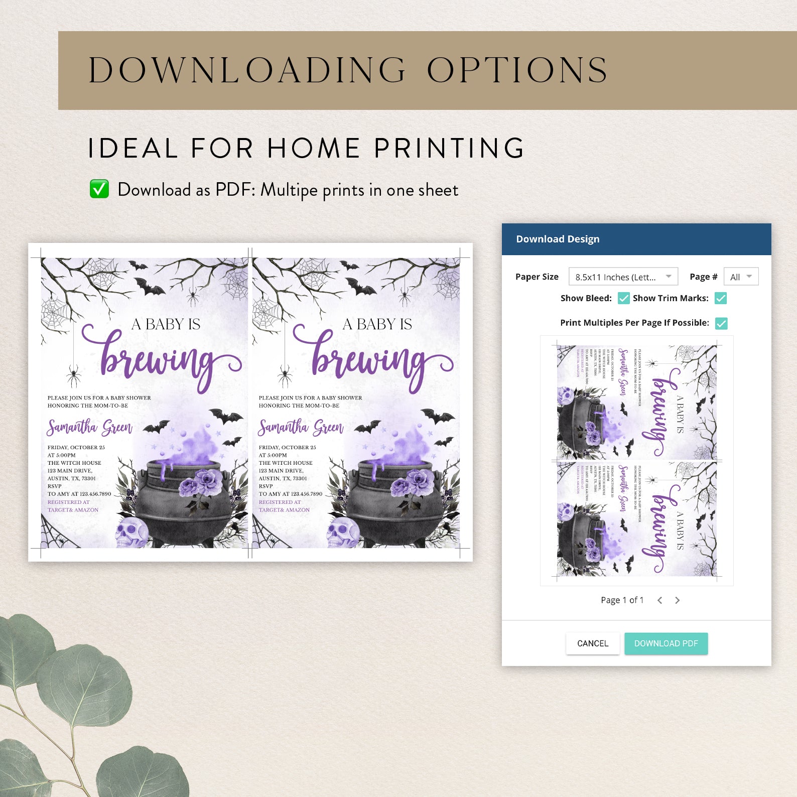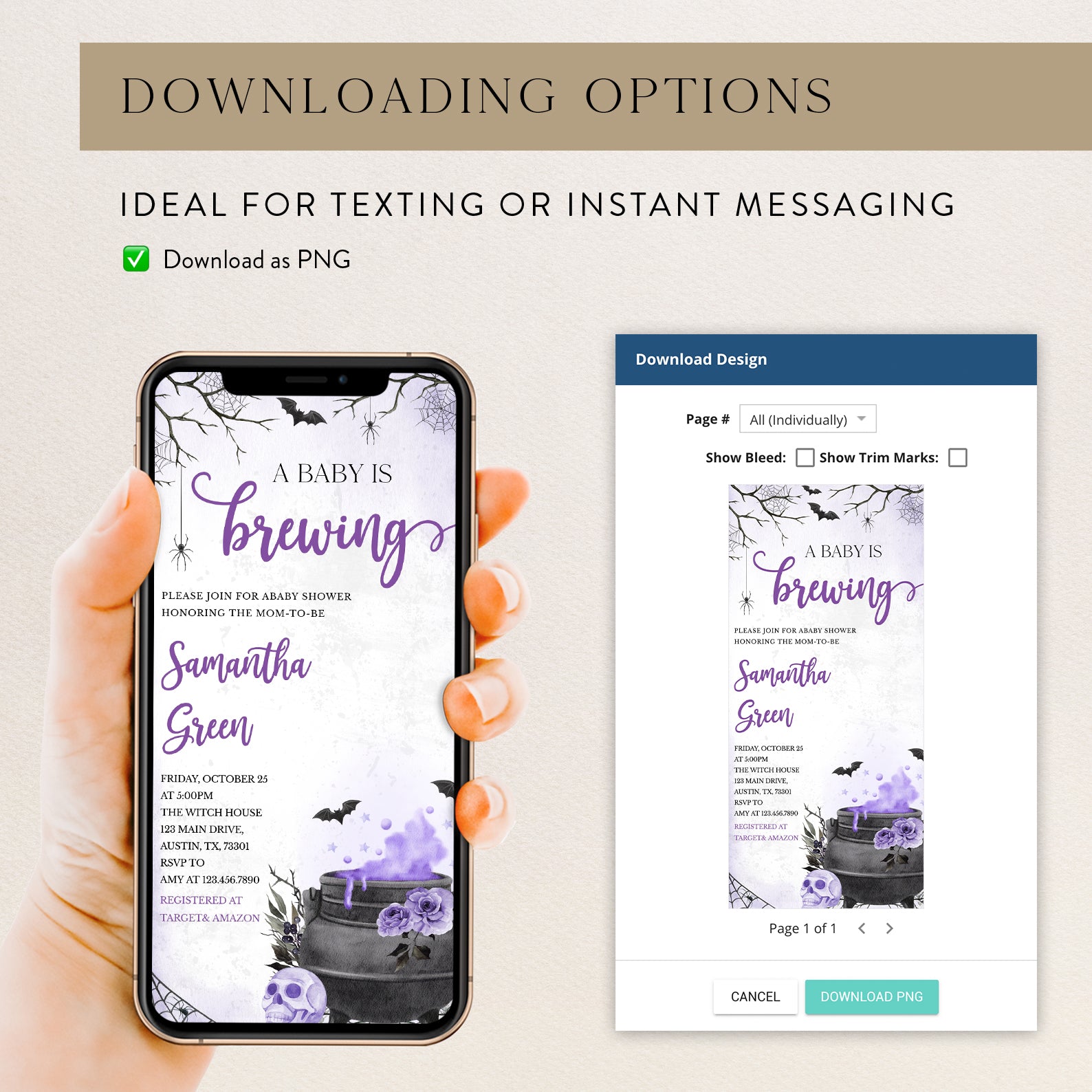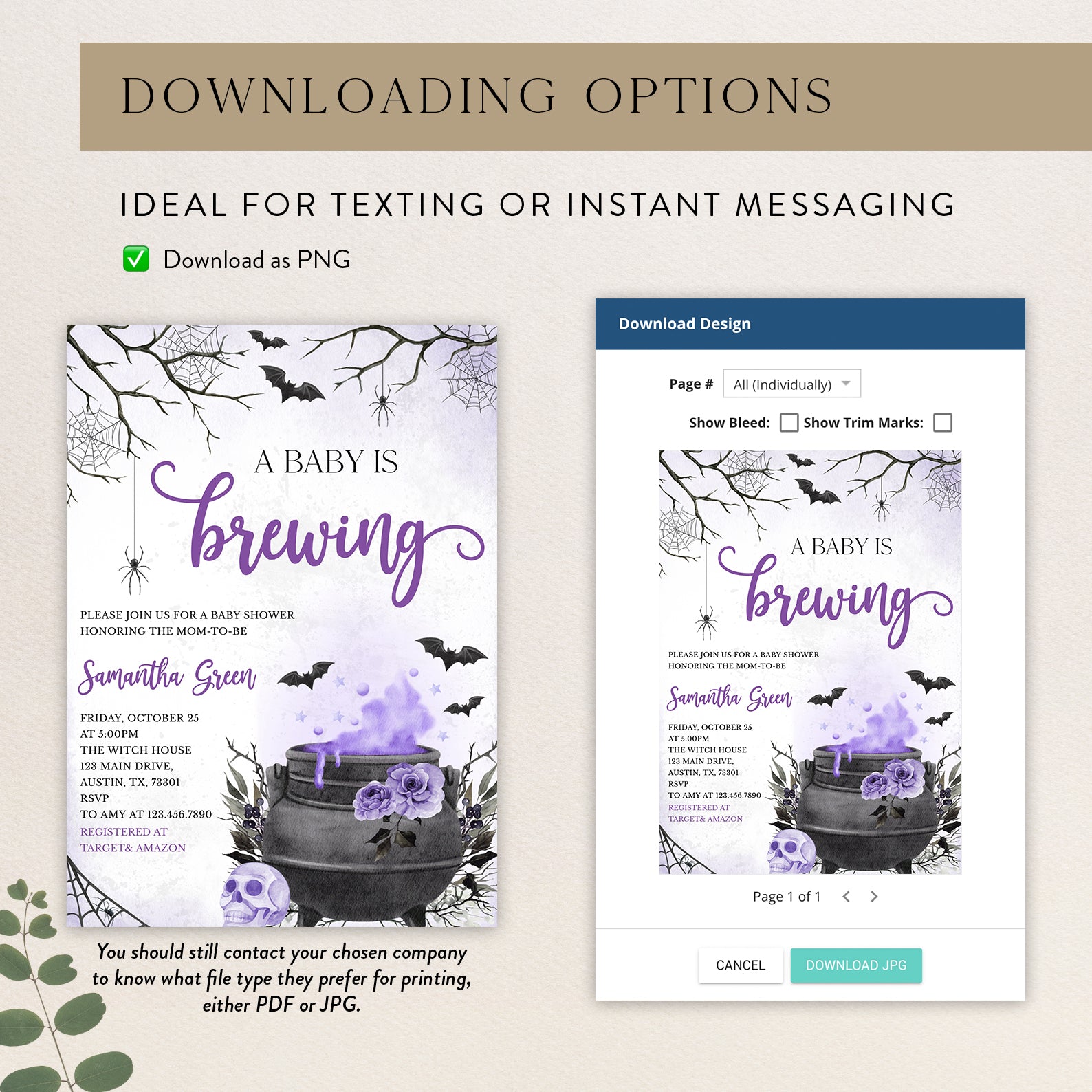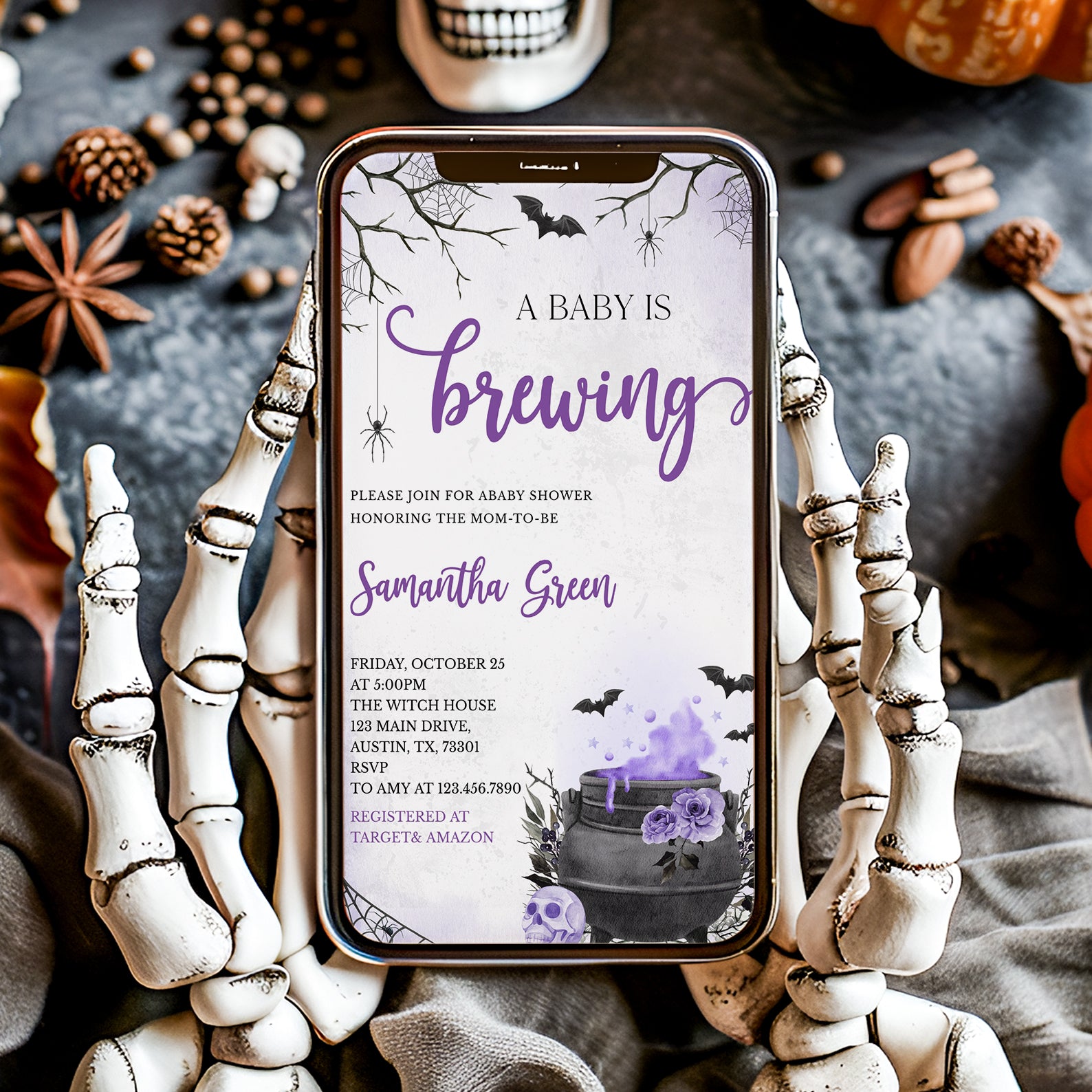 - Purchase this Purple Digital Invite: 'A Baby is Brewing' with Spooky Cauldron Fun template