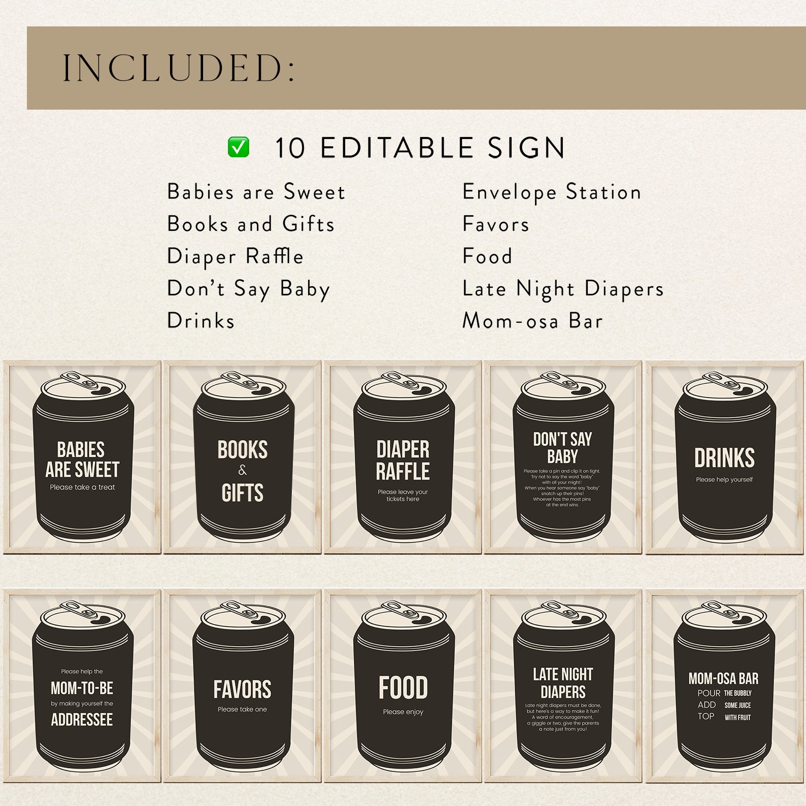 Add personality to your dad-to-be celebration with this set of 10 editable “Dudes and Diapers” table signs. Designed with a retro-inspired background and bold beer can graphics, each sign covers a key party station—Babies Are Sweet, Books and Gifts, Diaper Raffle, Don’t Say Baby, Drinks, Envelope Station, Favors, Food, Late Night Diapers, and Mom-osa Bar. Perfect for a laid-back, guys’ gathering with a fun twist.