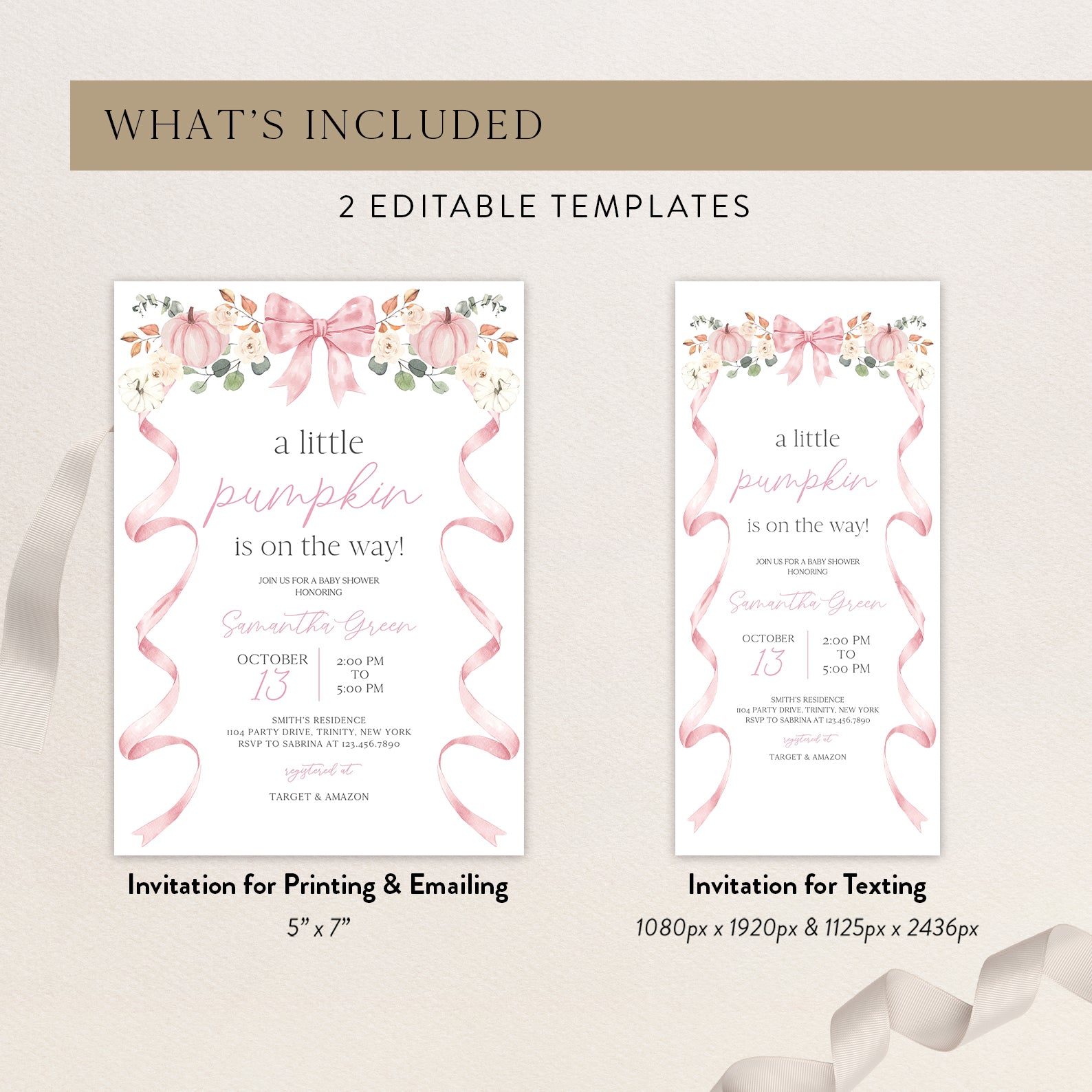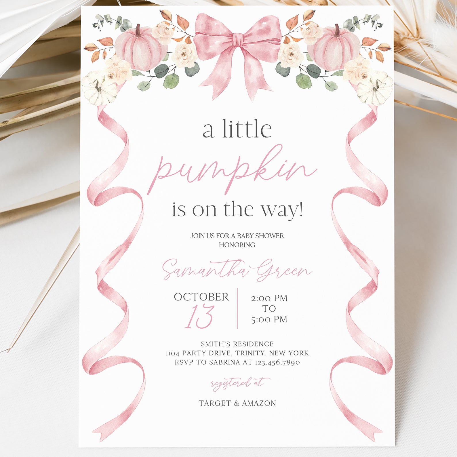 - Purchase this Fall Baby Shower Invite: Pink Ribbon Frame with Pumpkin & Florals template
