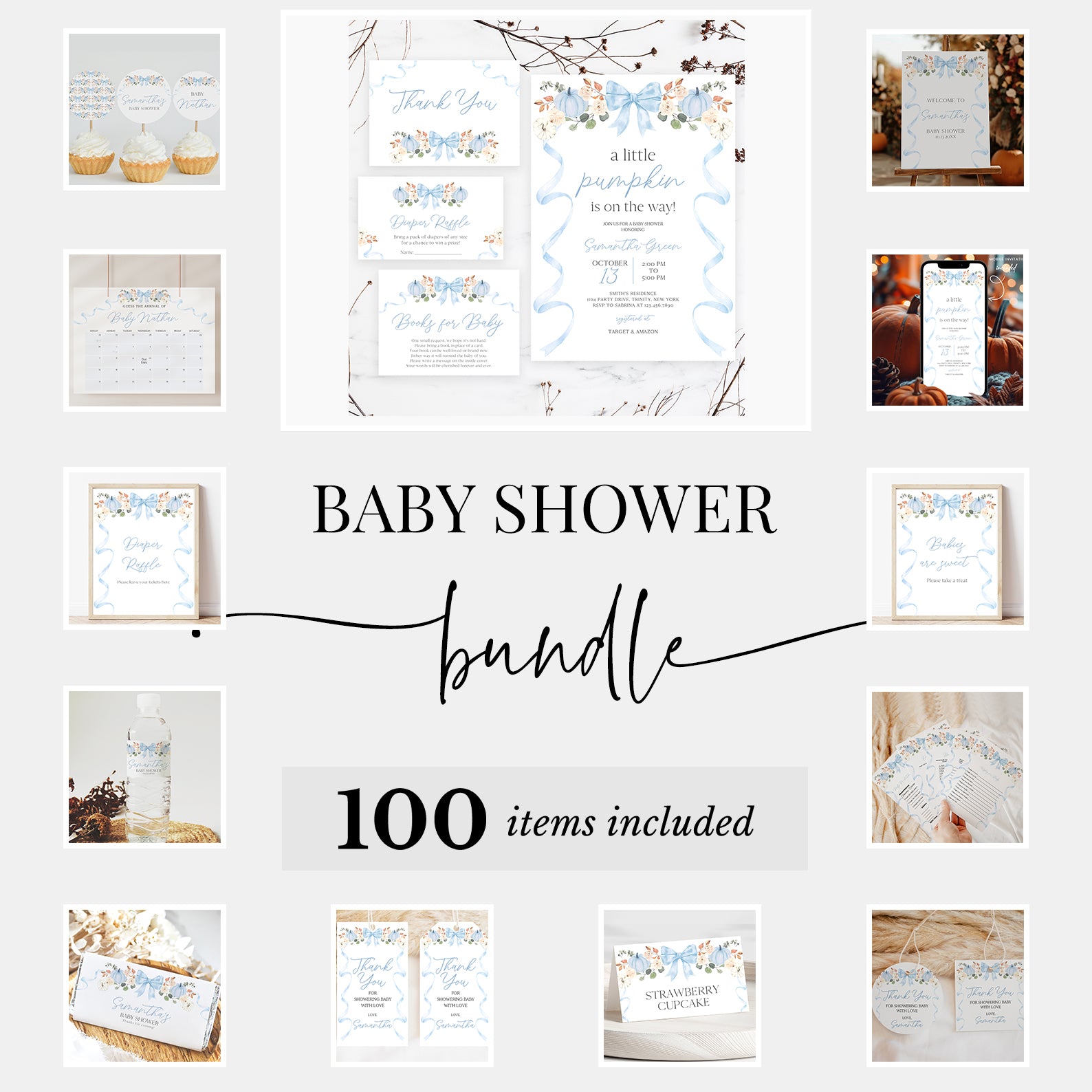 Celebrate your little pumpkin in style with this all-in-one Fall Baby Shower Mega Bundle! Featuring 100 editable items including invitations (with mobile version and backside), diaper raffle, books for baby, thank you card, welcome sign, table signs, favor tags, labels, toppers, wrappers, and 60+ games. Each design showcases a wavy ribbon border and pumpkin with floral accents in your choice of green, orange, pink, or blue. A charming and cohesive setup made easy!