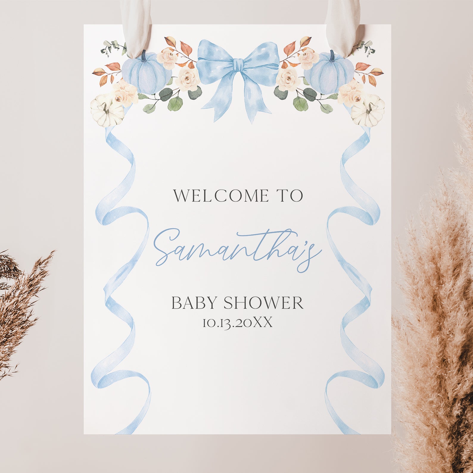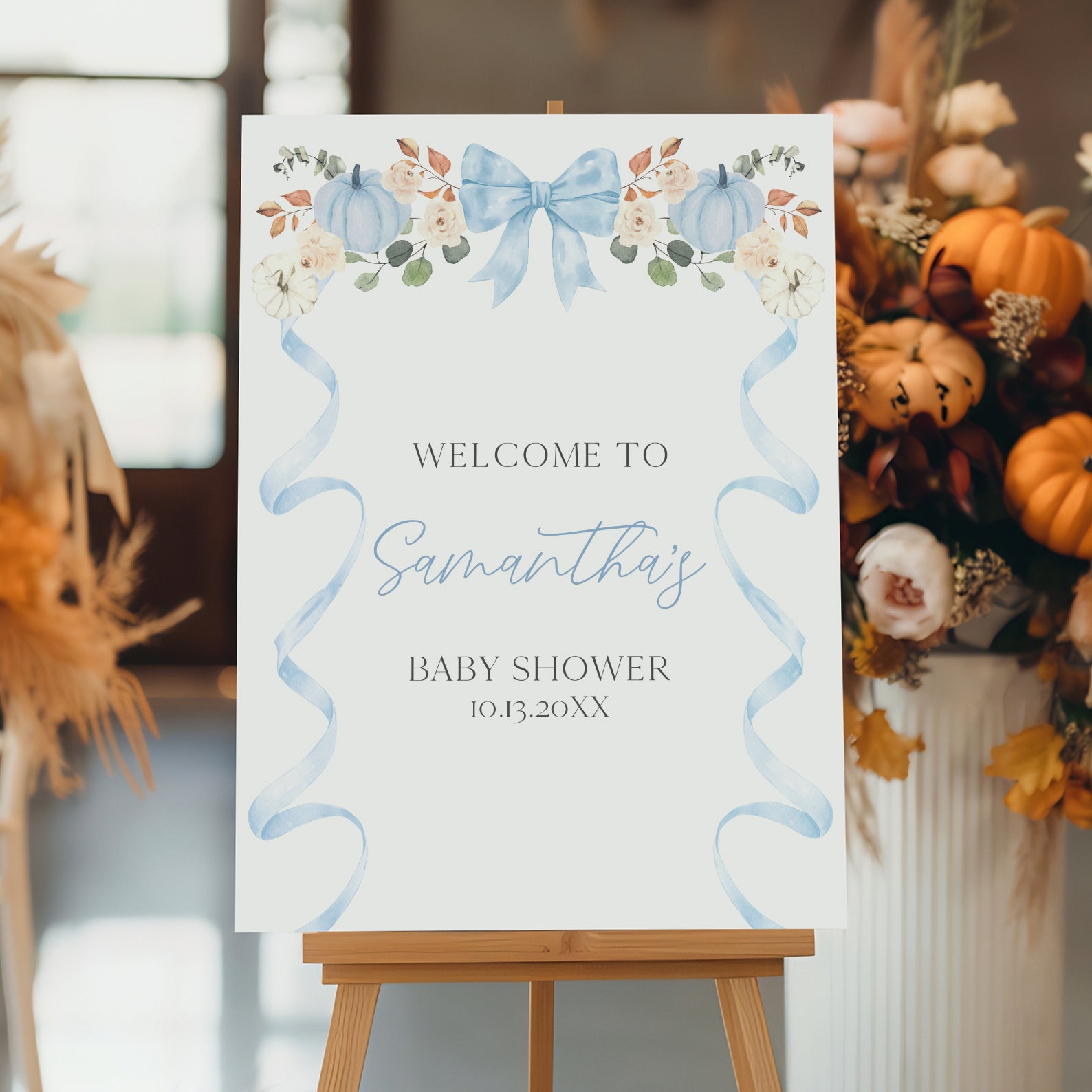 - Purchase this Fall Baby Shower Welcome Sign: Blue Ribbon Frame with Pumpkin & Florals template