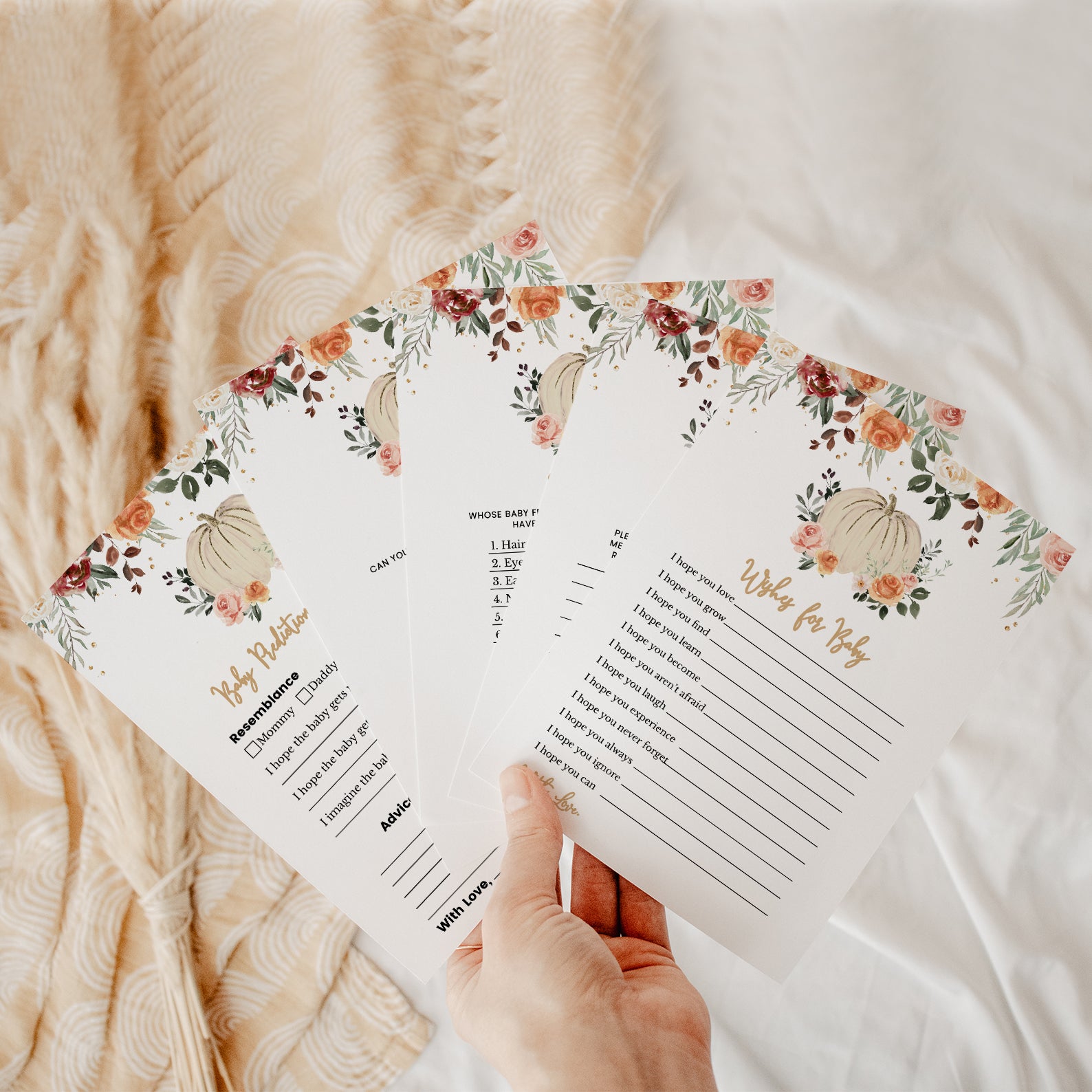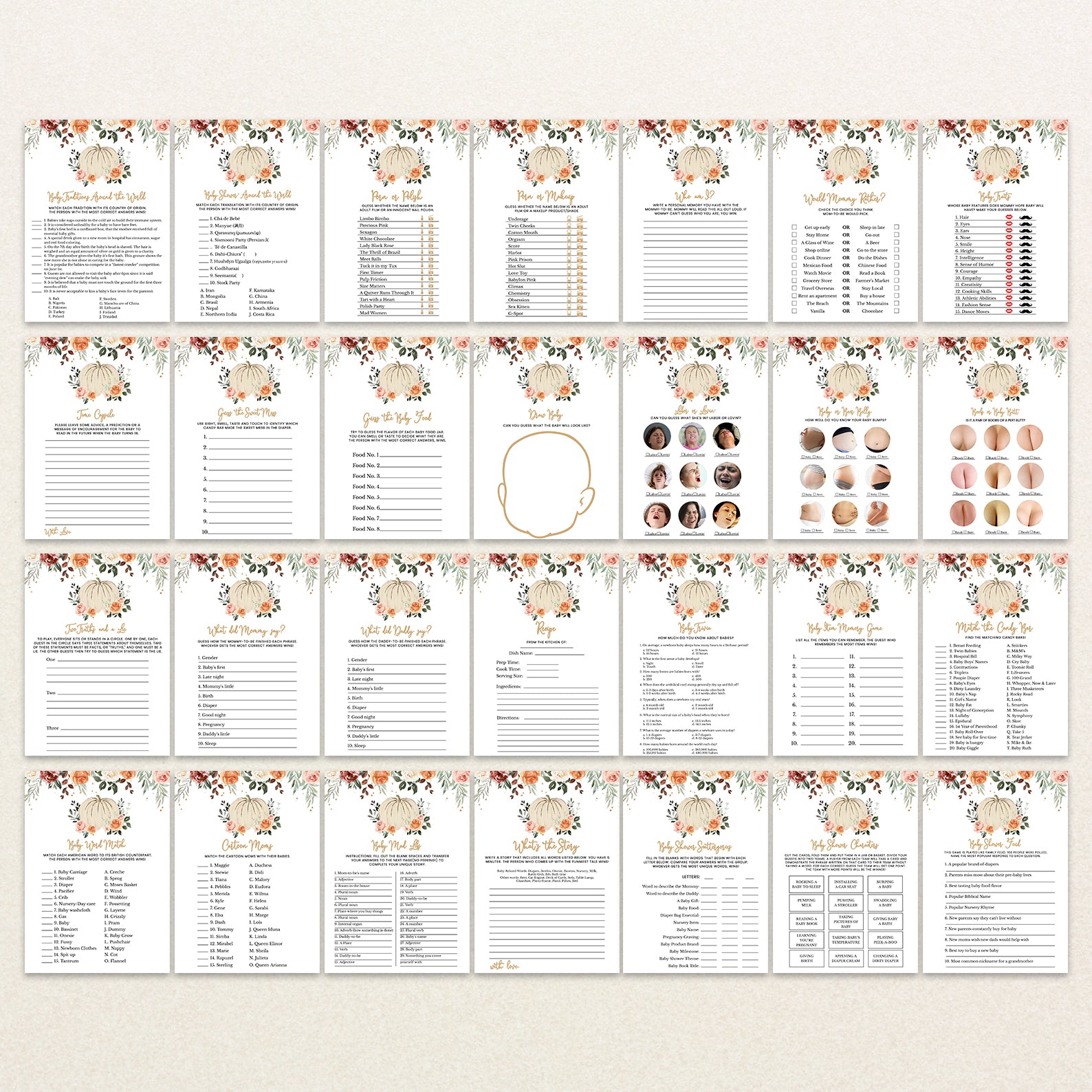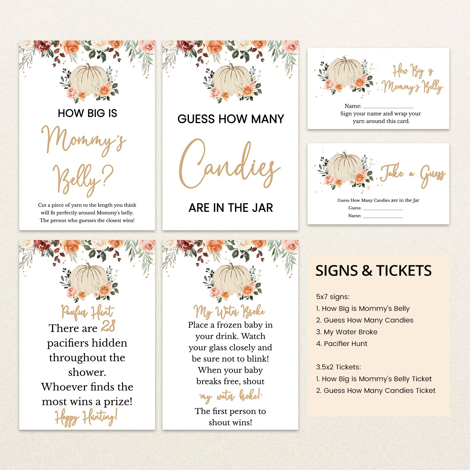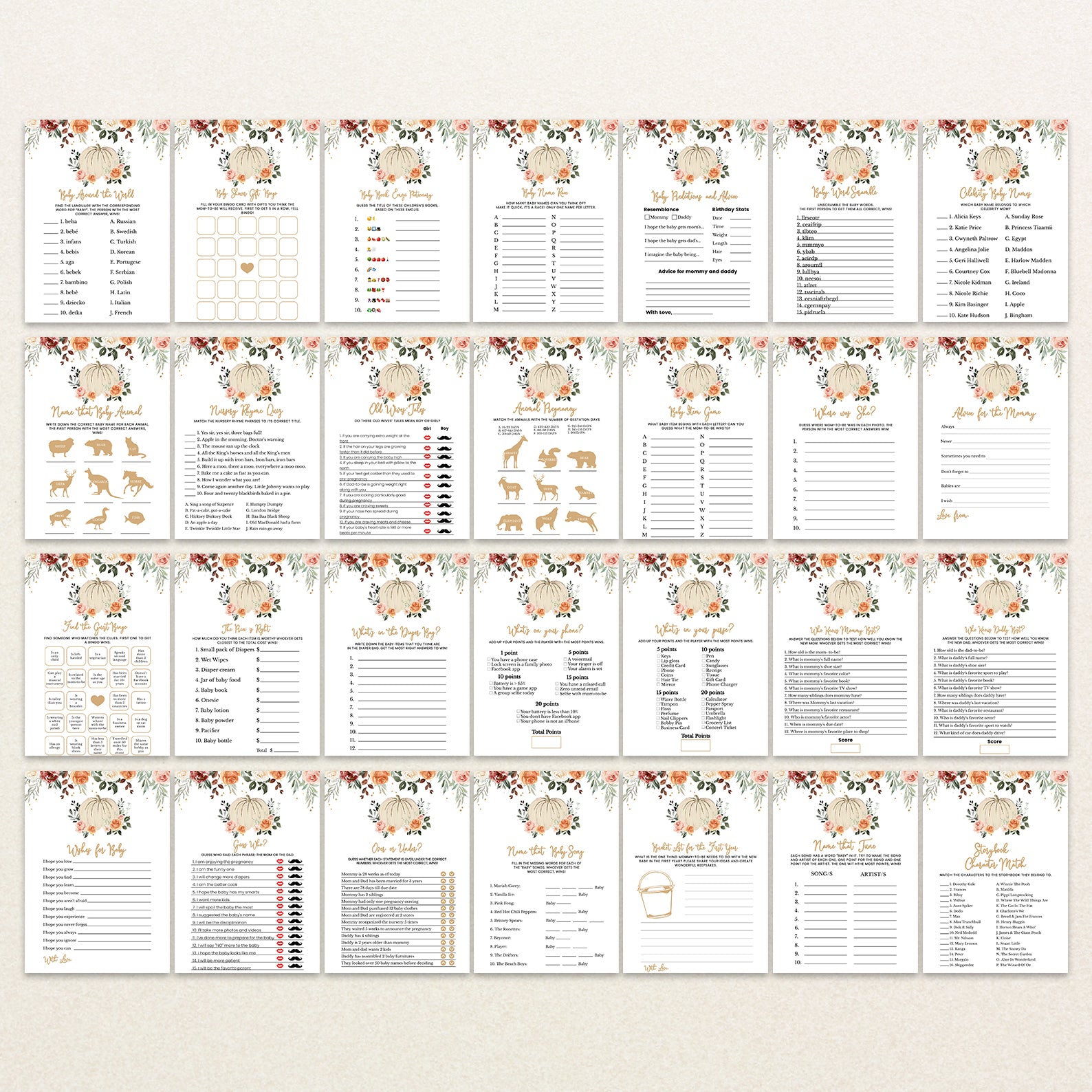 - Purchase this Fall Roses & Gold Accents Little Pumpkin Baby Shower Game Bundle template